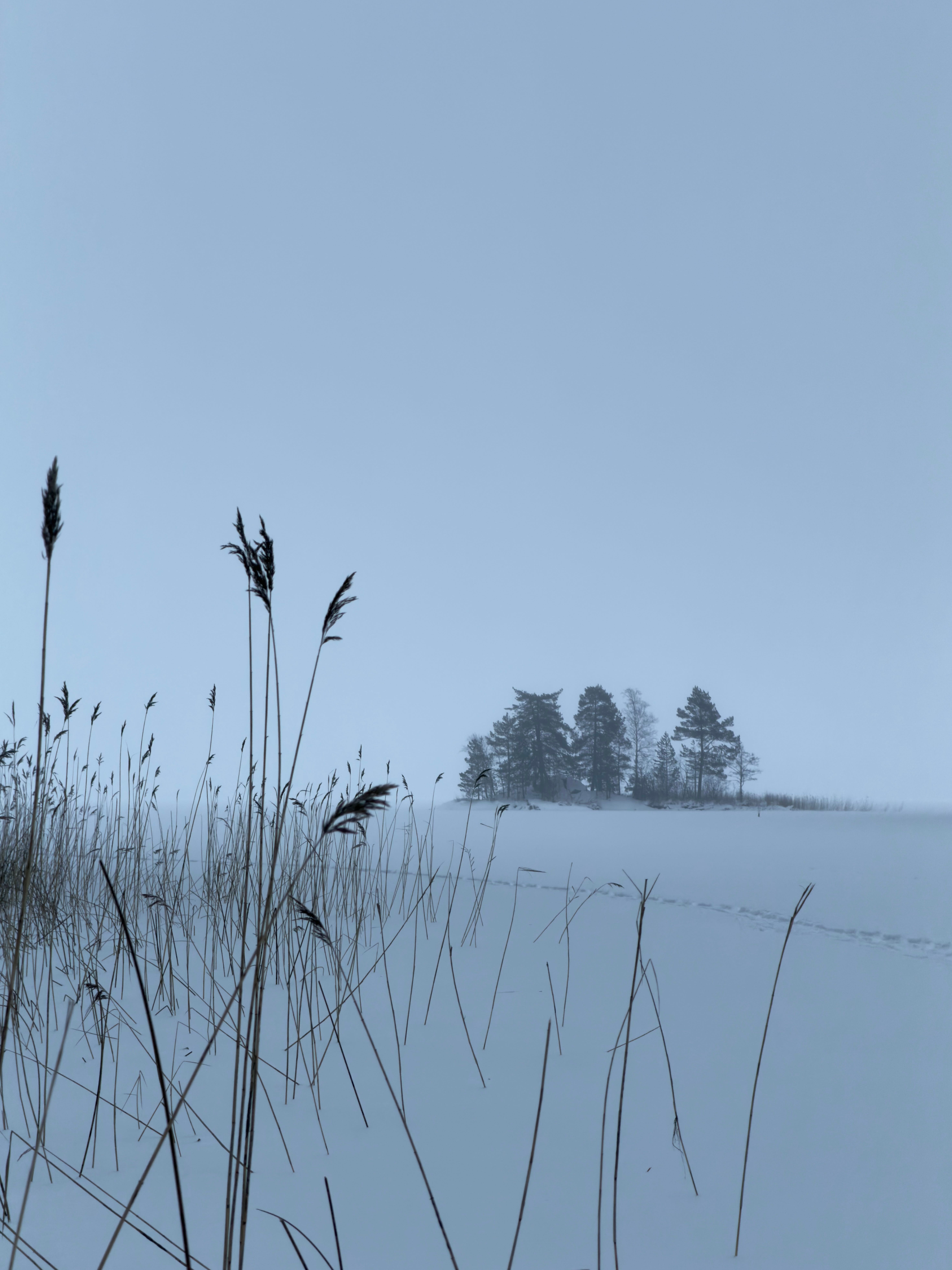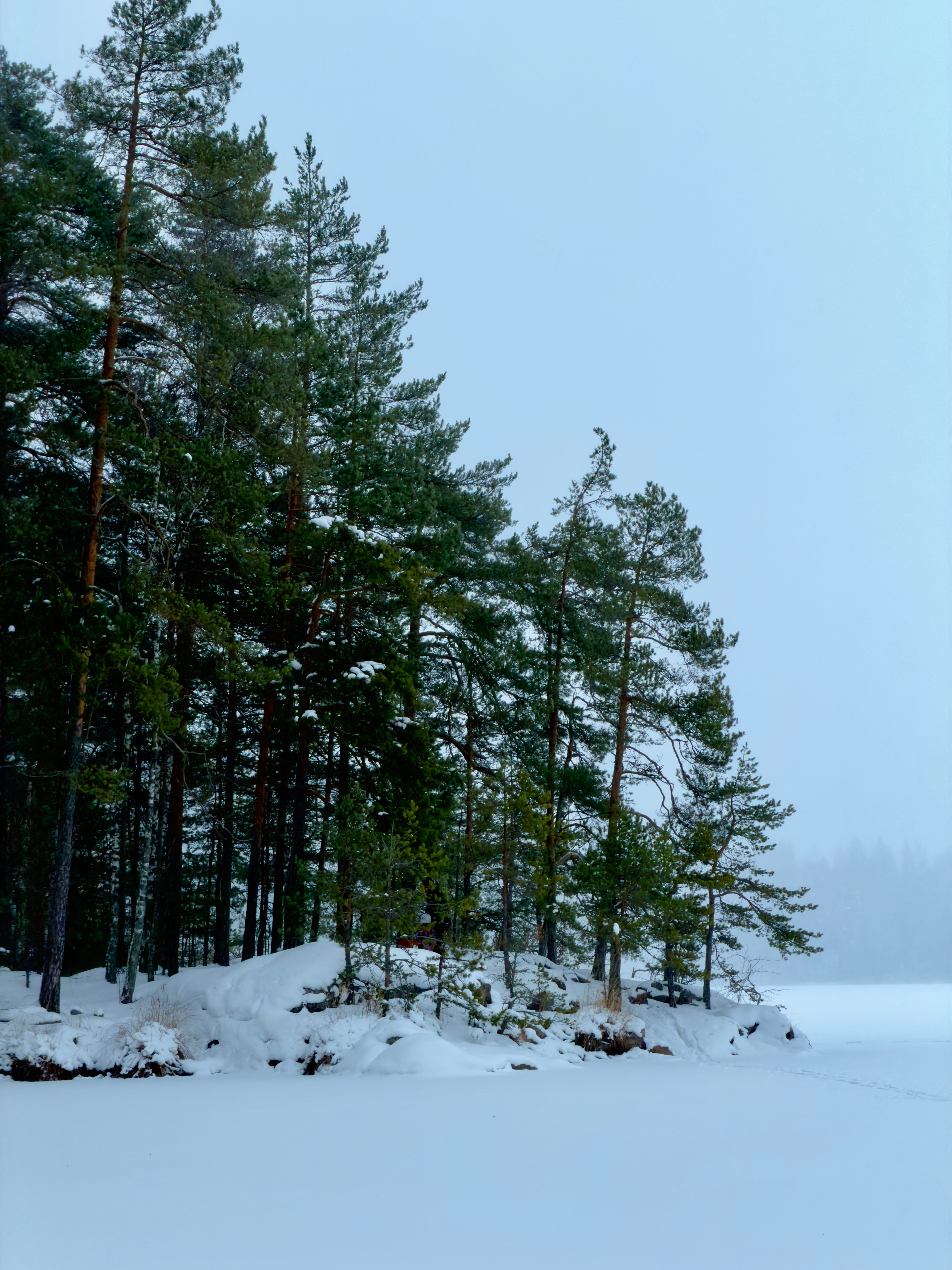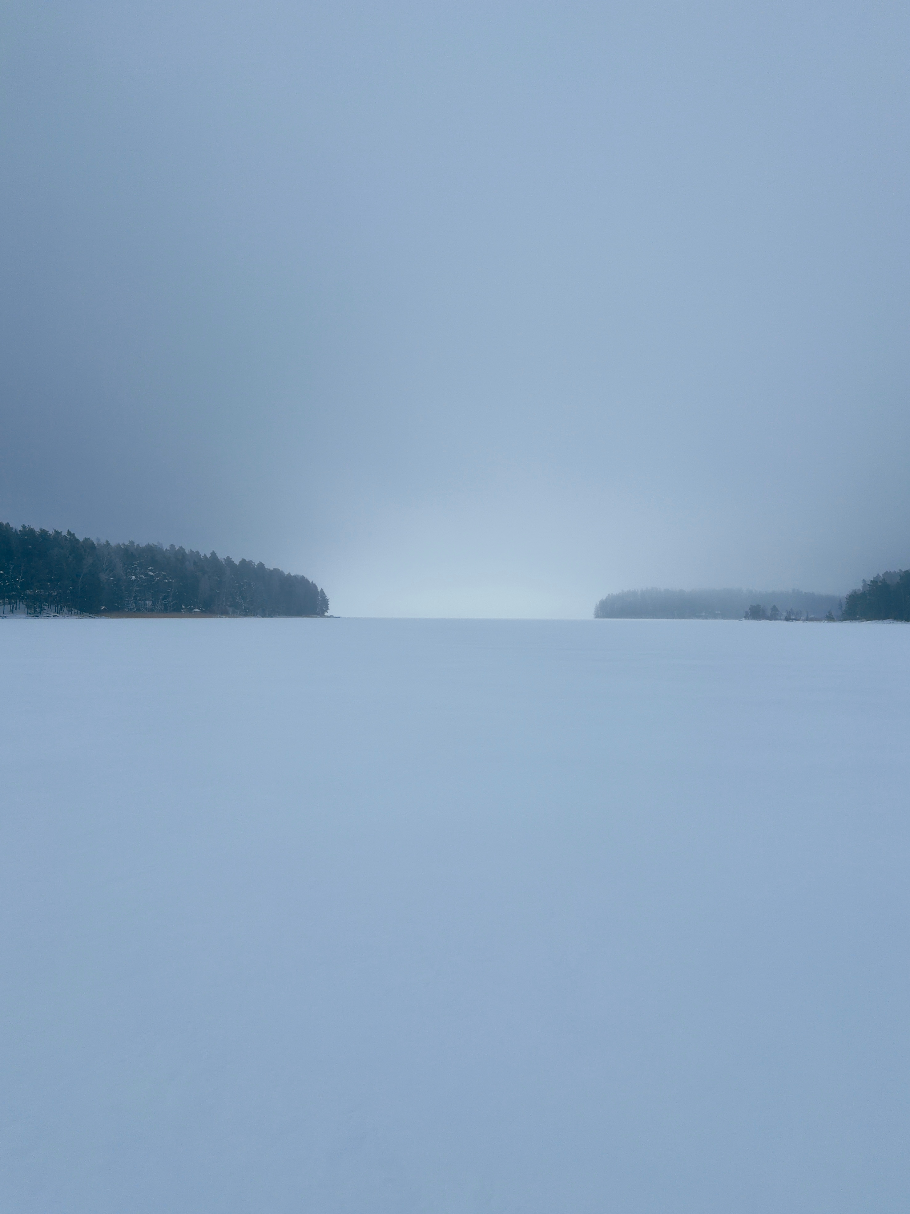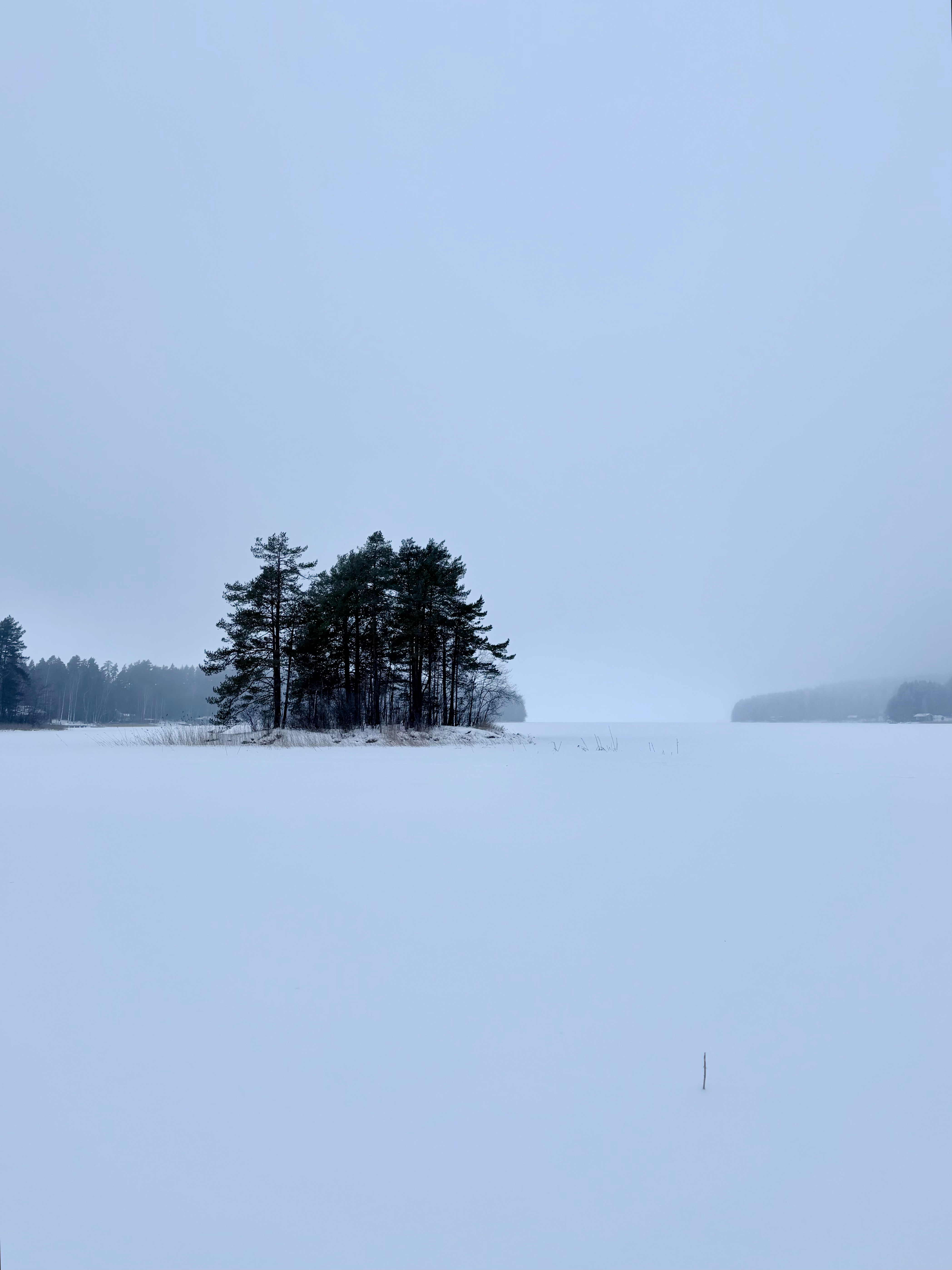 On the horizon, three rounded stretches of the mainland were visible. Each one was wrapped in fog to a different degree — the farthest barely visible, the middle one a little clearer, and the closest standing out the most. Taking pictures in this kind of weather was an experience of its own. The photos could be almost completely white, except for the dark outline of the shoreline.