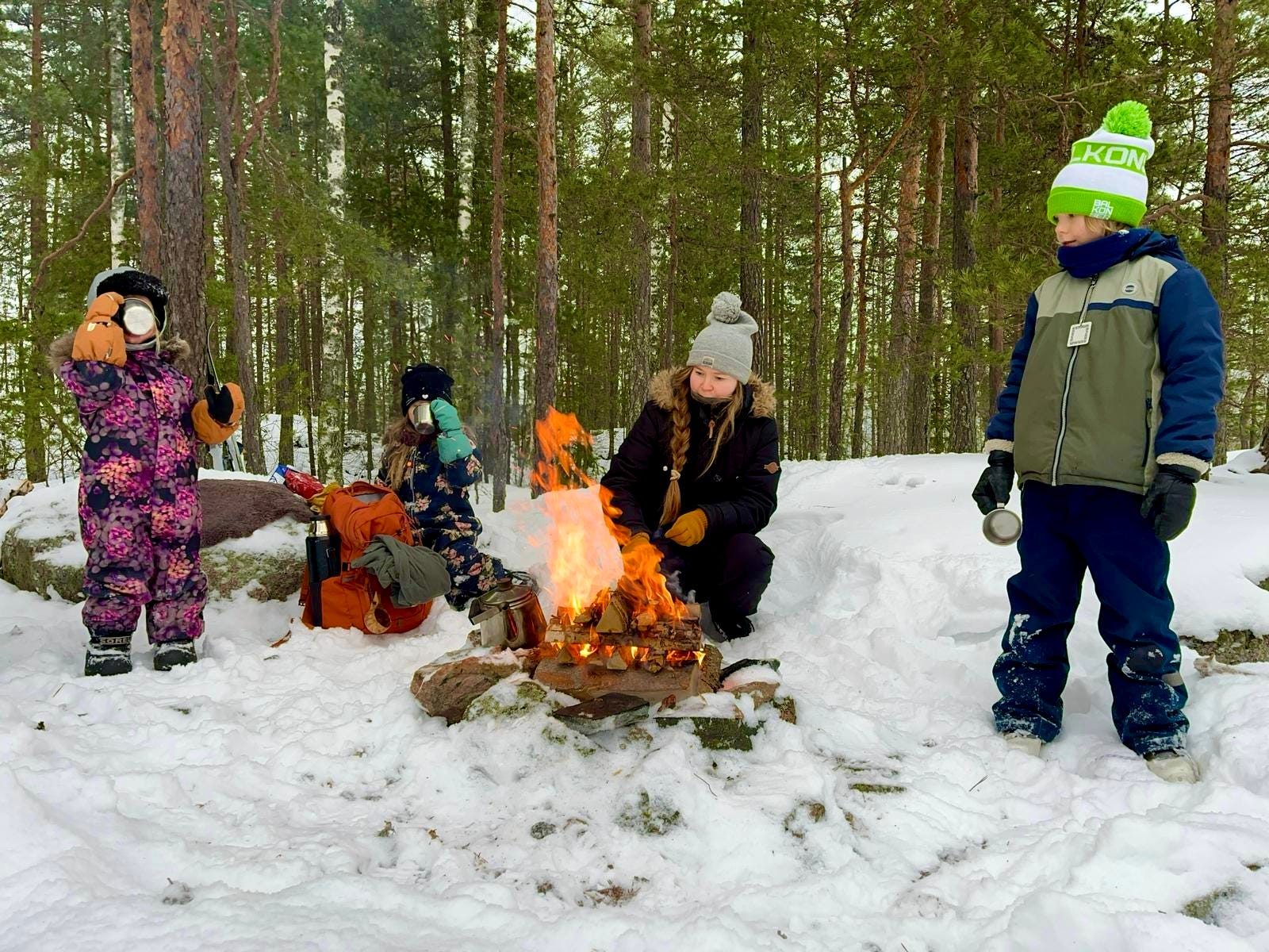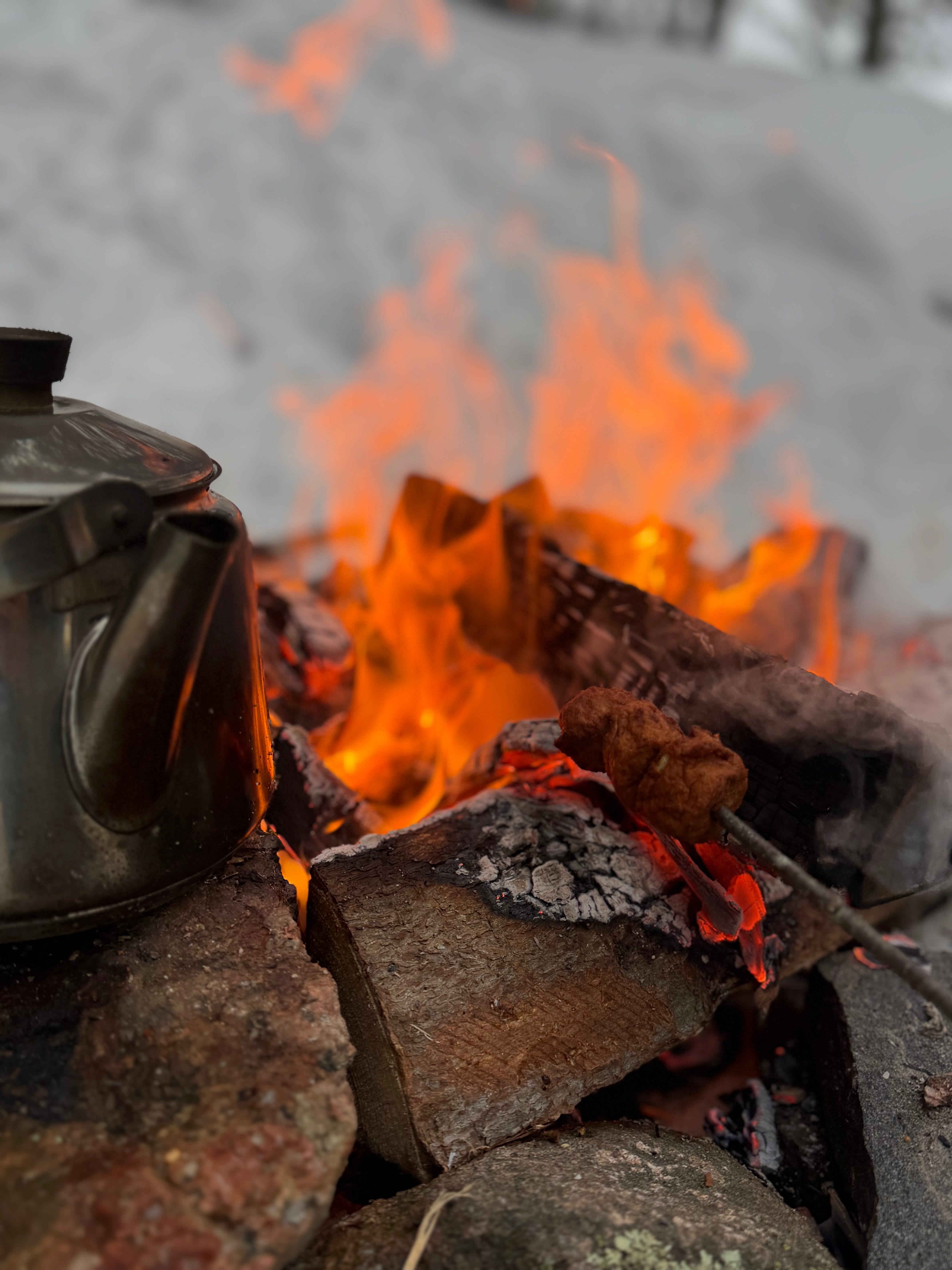 We had hot chocolate (of course, it’s a must for a winter ski trip!), meatballs, Karelian pasties and cinnamon rolls. We made cowboy coffee, which is made with just water, coffee, and a coffee pot over a campfire. You can start it as soon as the fire is lit, even directly on the burning logs or you can hang it with a thick stick.