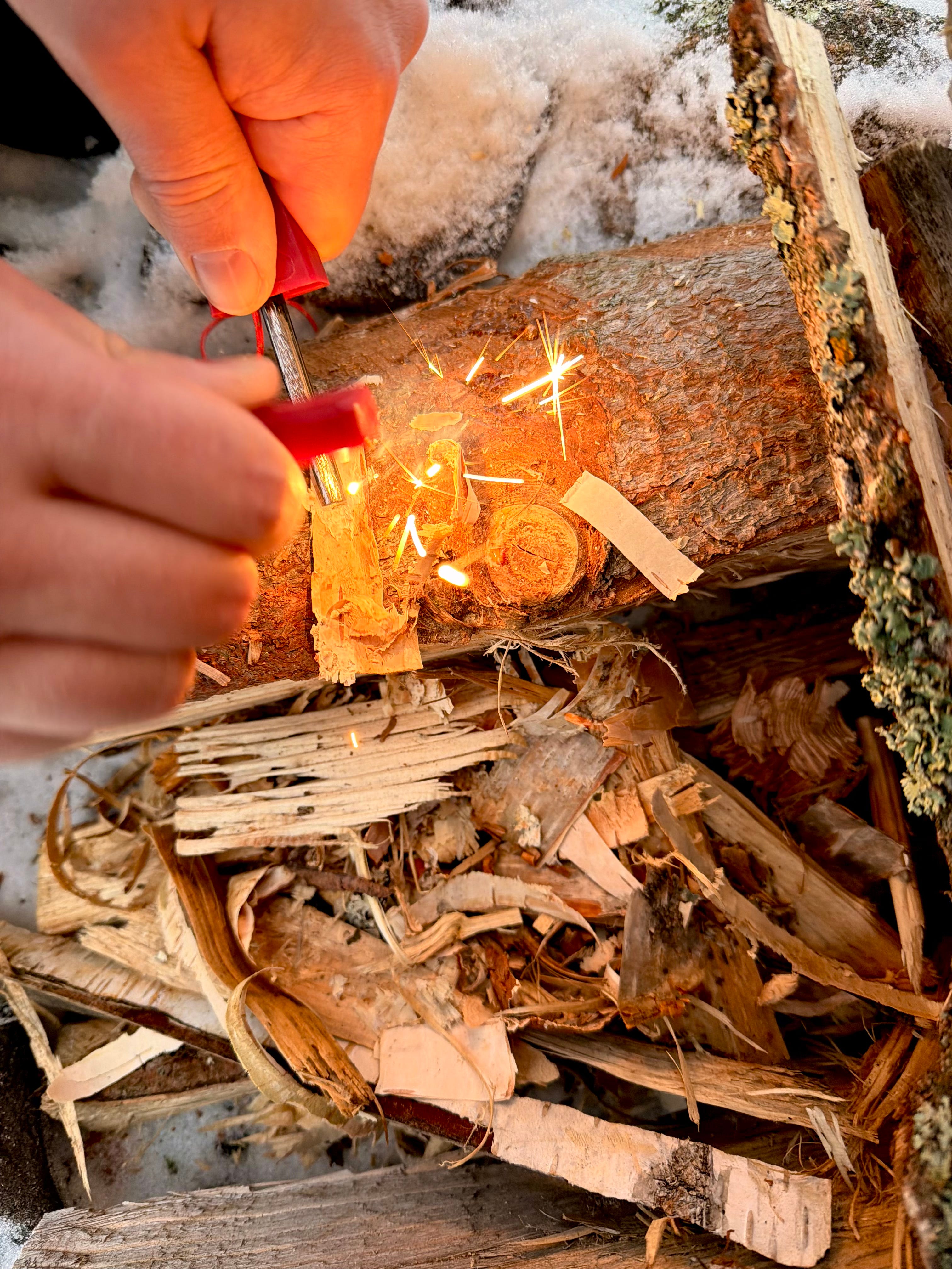 We reached the fire pit on Mother’s Day Island. We climbed from the ice onto the land, and my partner immediately started building a fire. The fire spot is simple, just a few stones around it. The kids watched with curiosity as he used a fire steel to start the fire.