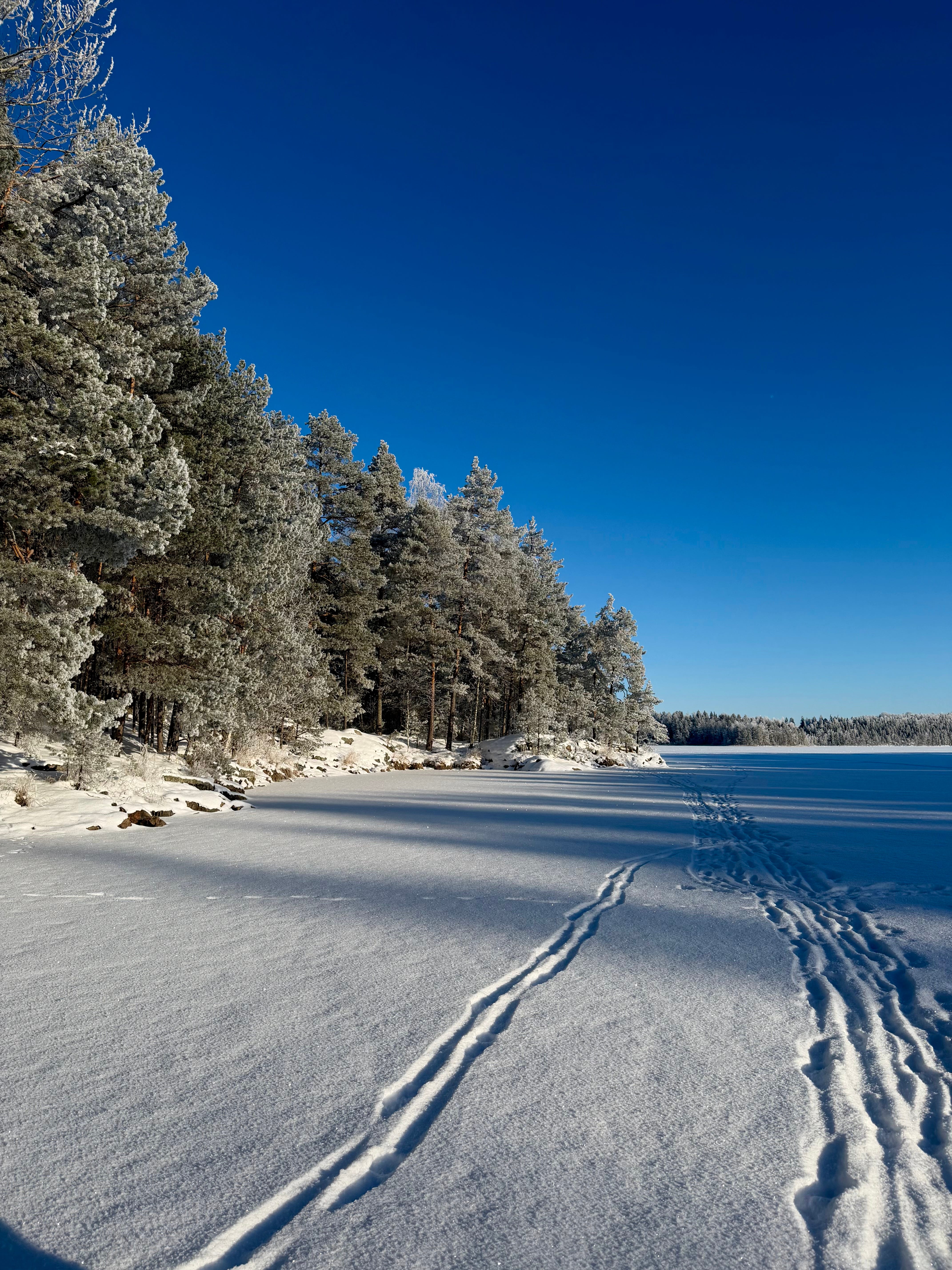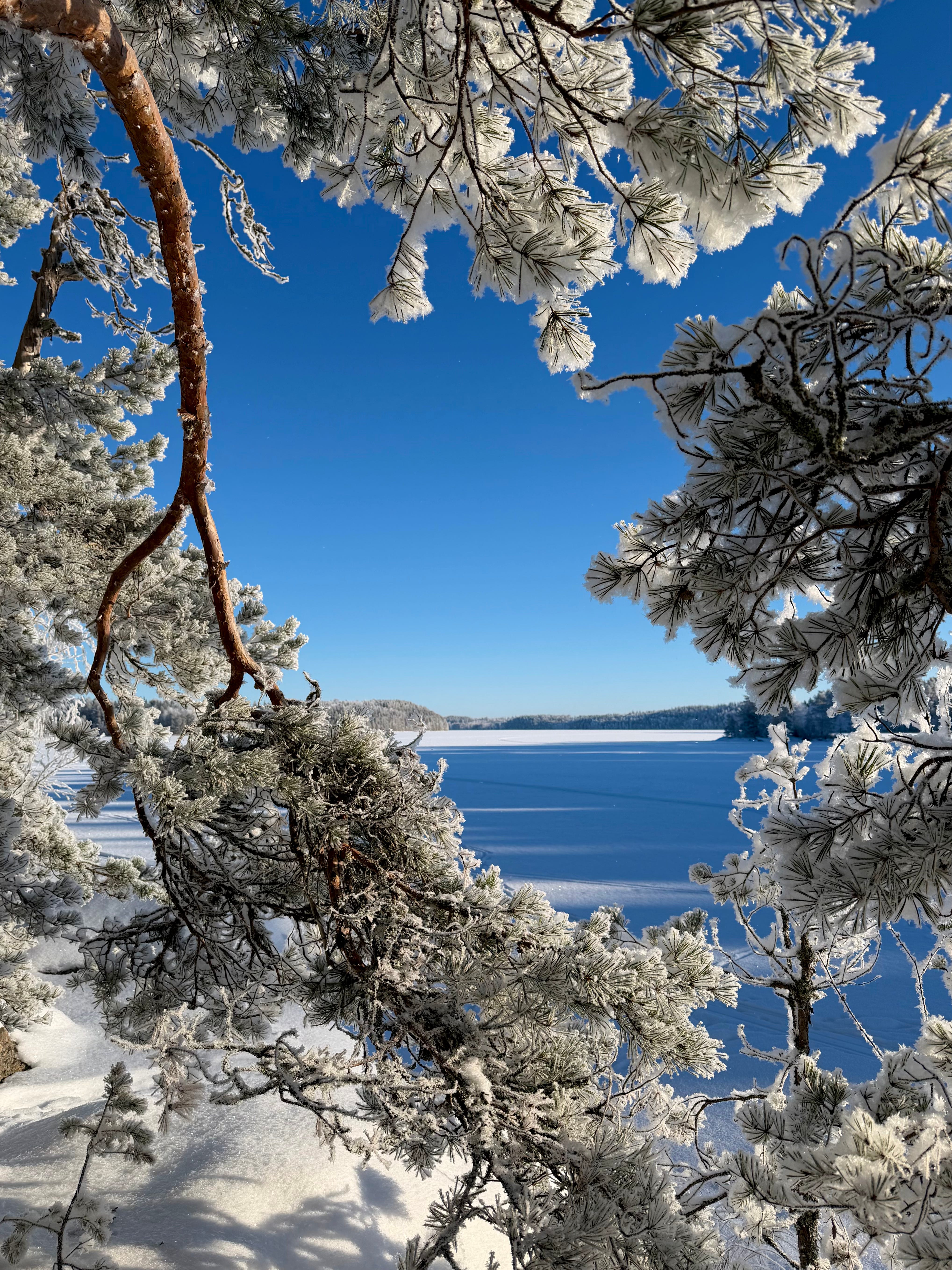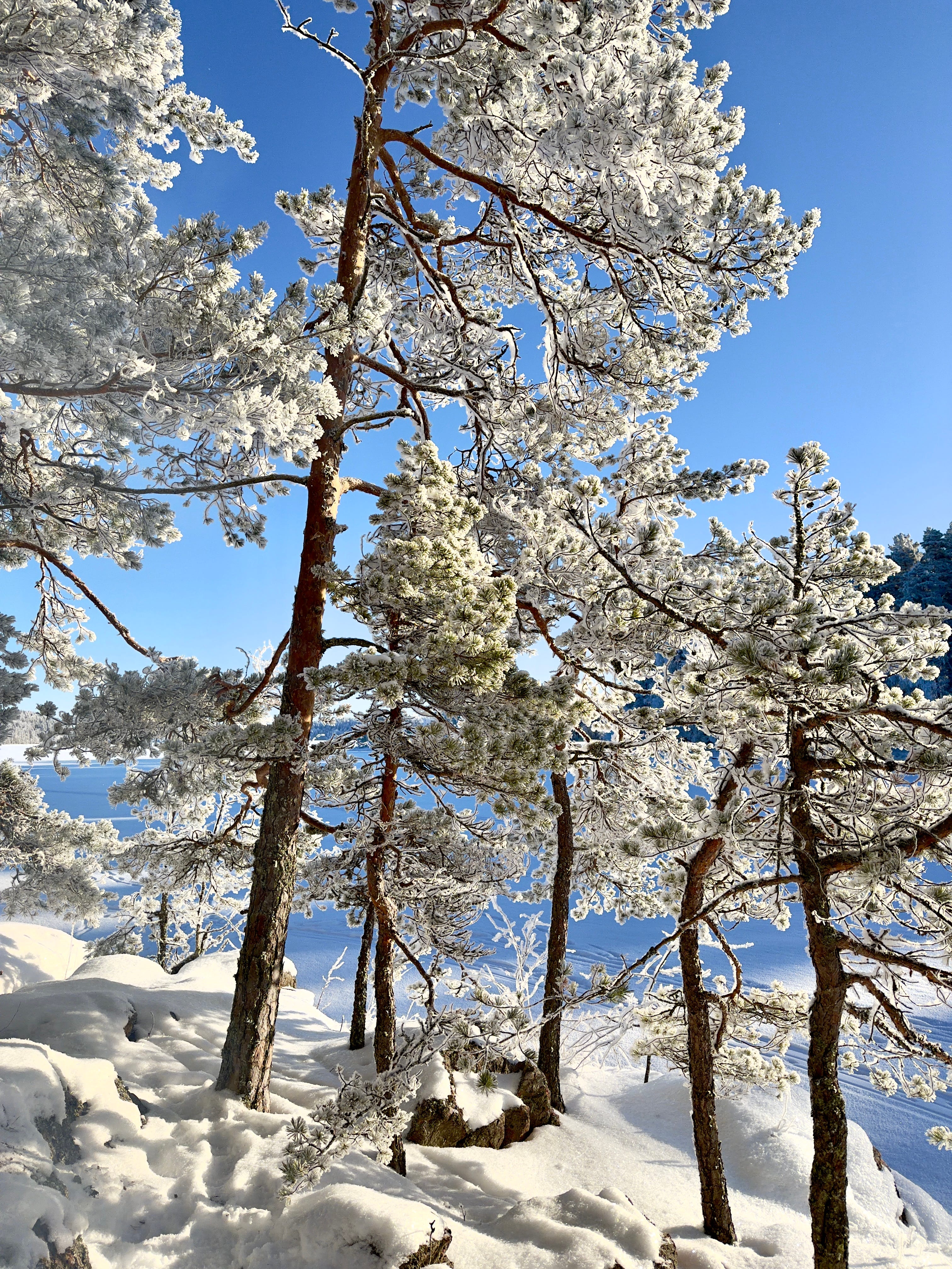 We set off from the cottage and walked across the ice. The sky was an unreal, bright blue. The frost was sharp, and the sun was shining from a completely cloudless sky. The trees were covered with a layer of snow, which made the landscape truly beautiful.