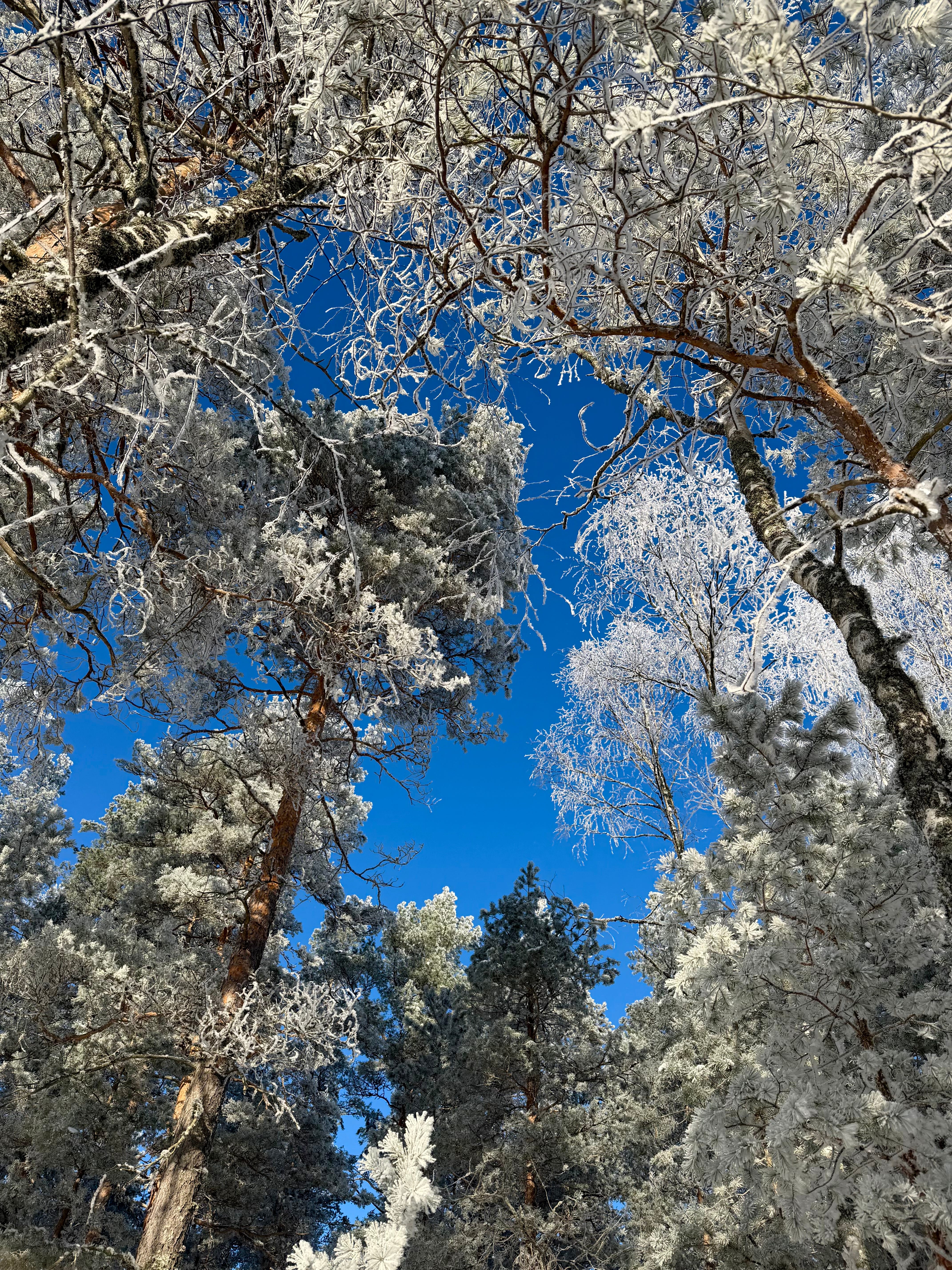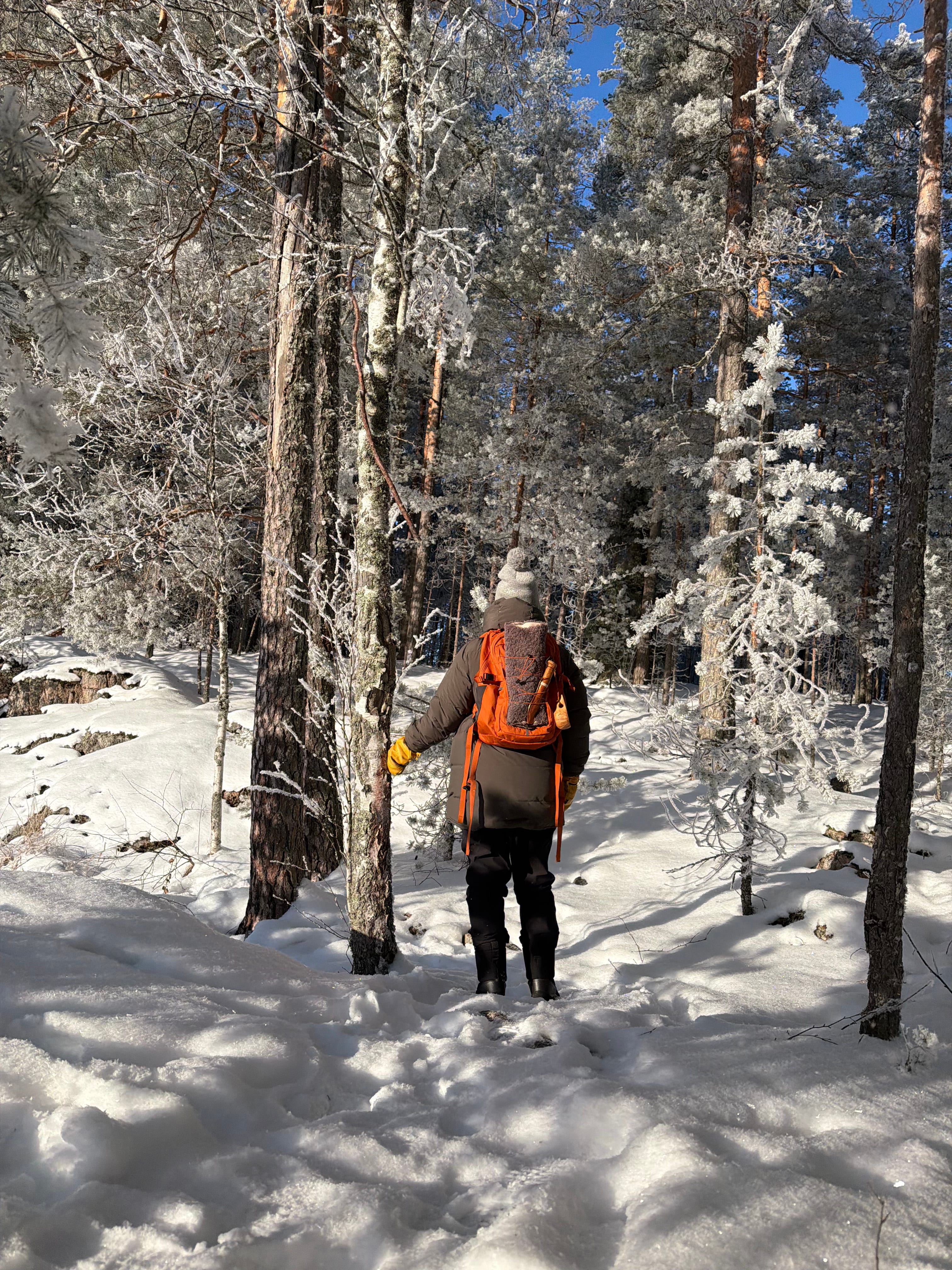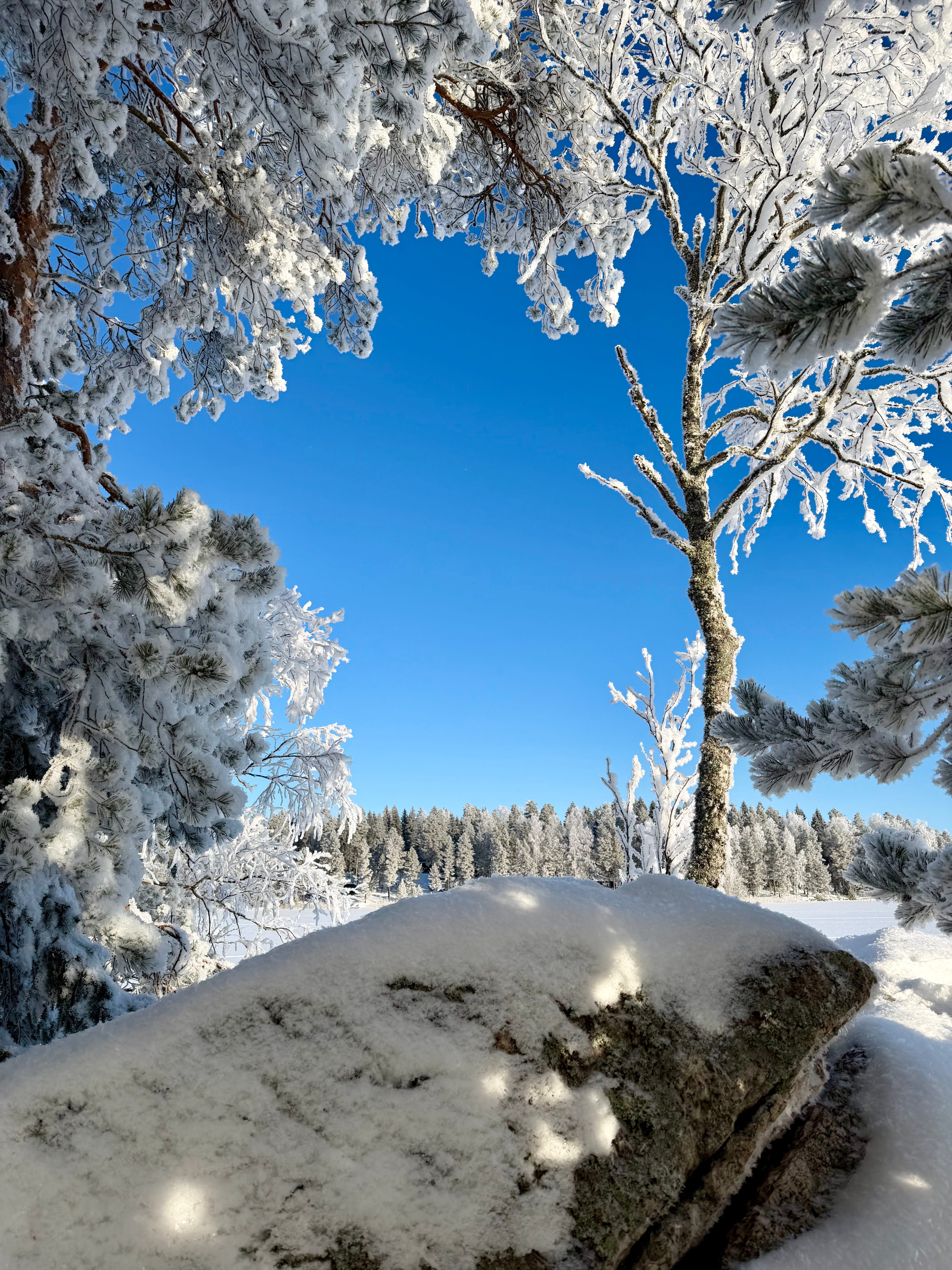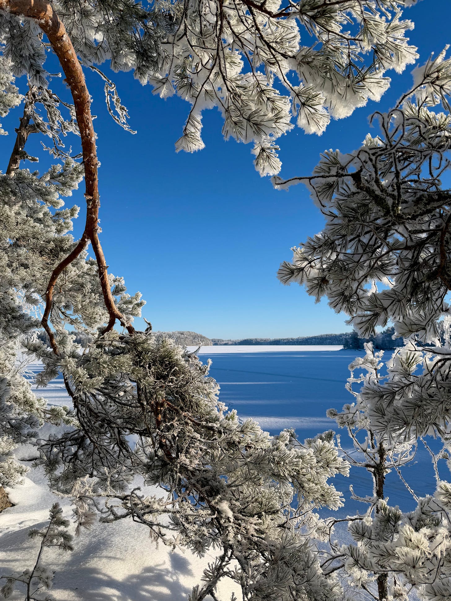 We set off from the cottage and walked across the ice. The sky was an unreal, bright blue. The frost was sharp, and the sun was shining from a completely cloudless sky. The trees were covered with a layer of snow, which made the landscape truly beautiful.