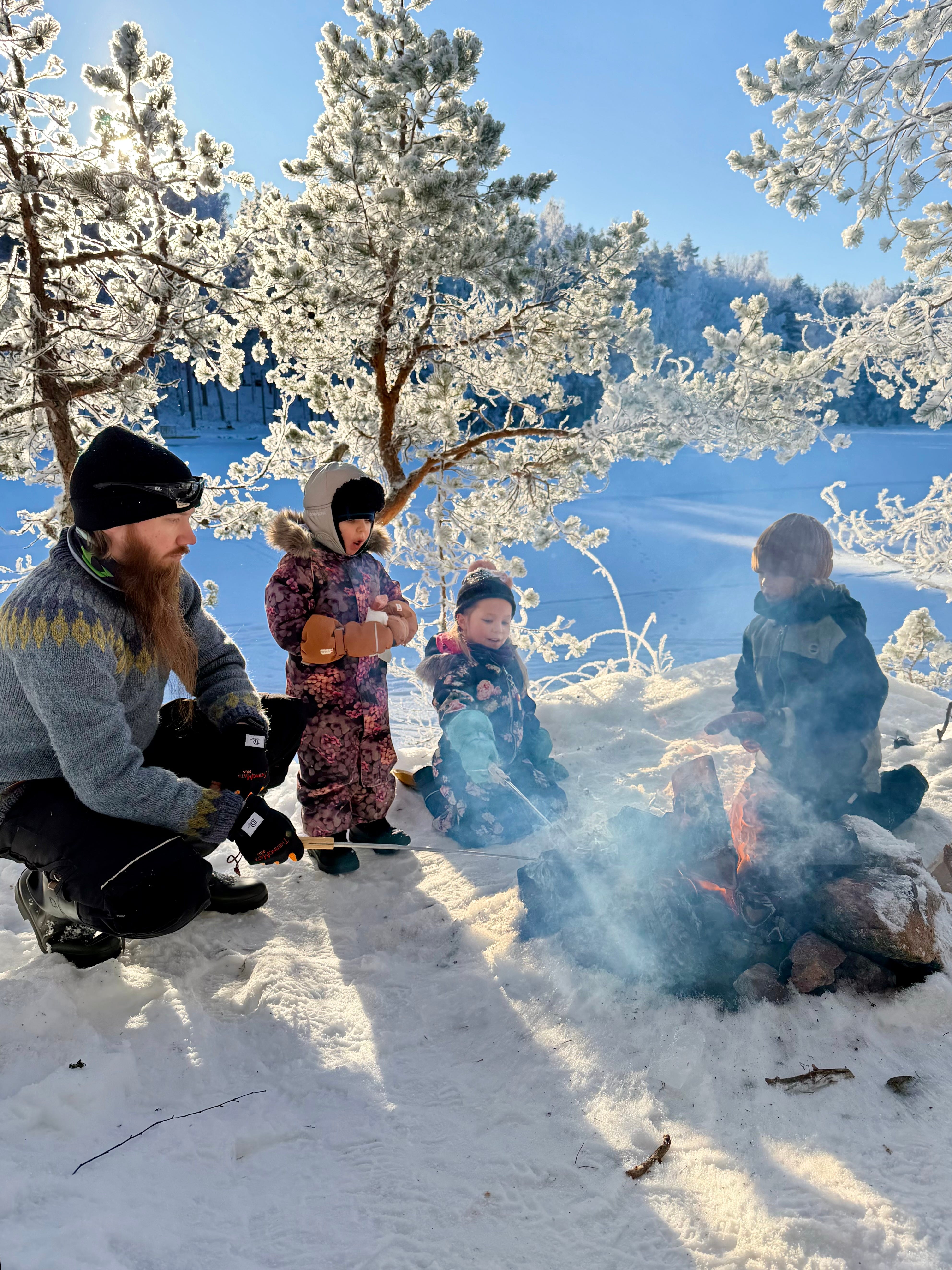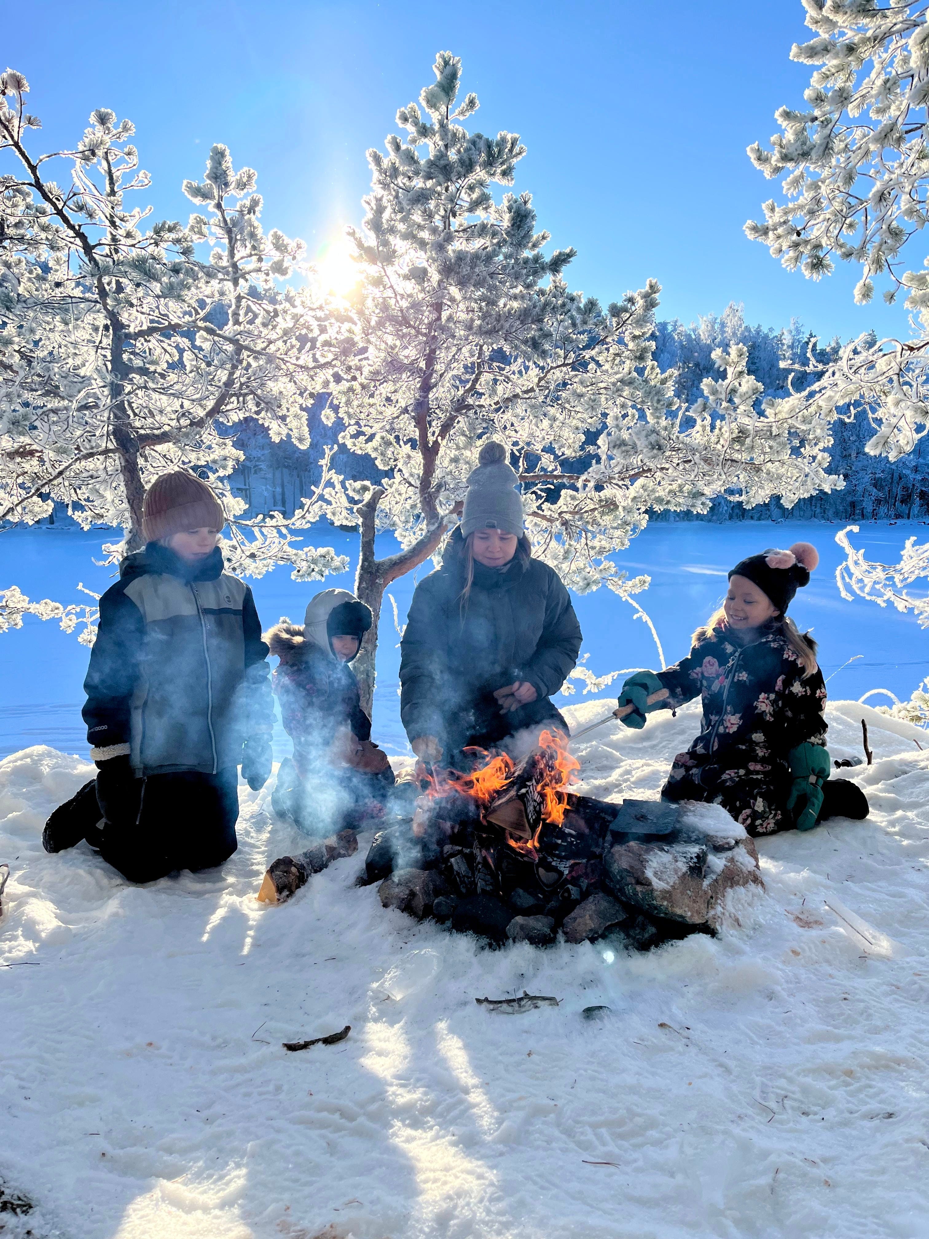 We grilled some food and made hot chocolate and coffee. Despite the strong frost, no one felt cold.