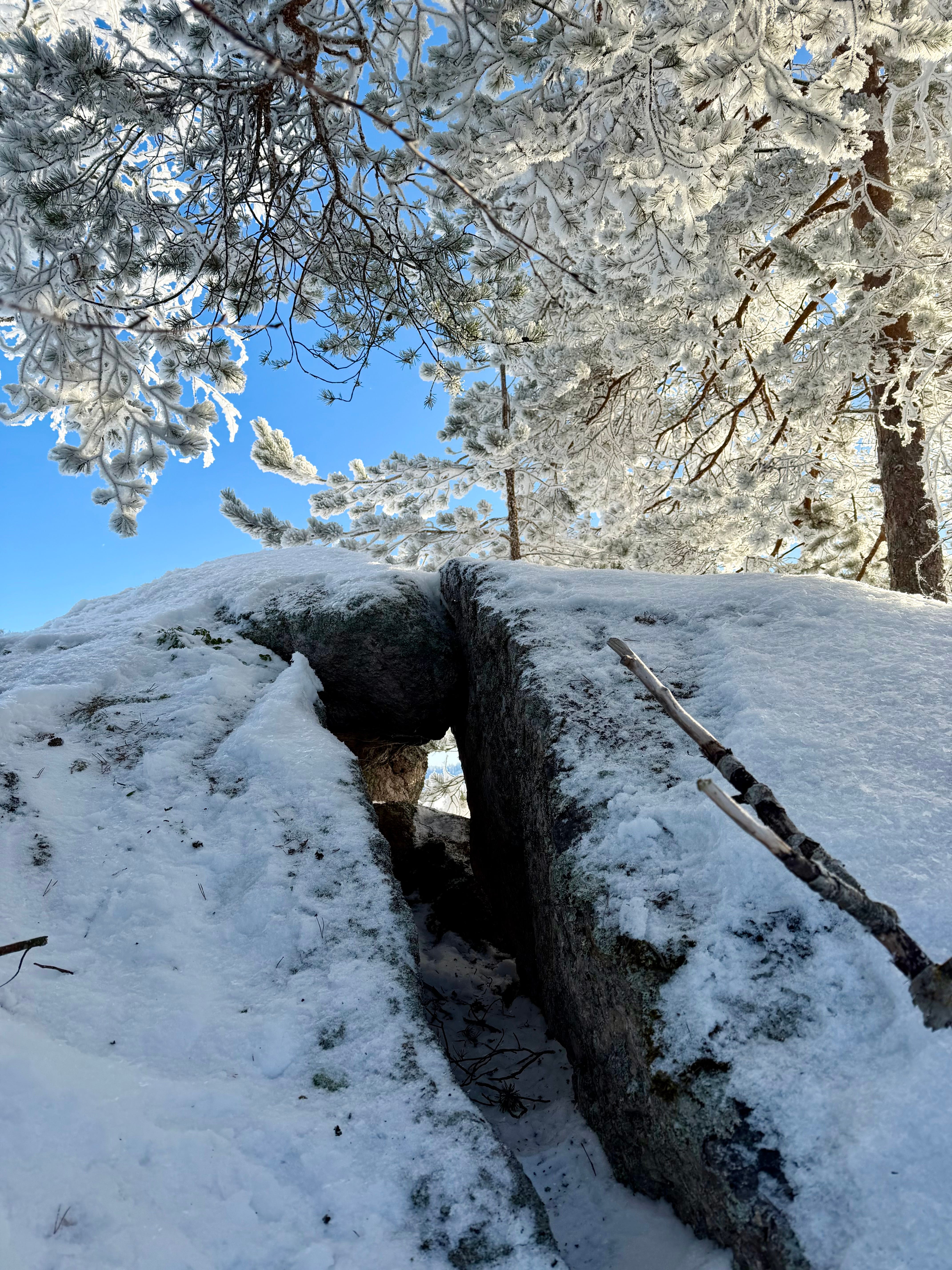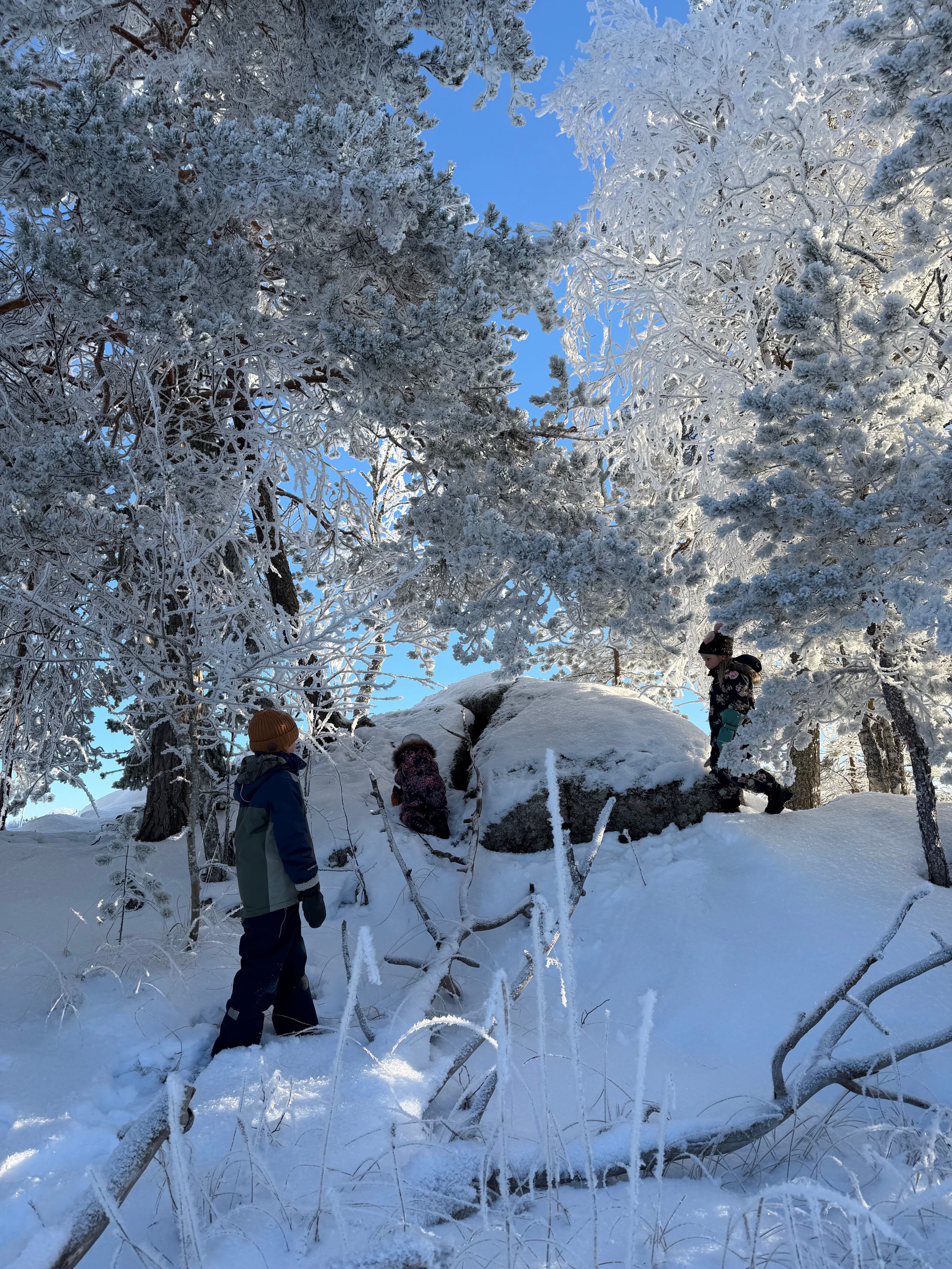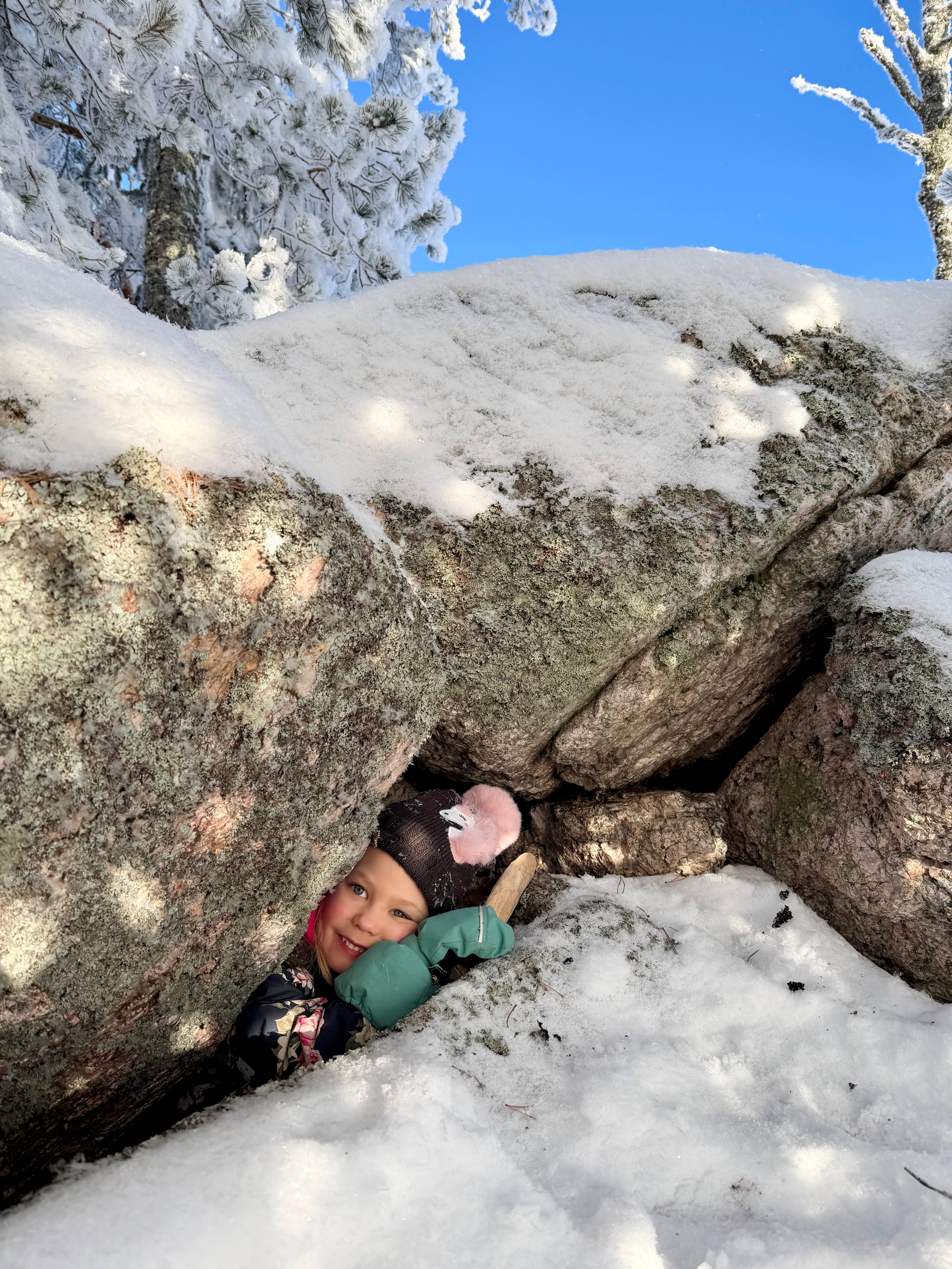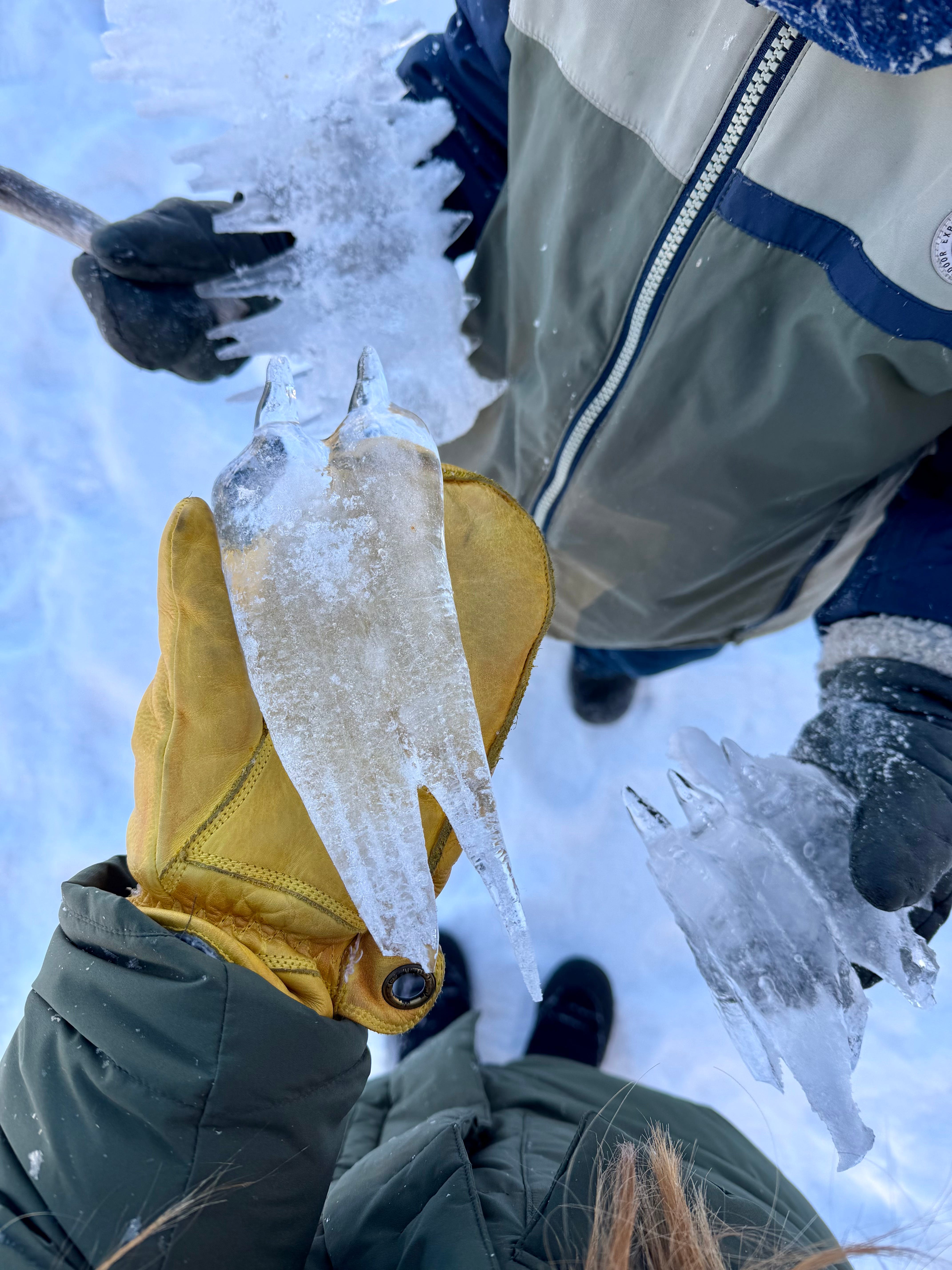 There were beautiful icicles under the shoreline rocks, which they collected and played with. They also crawled through the rock window several times. The atmosphere felt very unreal because the world looked so unusual — as if we had landed on a strange new planet.