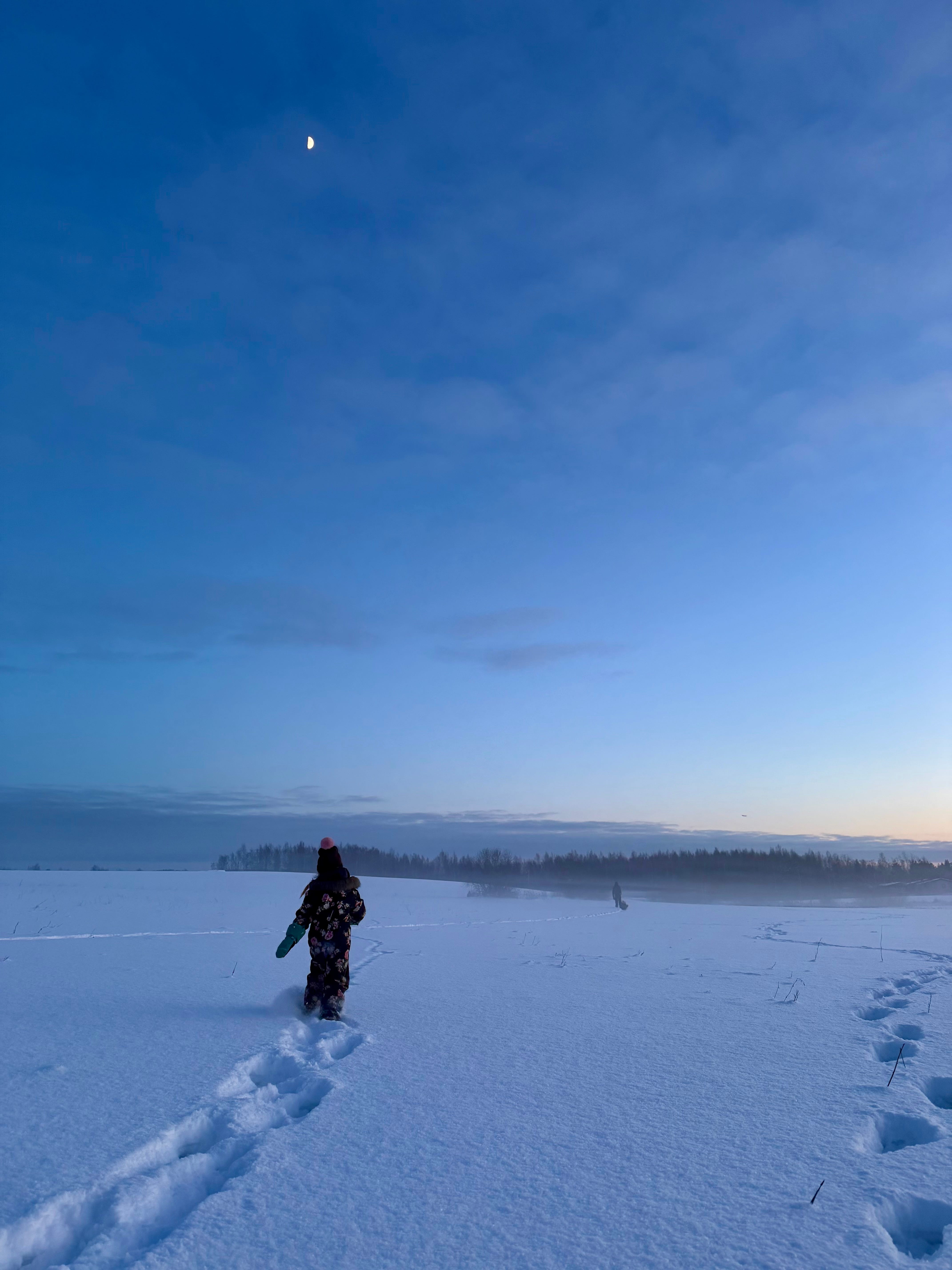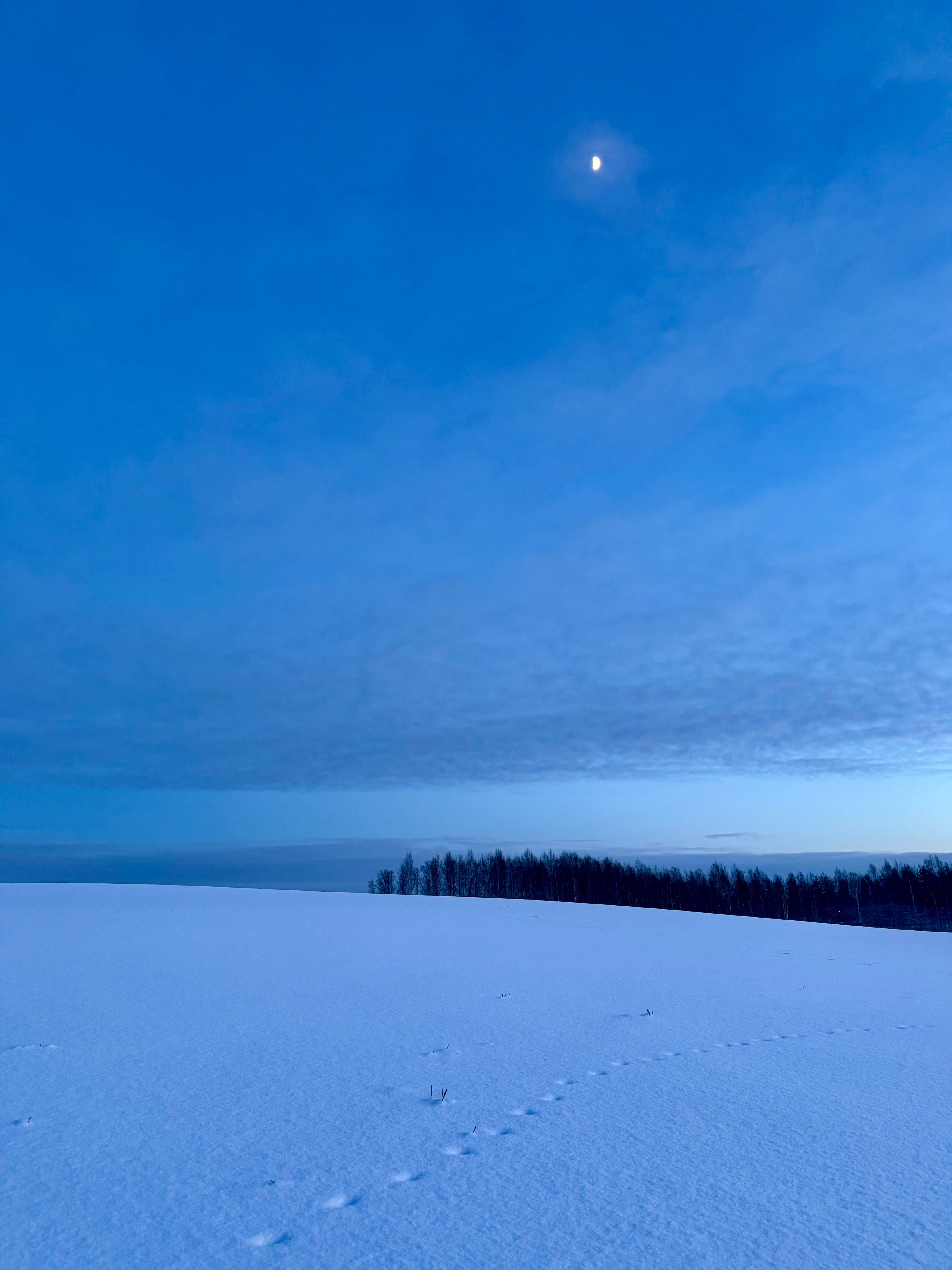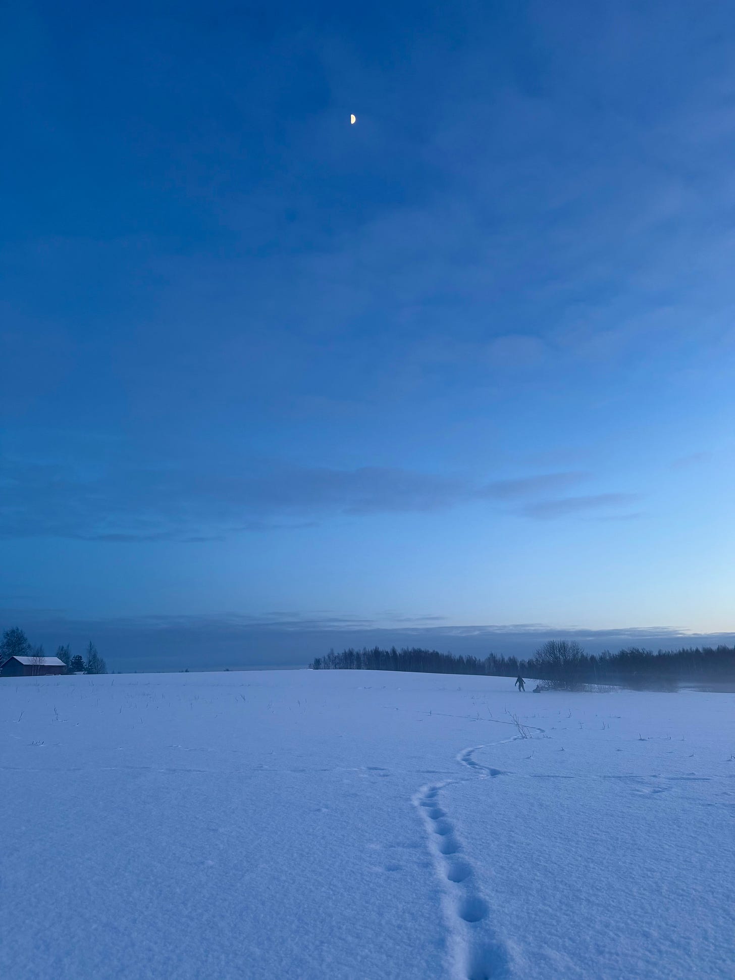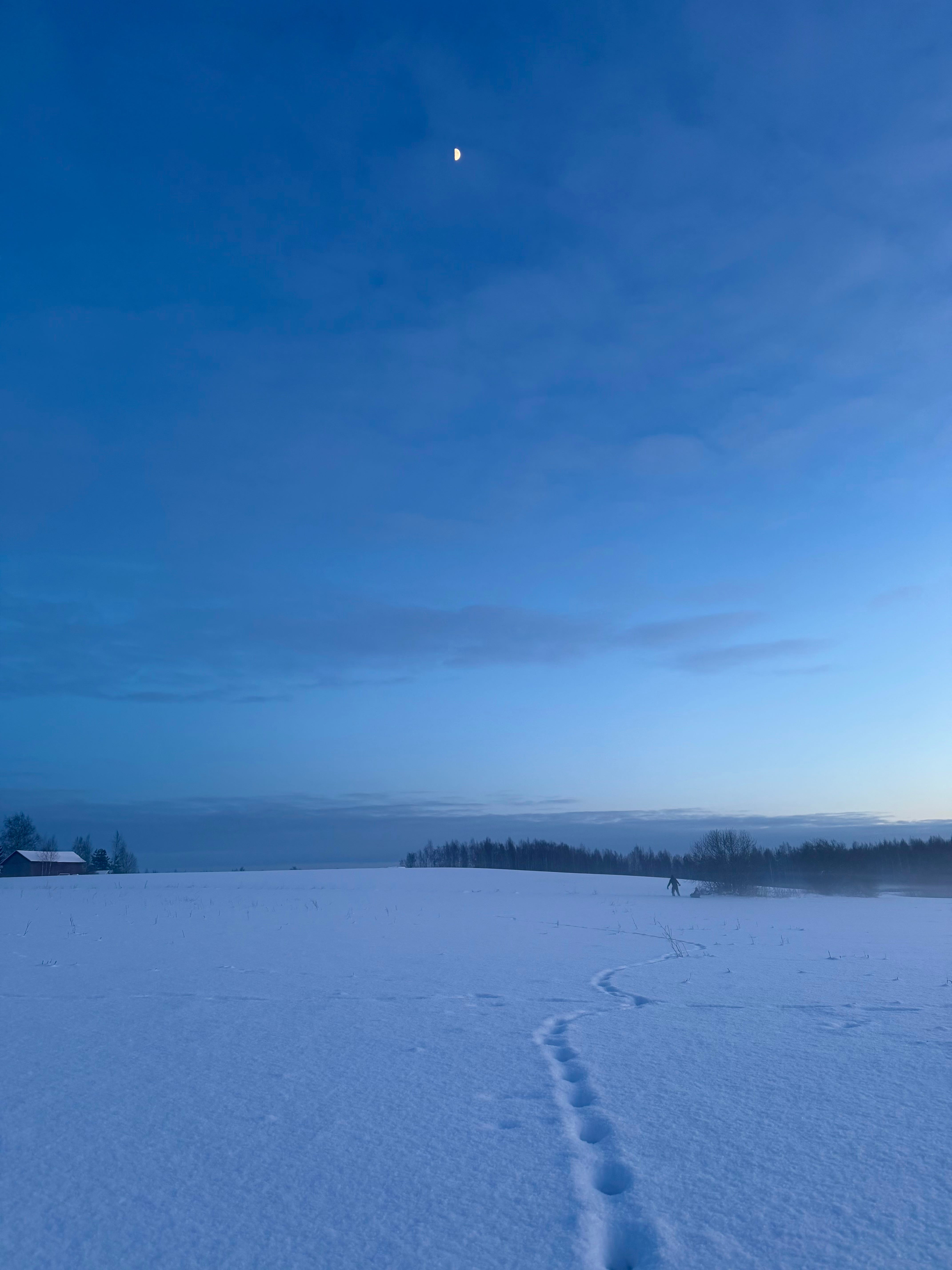 Behind us remained silence, and our traces in the snow. The footprints led home. The blue hour began. The moon stayed.