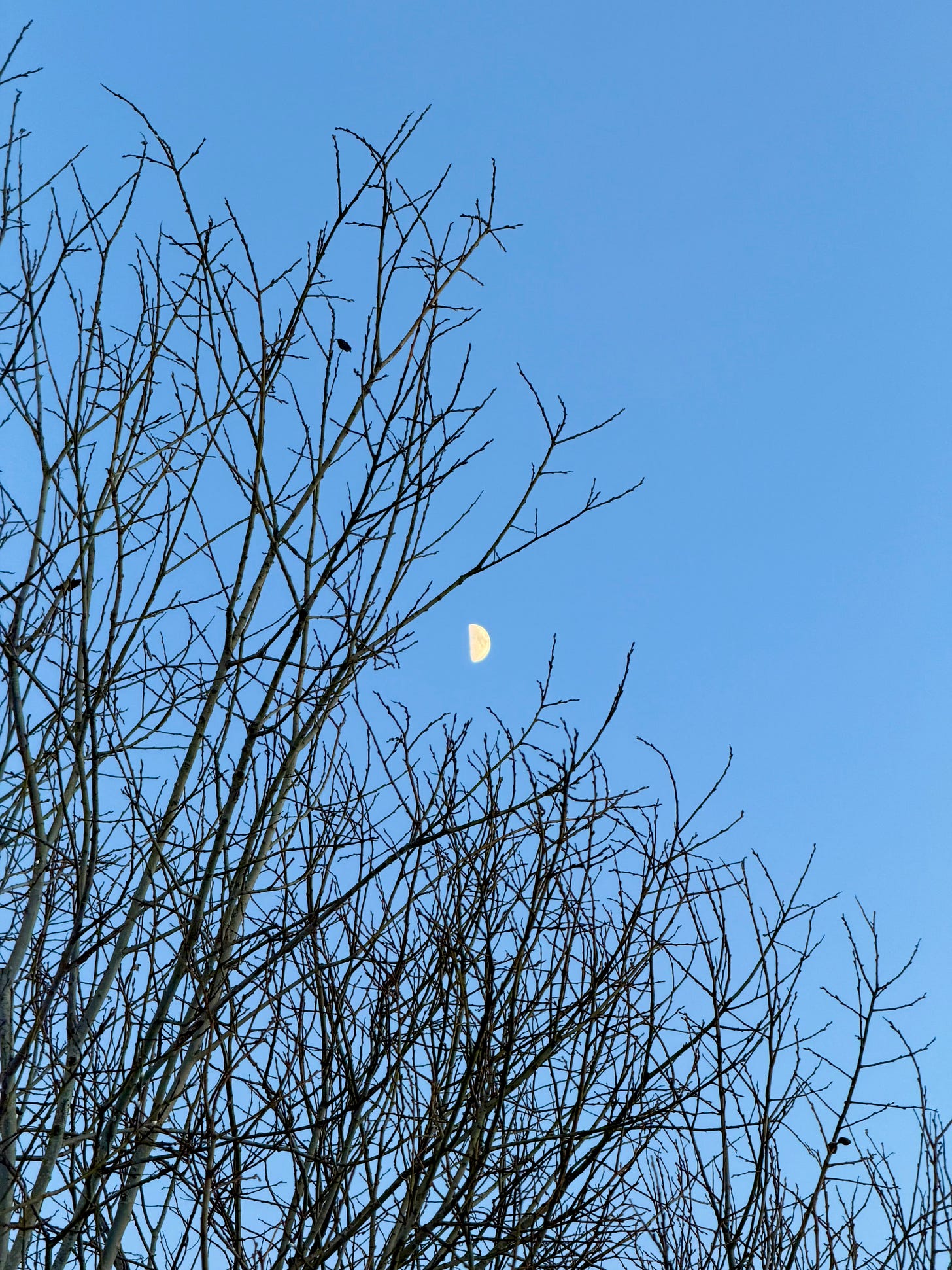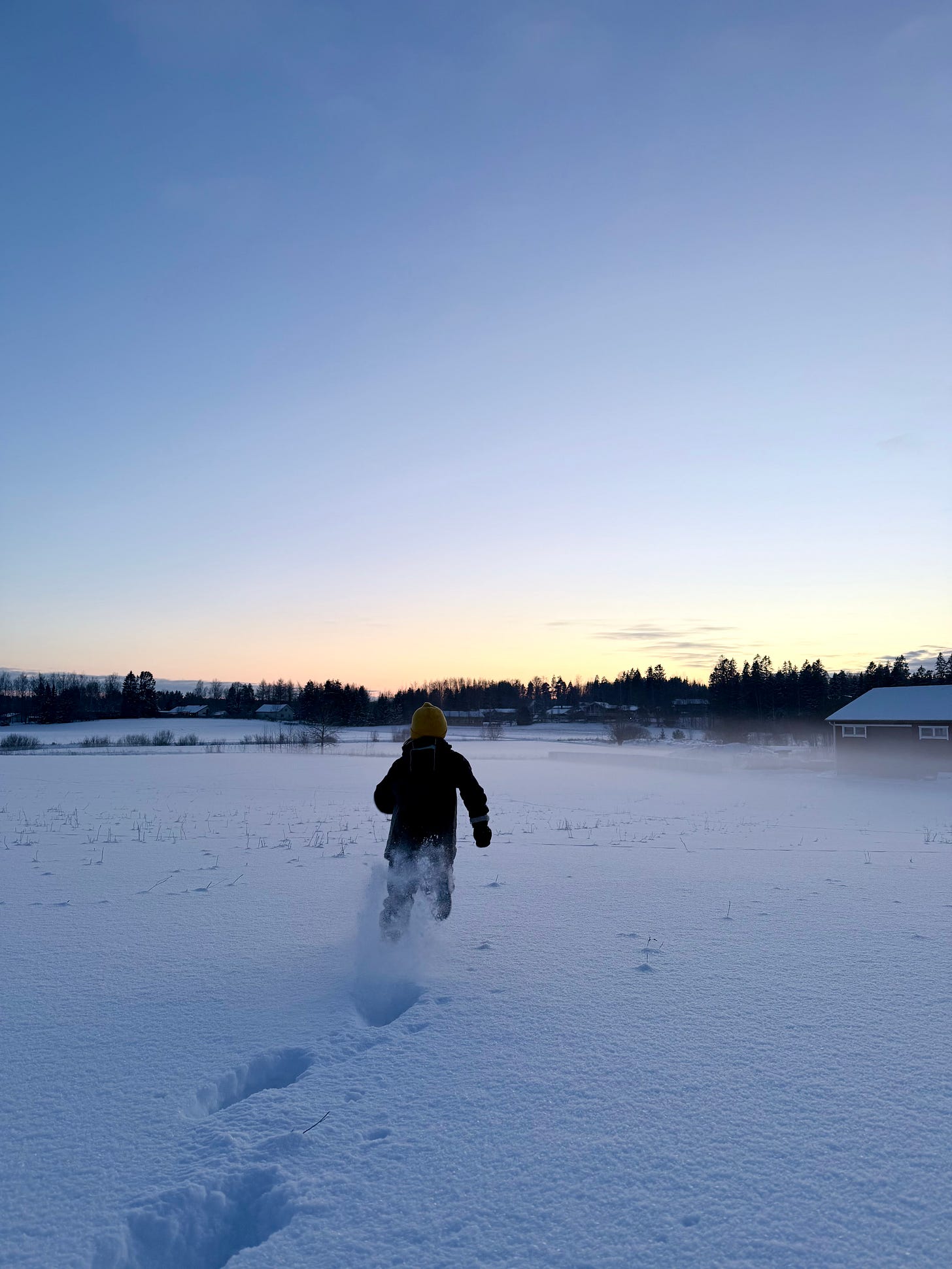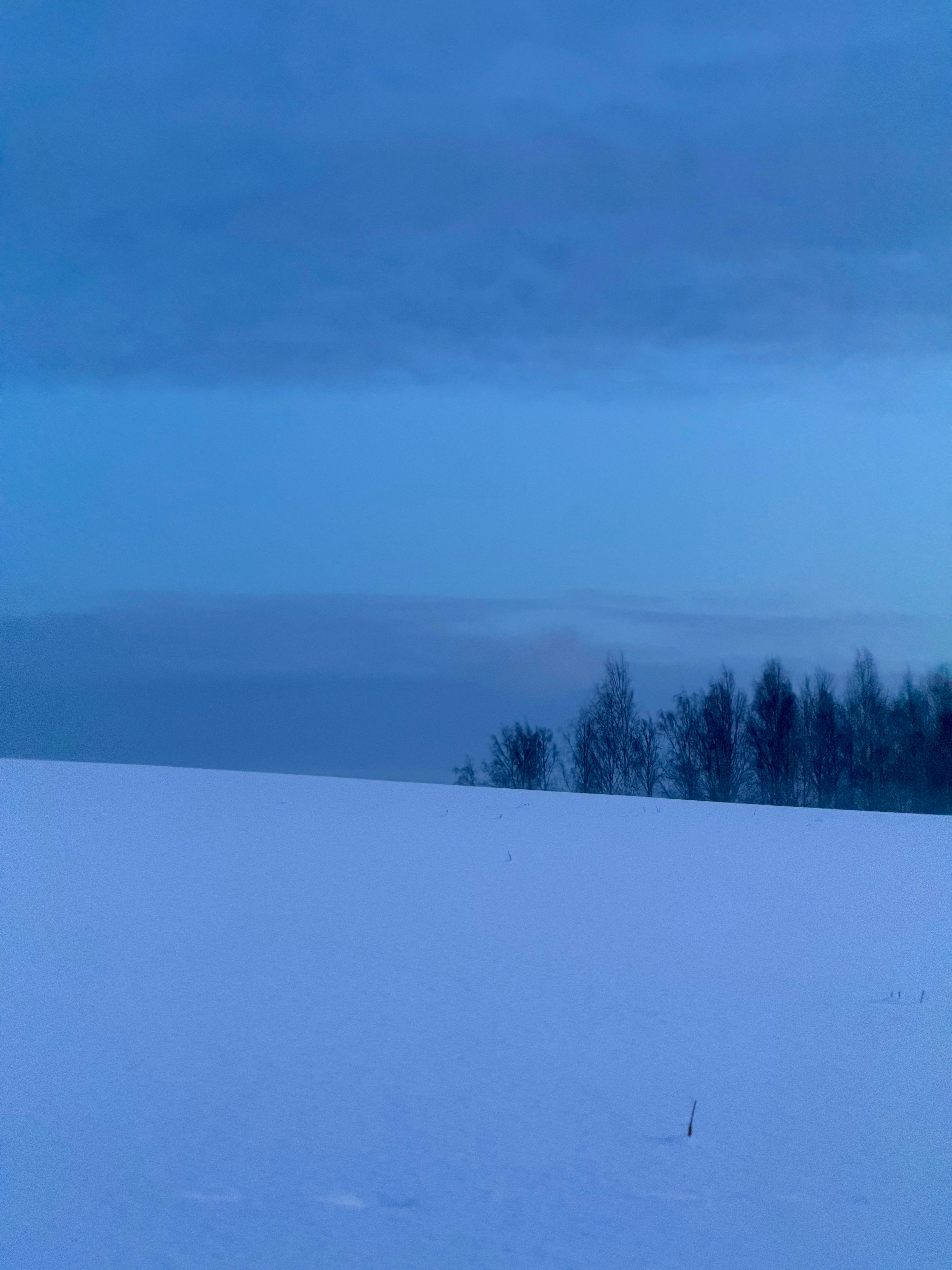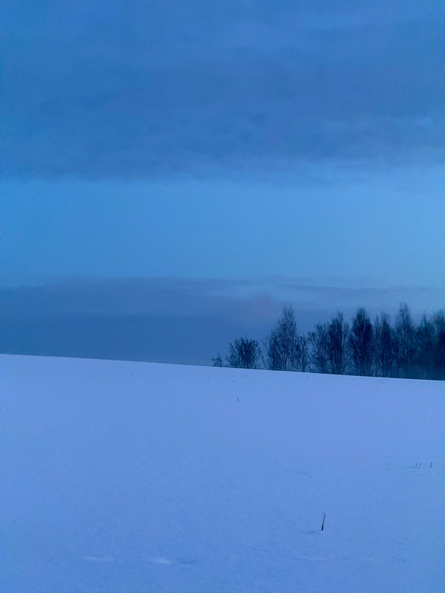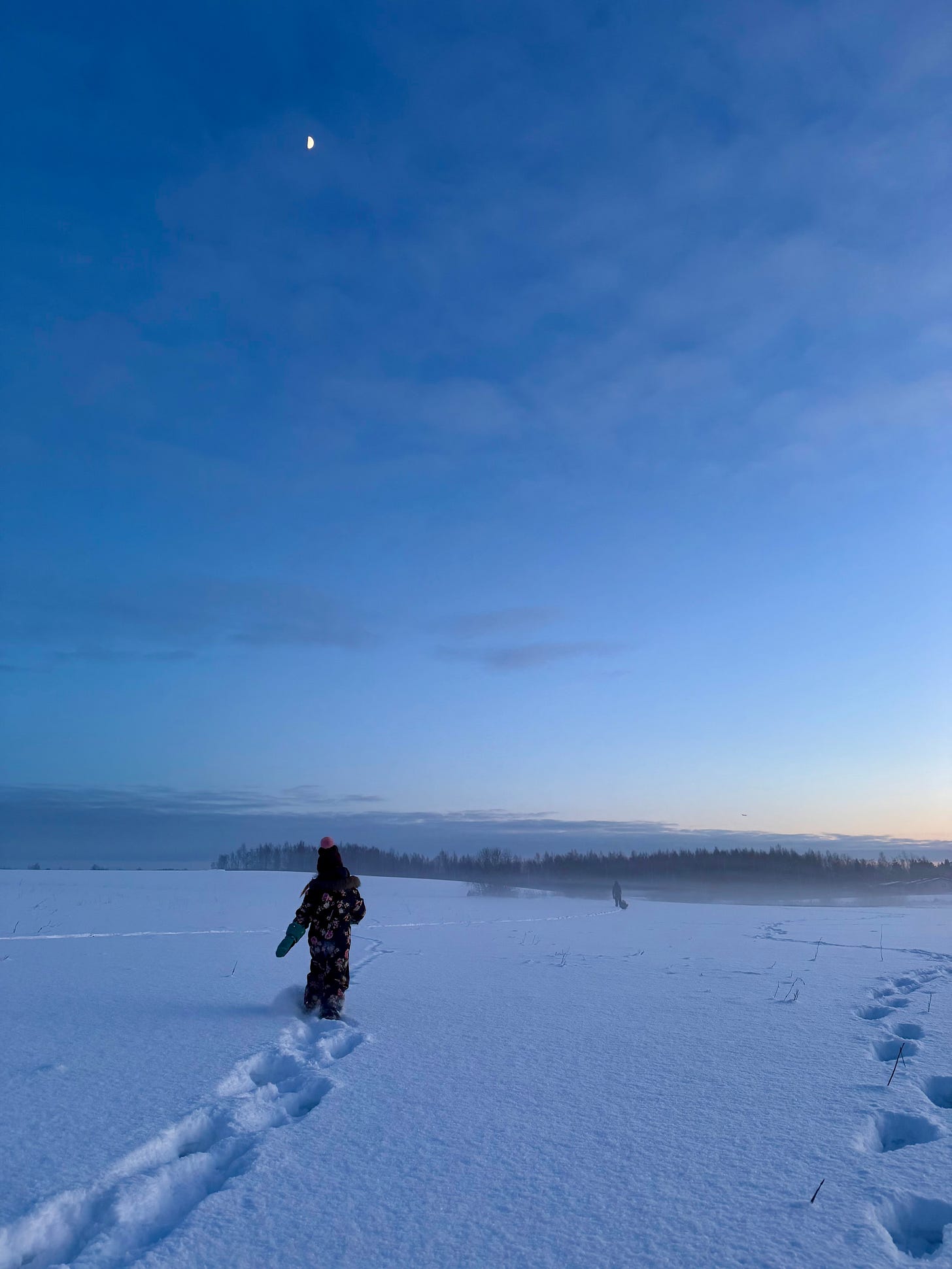 Behind us remained silence, and our traces in the snow. The footprints led home. The blue hour began. The moon stayed.