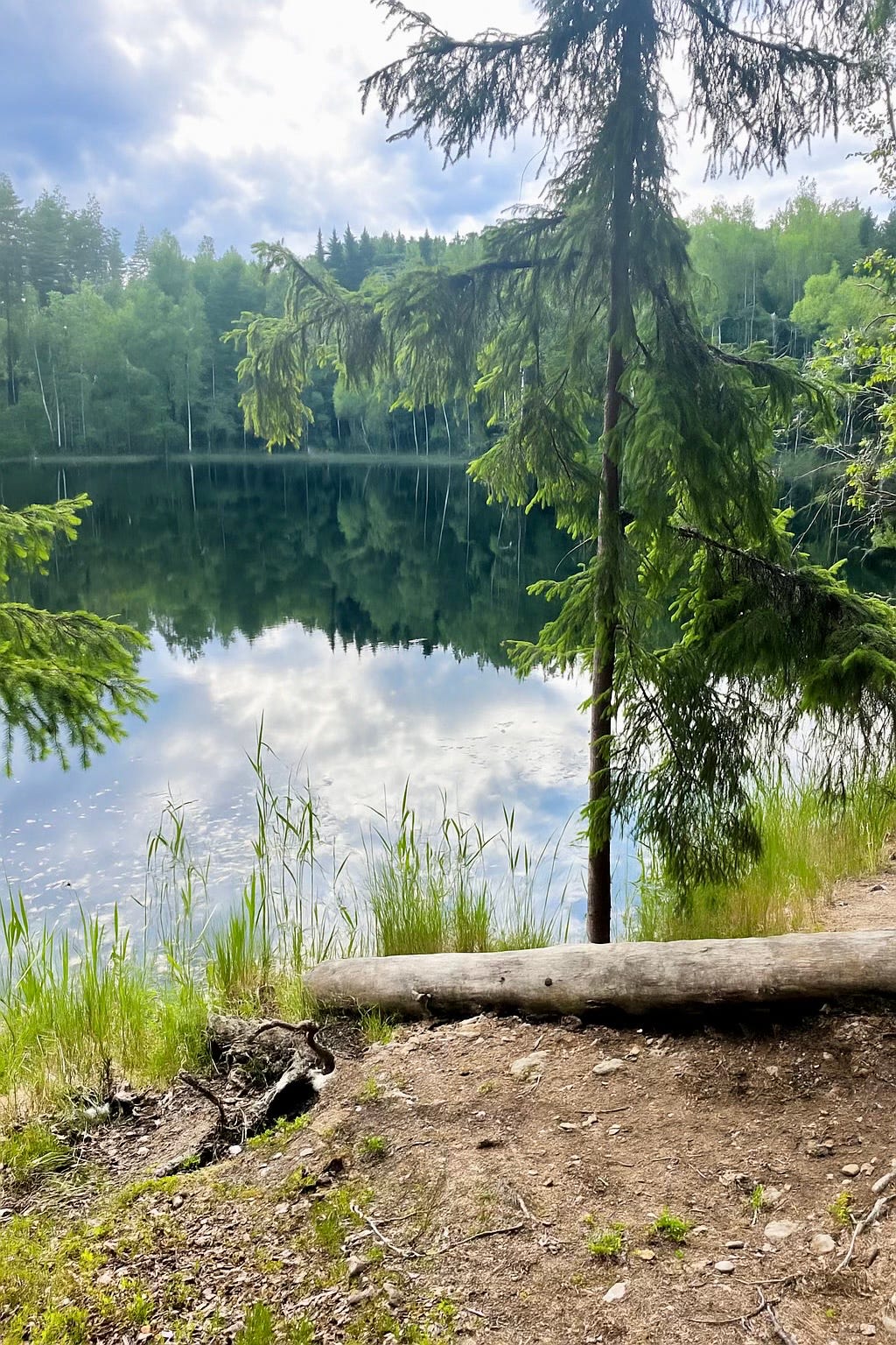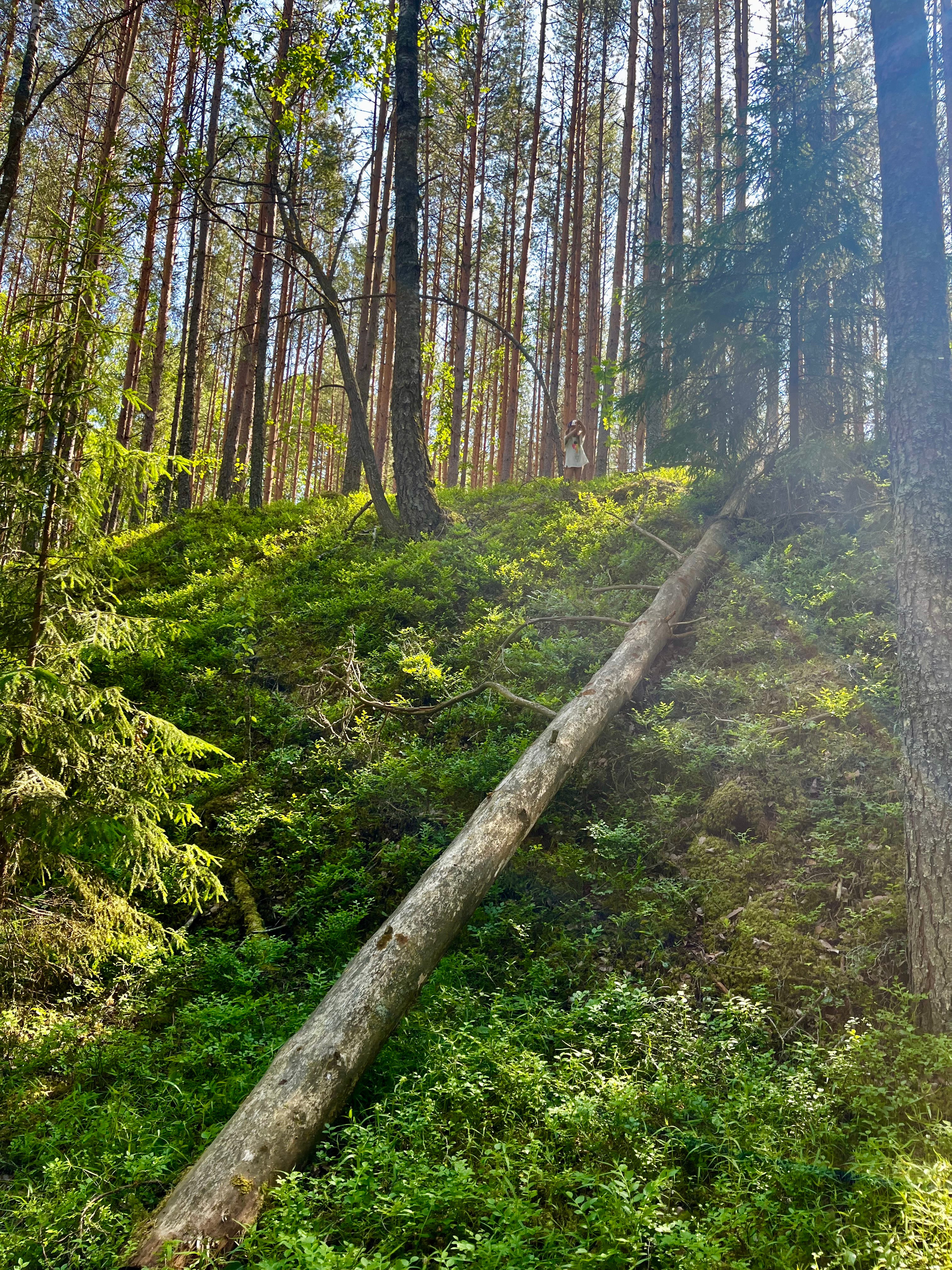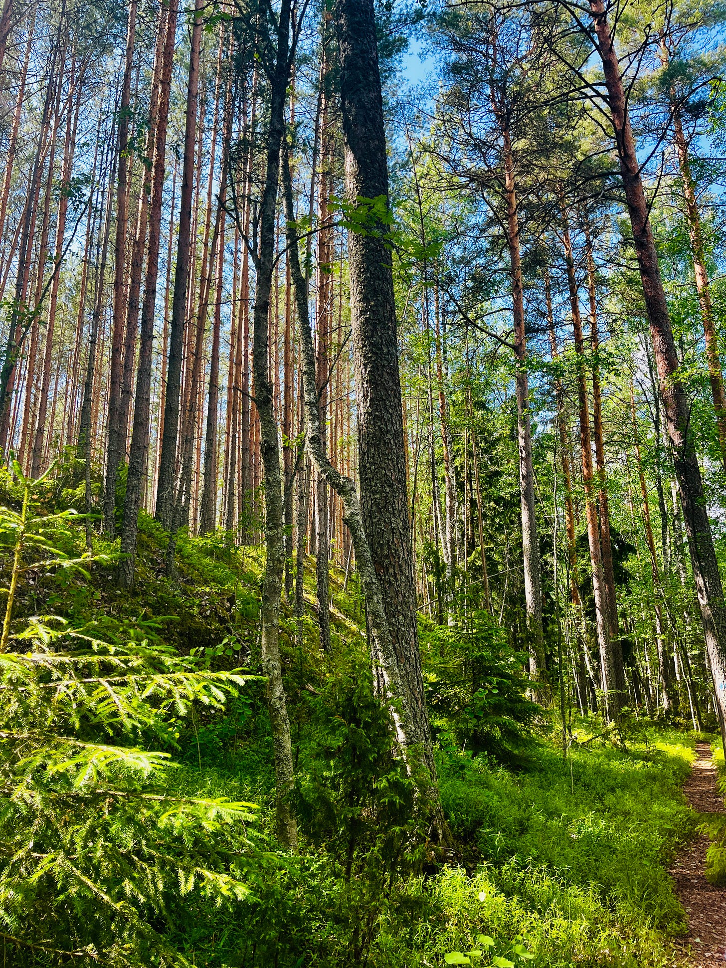 Path was lovely. Sunlight filtered through pine trees which grew on top of the esker. The path followed the esker, running along its base. Kids climbed to top of the esker using a fallen tree. We had no rush — just time to walk as slowly as we wanted and notice all the beauty of nature.