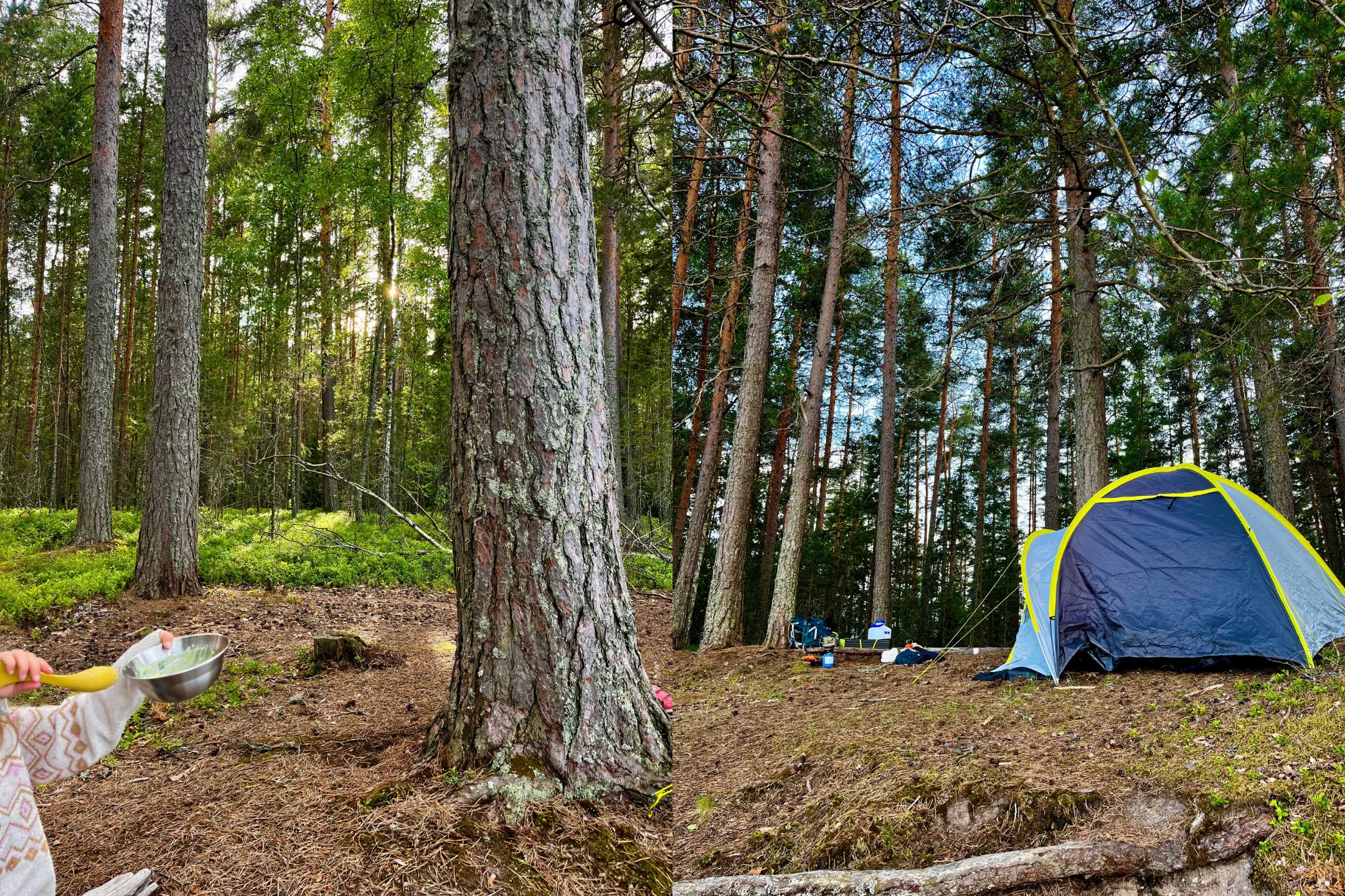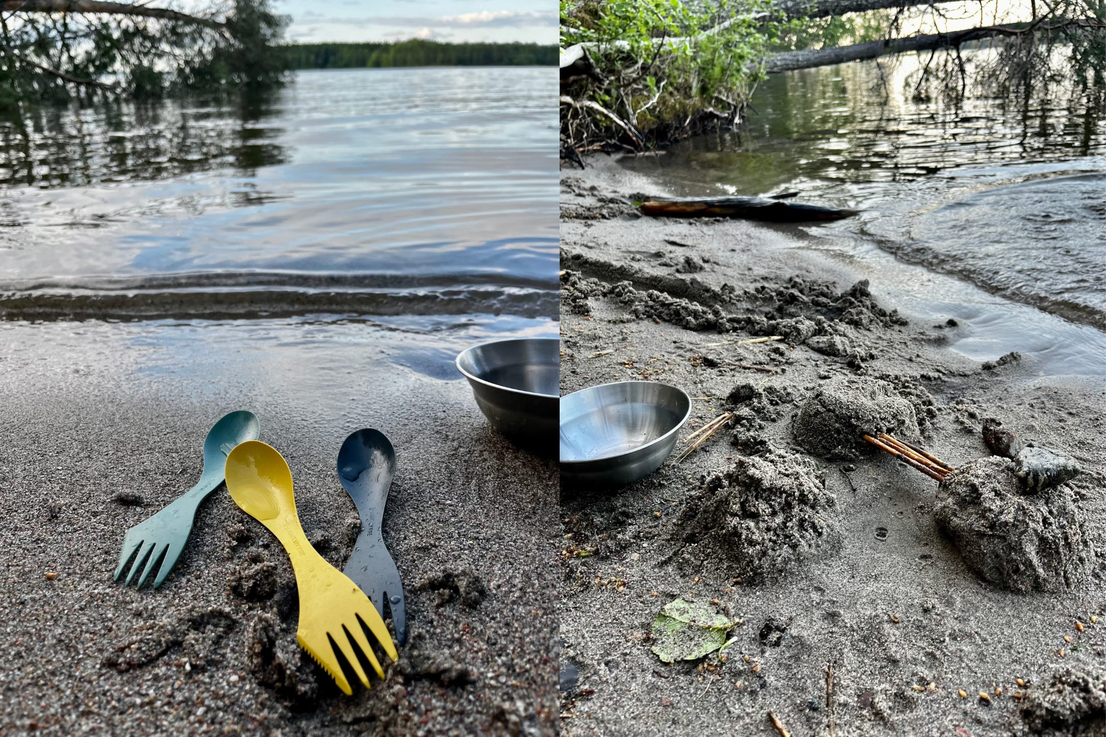 When we get back to the beach, we set up our tent in a small beachy spot in the forest. Kids played in the water and I made dinner on a gas stove using a raedy-made pouch pasta meal. Then my 8-year-old washed dishes, but that escaleted into construction play. He made houses to his village by using camping plate as a sand mold.