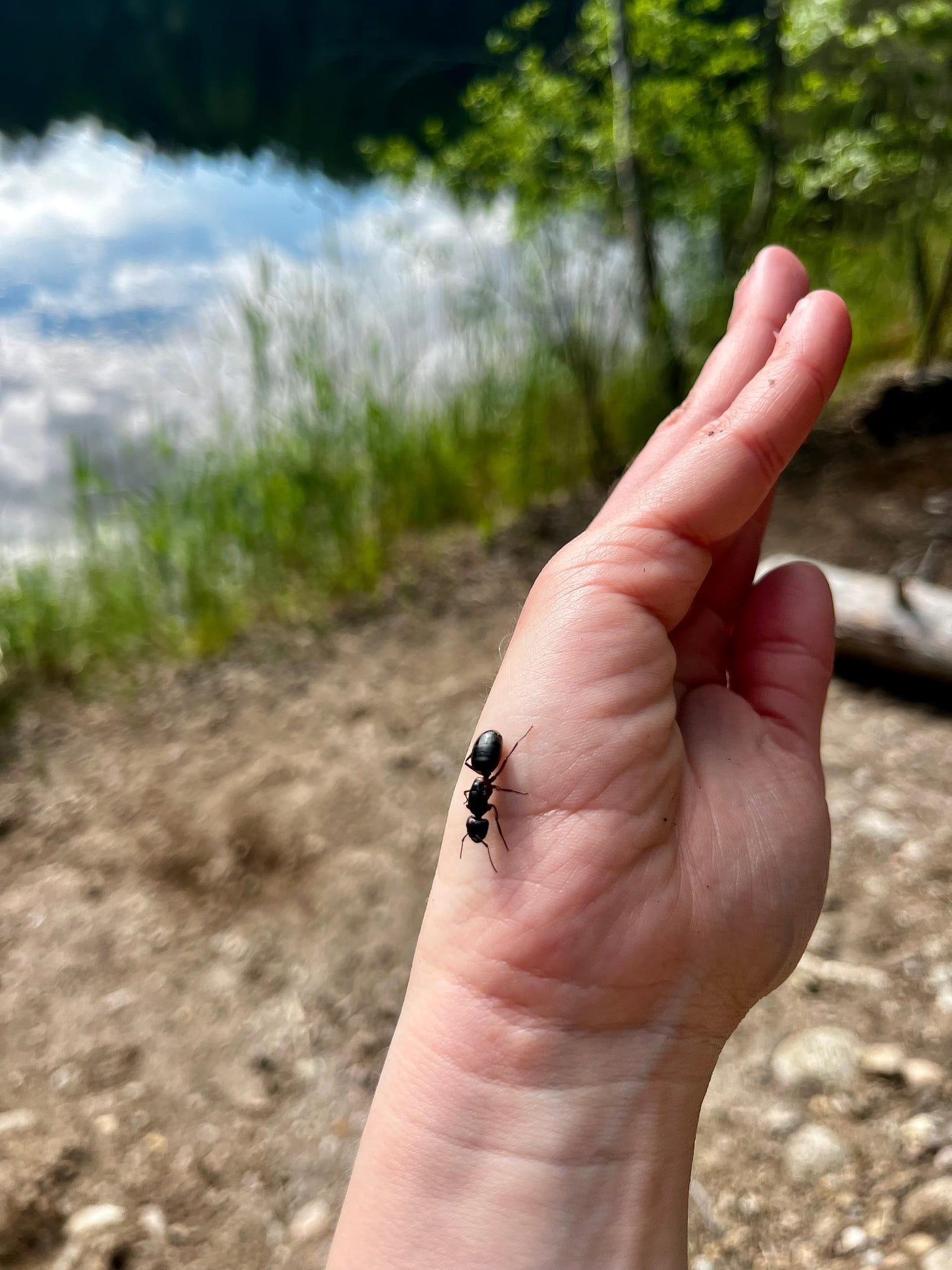 We spotted a Herculean carpenter ant crawling along a fallen log. They're among the largest ant species in our forests and every time I see one, I’m amazed over again by its size. (It’s my hand in the picture.)