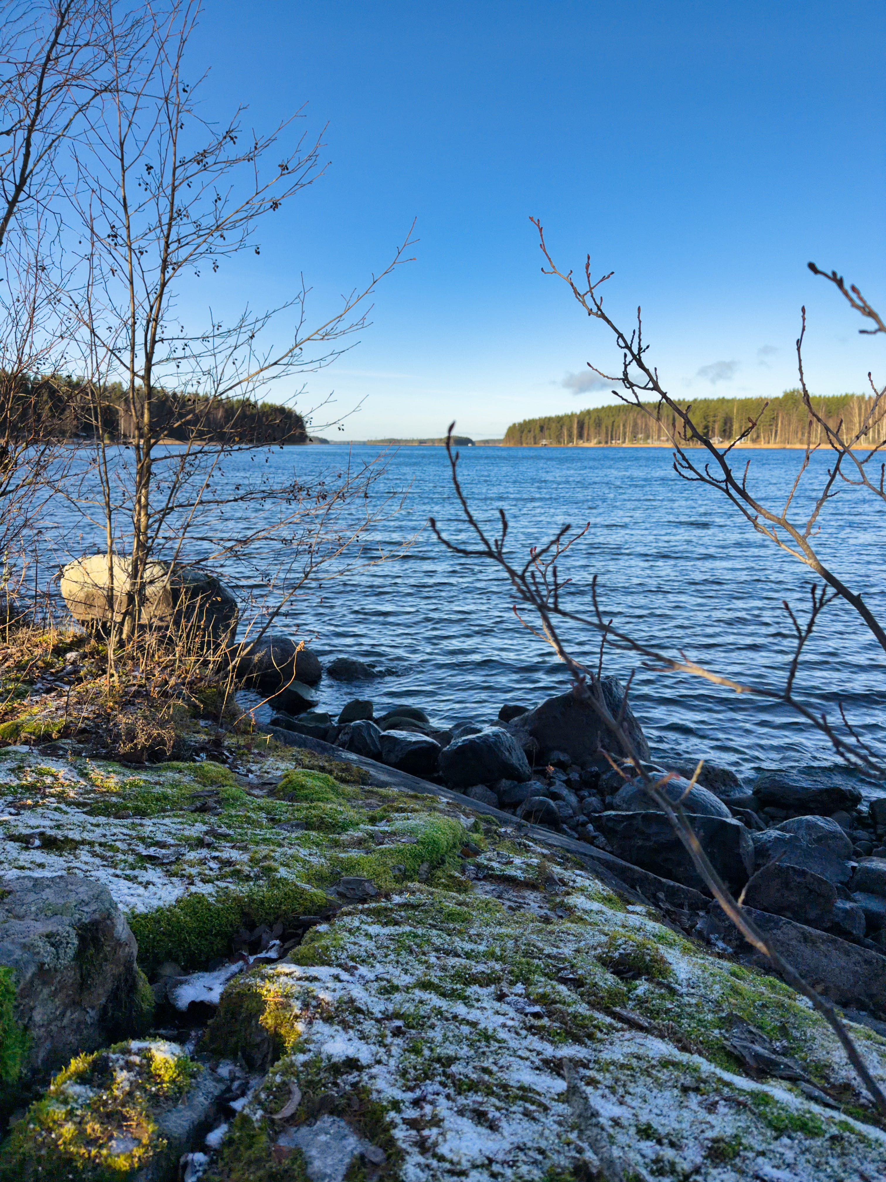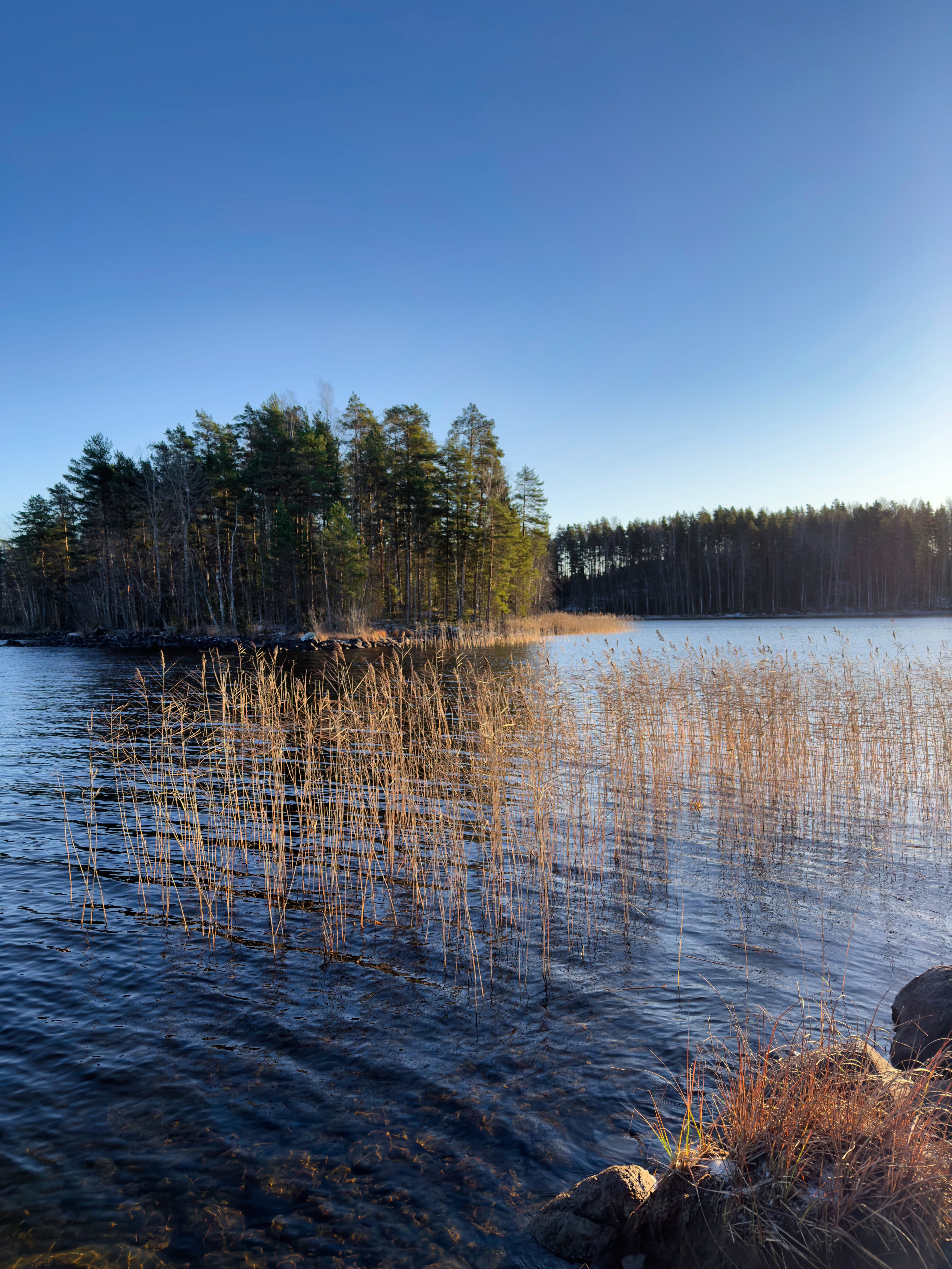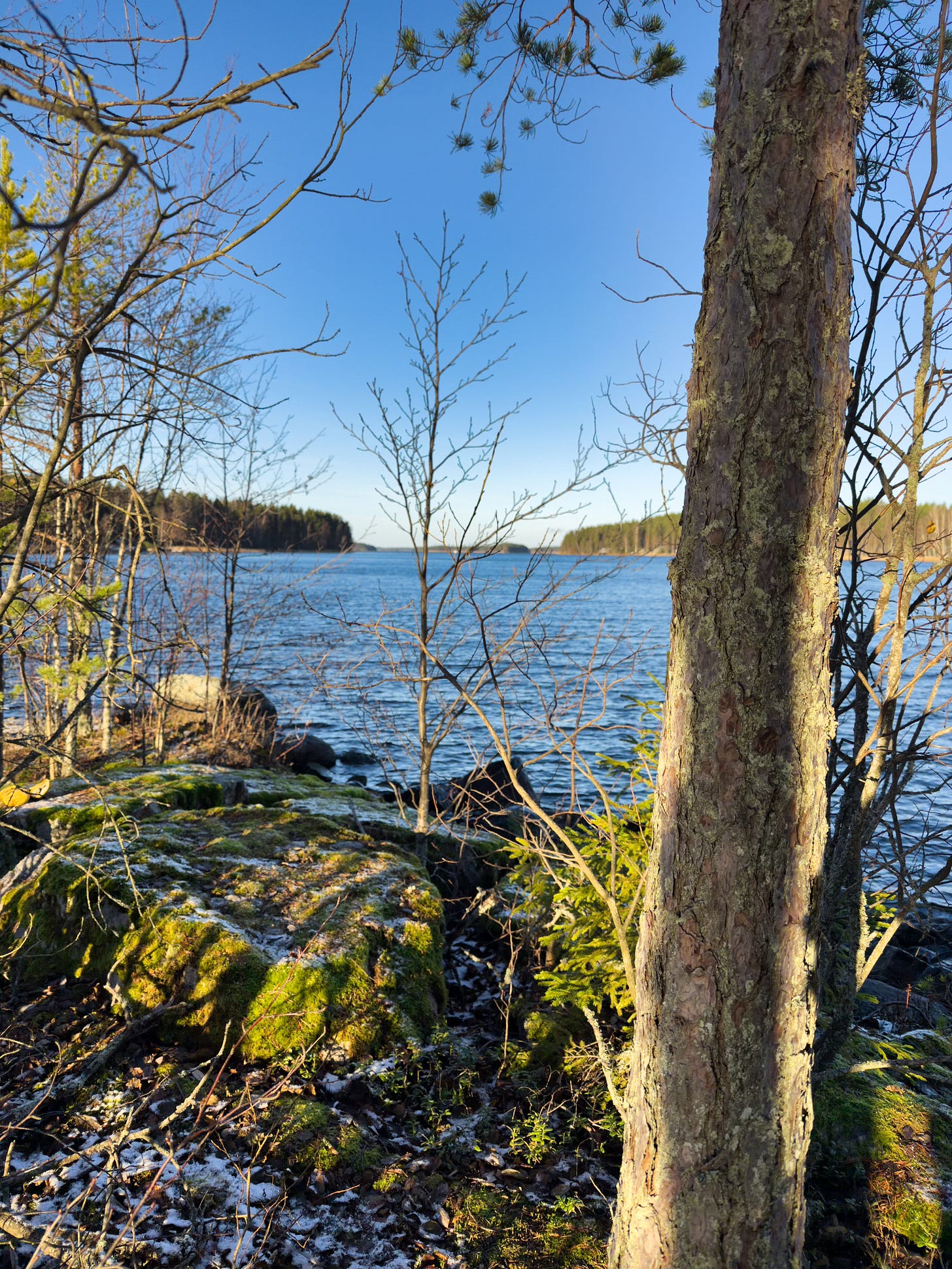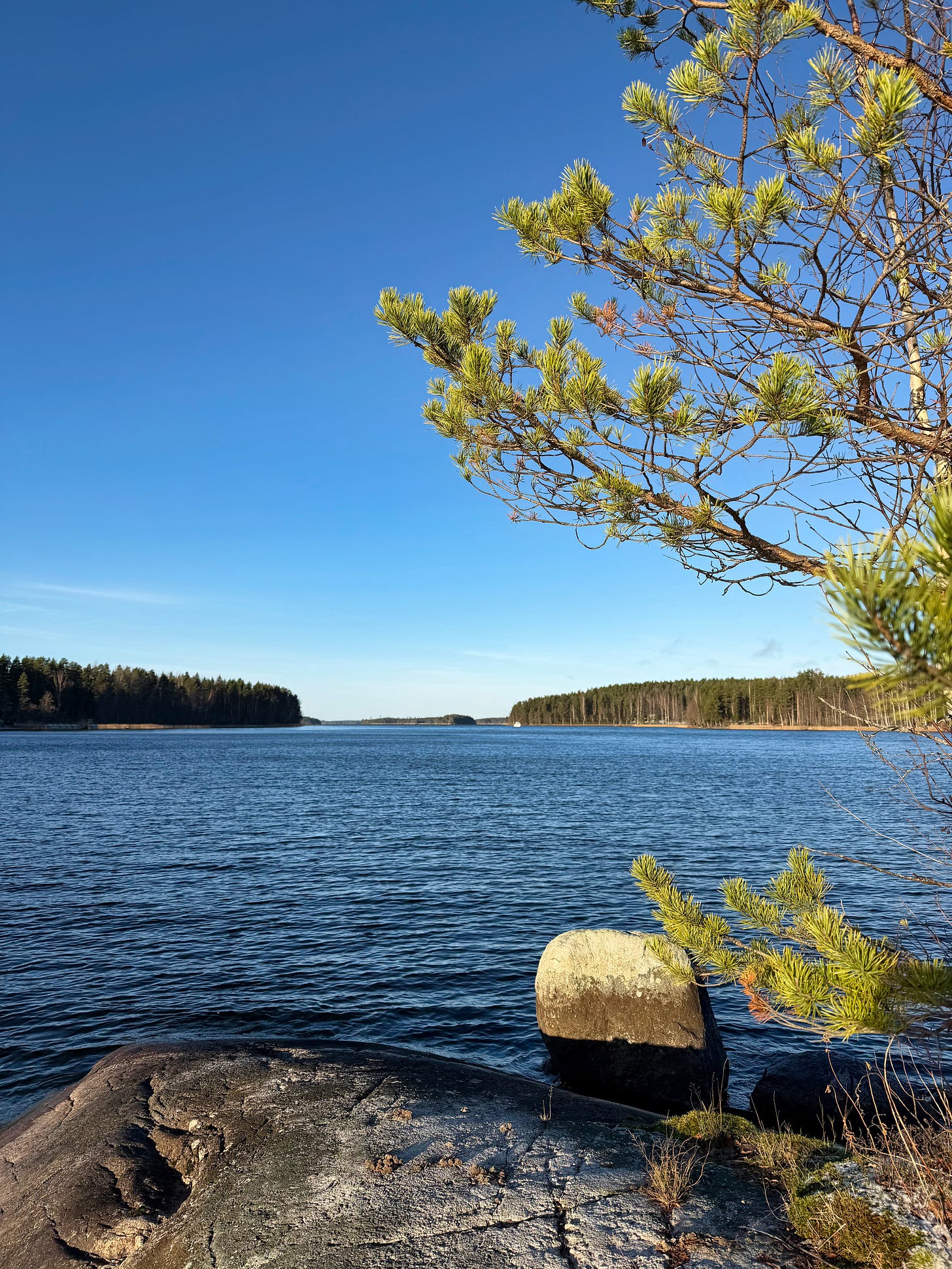 The island has a few old, thick pines, along with some young pines and birches. The island is only about 20 meters from shore to shore, yet it has its own little “places”, like this tip of the island, where there is a sharp rock ledge. The rock forms a kind of bench where we’ve had snacks many times, watched the sunset, and wondered about the world. There is also a large water-surrounded rock, which is easy to climb and stand on.