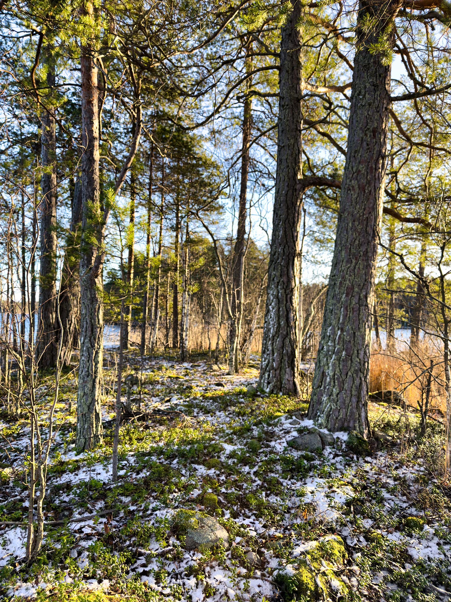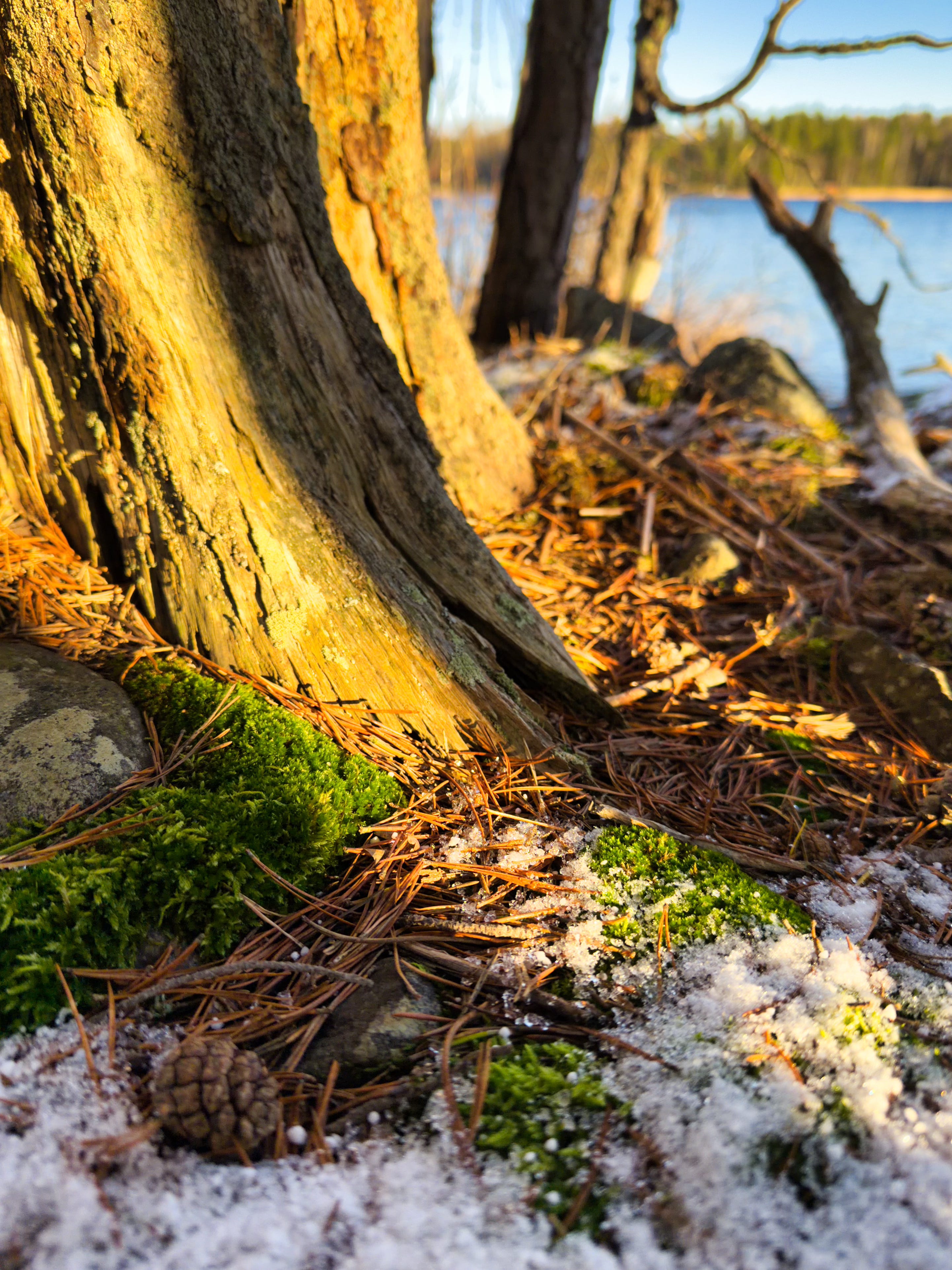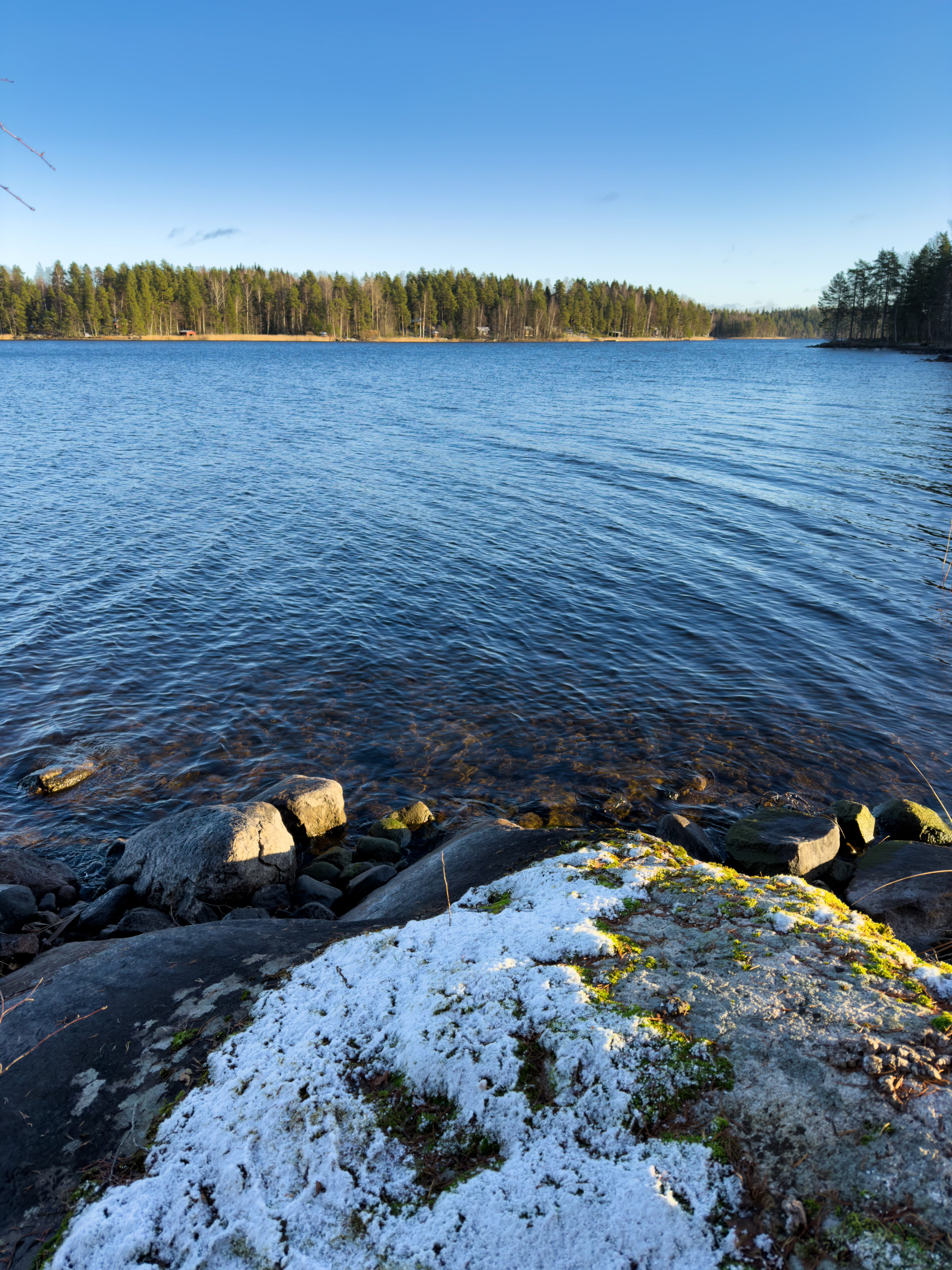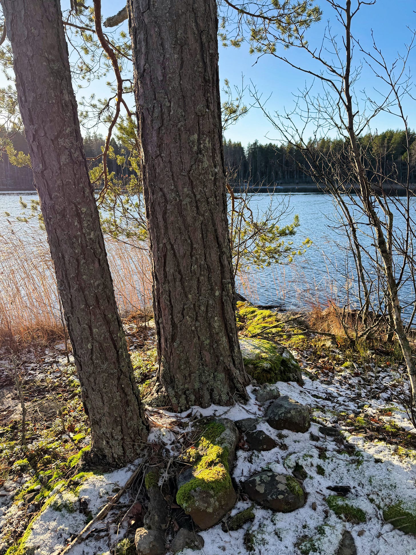 The island has a few old, thick pines, along with some young pines and birches. The island is only about 20 meters from shore to shore, yet it has its own little “places”, like this tip of the island, where there is a sharp rock ledge. The rock forms a kind of bench where we’ve had snacks many times, watched the sunset, and wondered about the world. There is also a large water-surrounded rock, which is easy to climb and stand on.