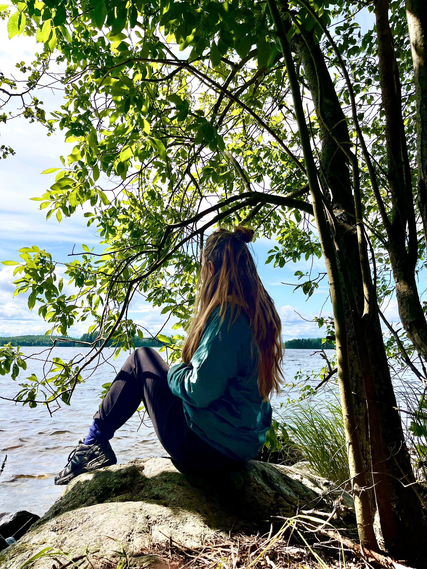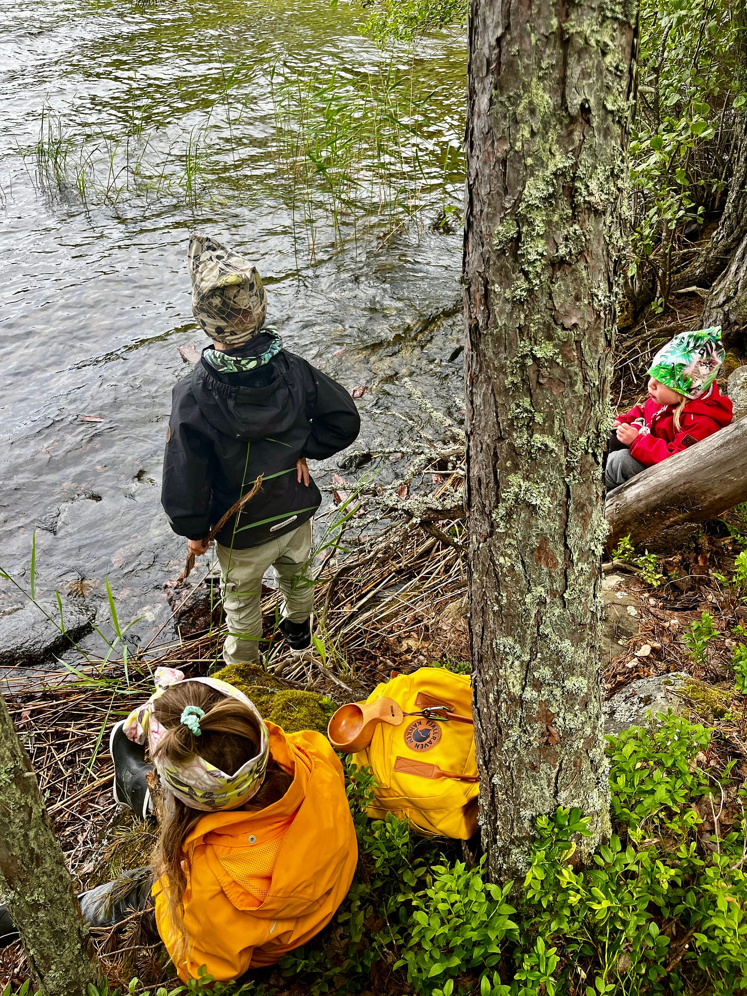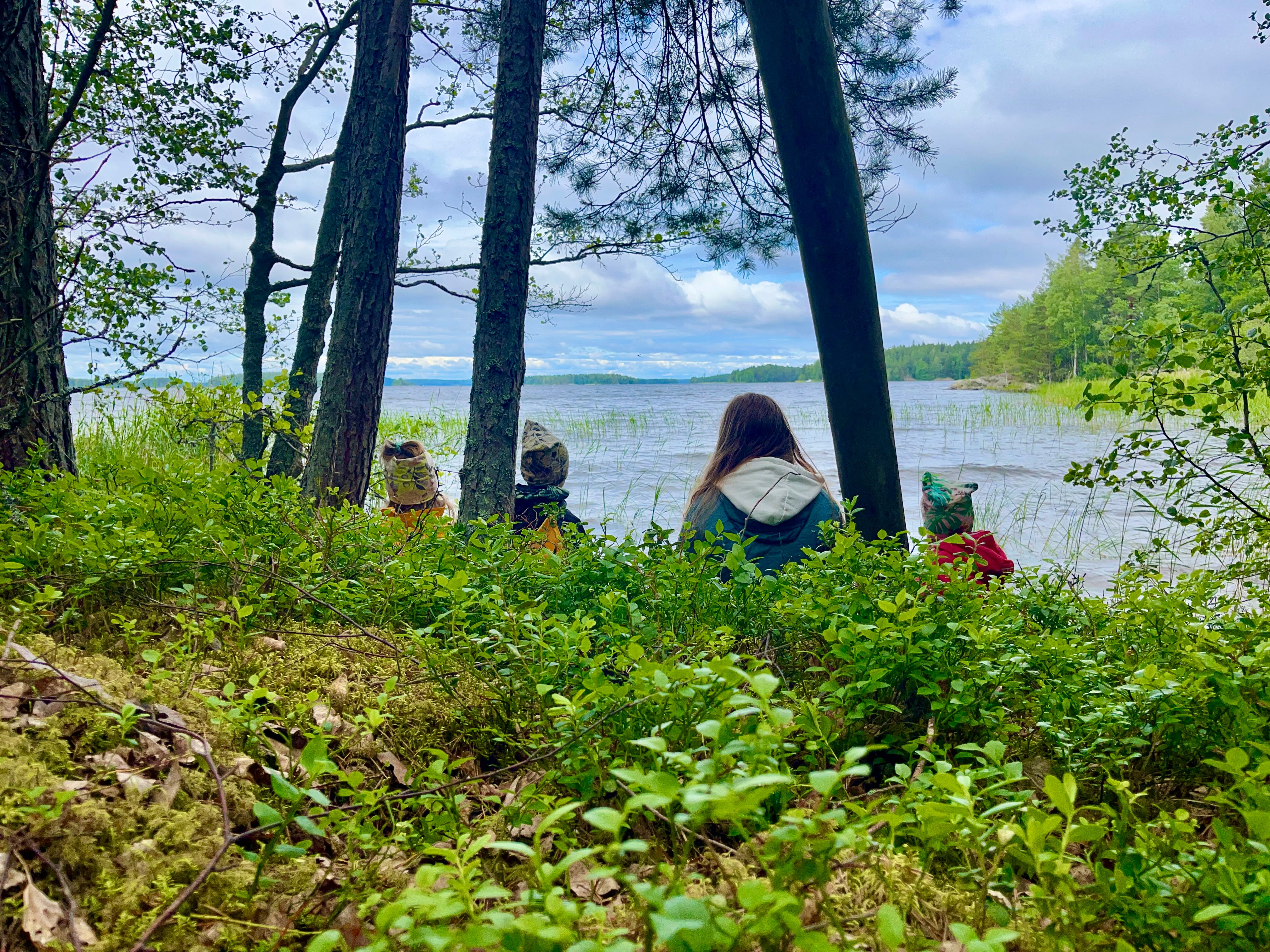 After a while of walking in the forest, we reached the shoreline of Lake Päijänne. Waves were big and it was quite windy, but we sat right on the shoreline, beside the trees which reached over the water. While I was unpacking the snacks, the kids played camping — making campfires out of sticks.