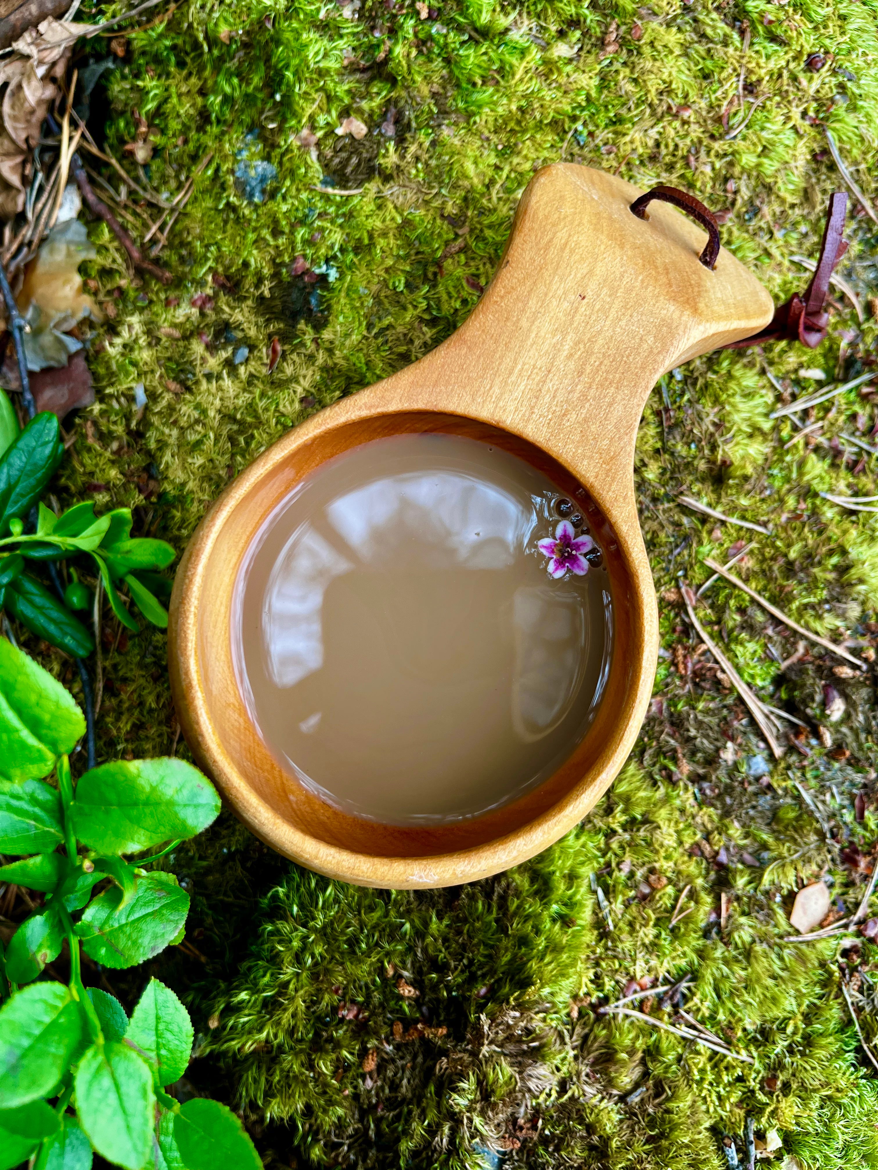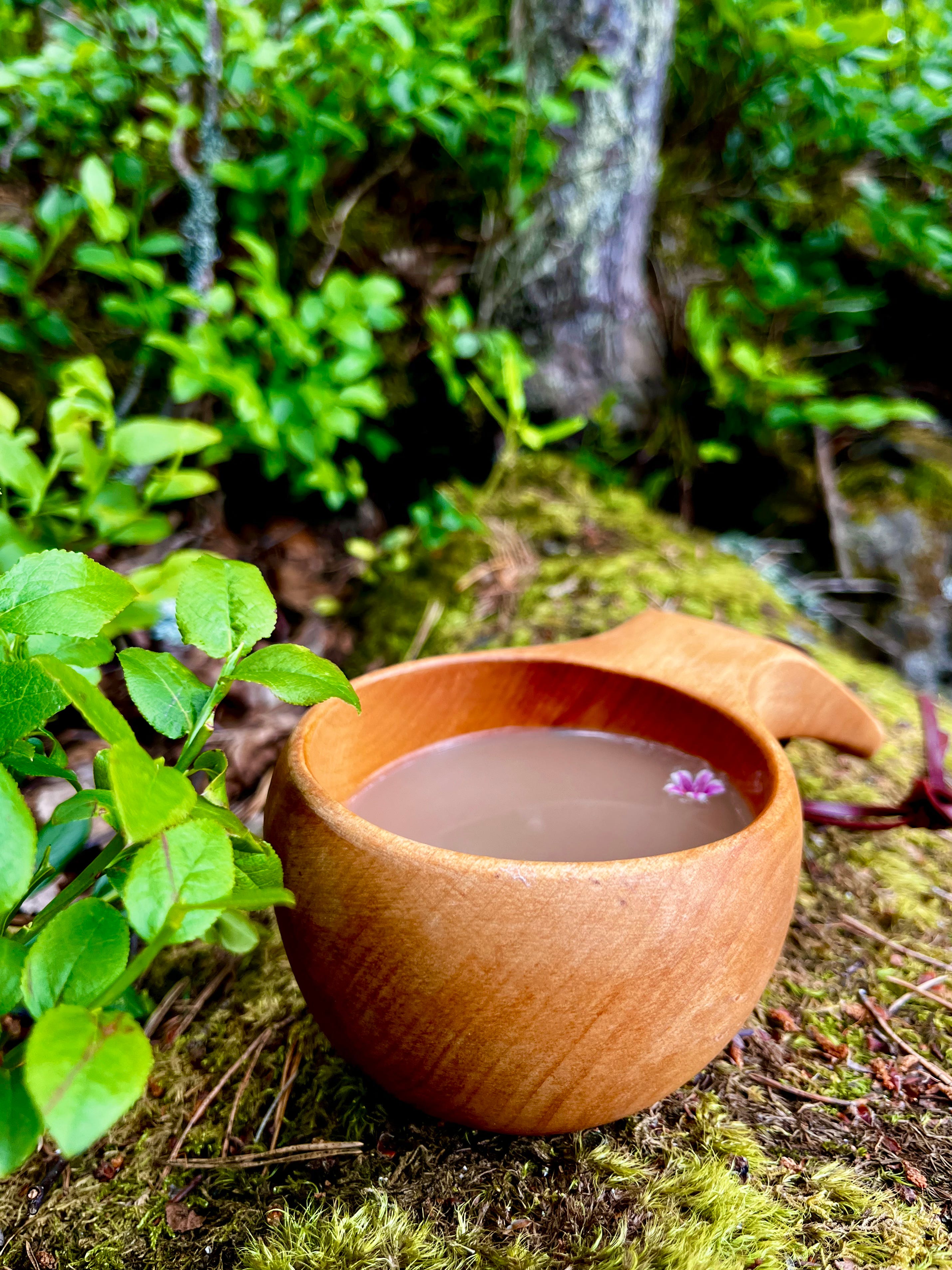 So, it was my time to drink some coffee from a 'kuksa', a wooden cup. I poured coffee from a thermos and then put down the kuksa so I could close the thermos. And when I saw with a corner of my eye something foresty debris falling into my coffee, I couldn’t believe what it was: a flower of the twinflower! My first thought was that no one’s ever gonna believe that it landed there by itself.