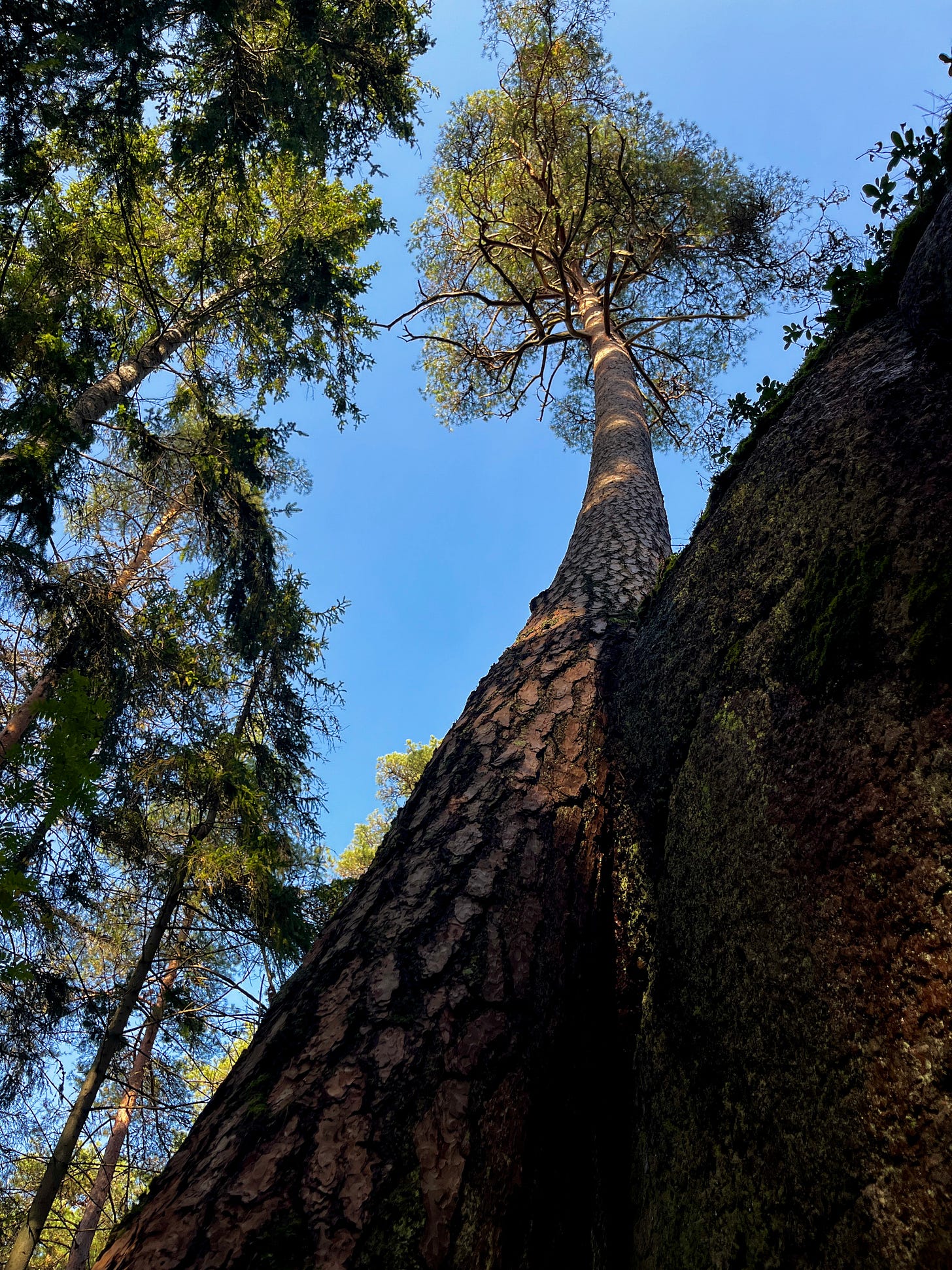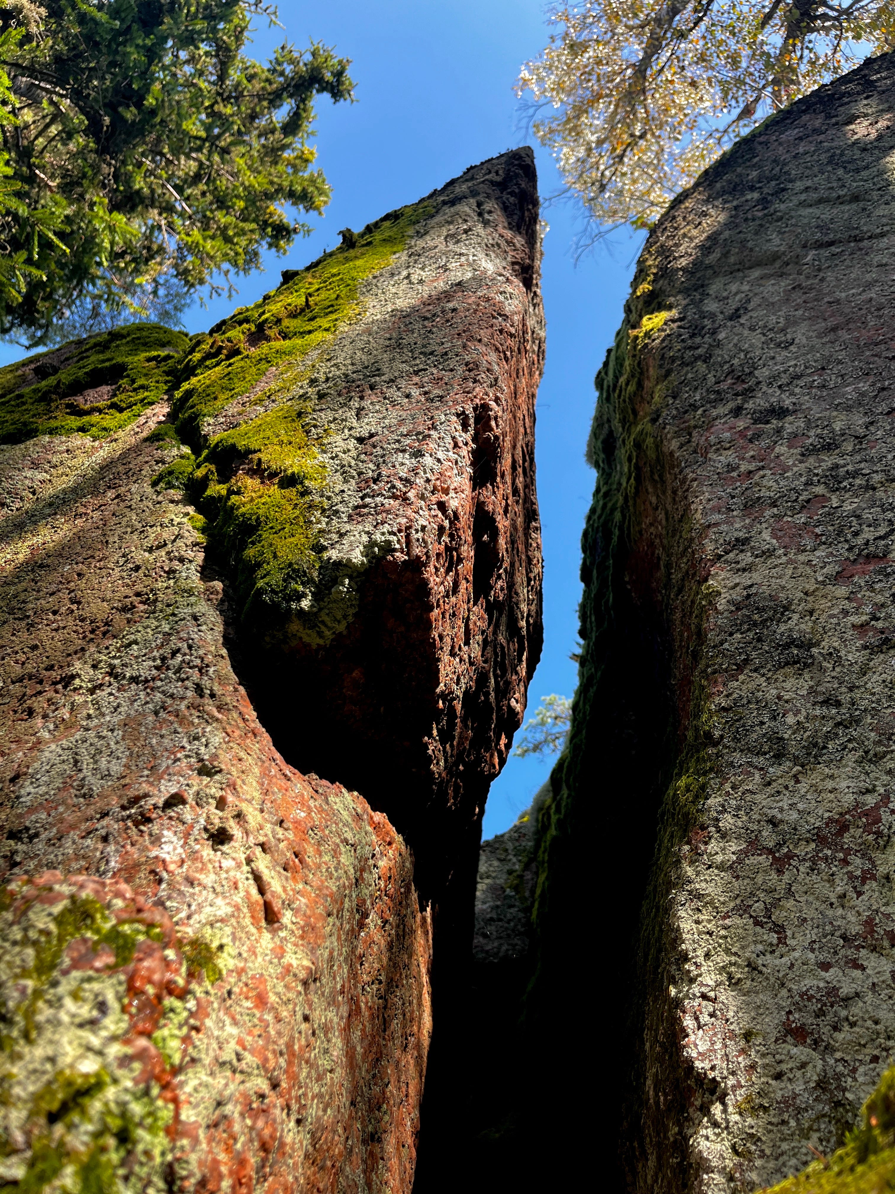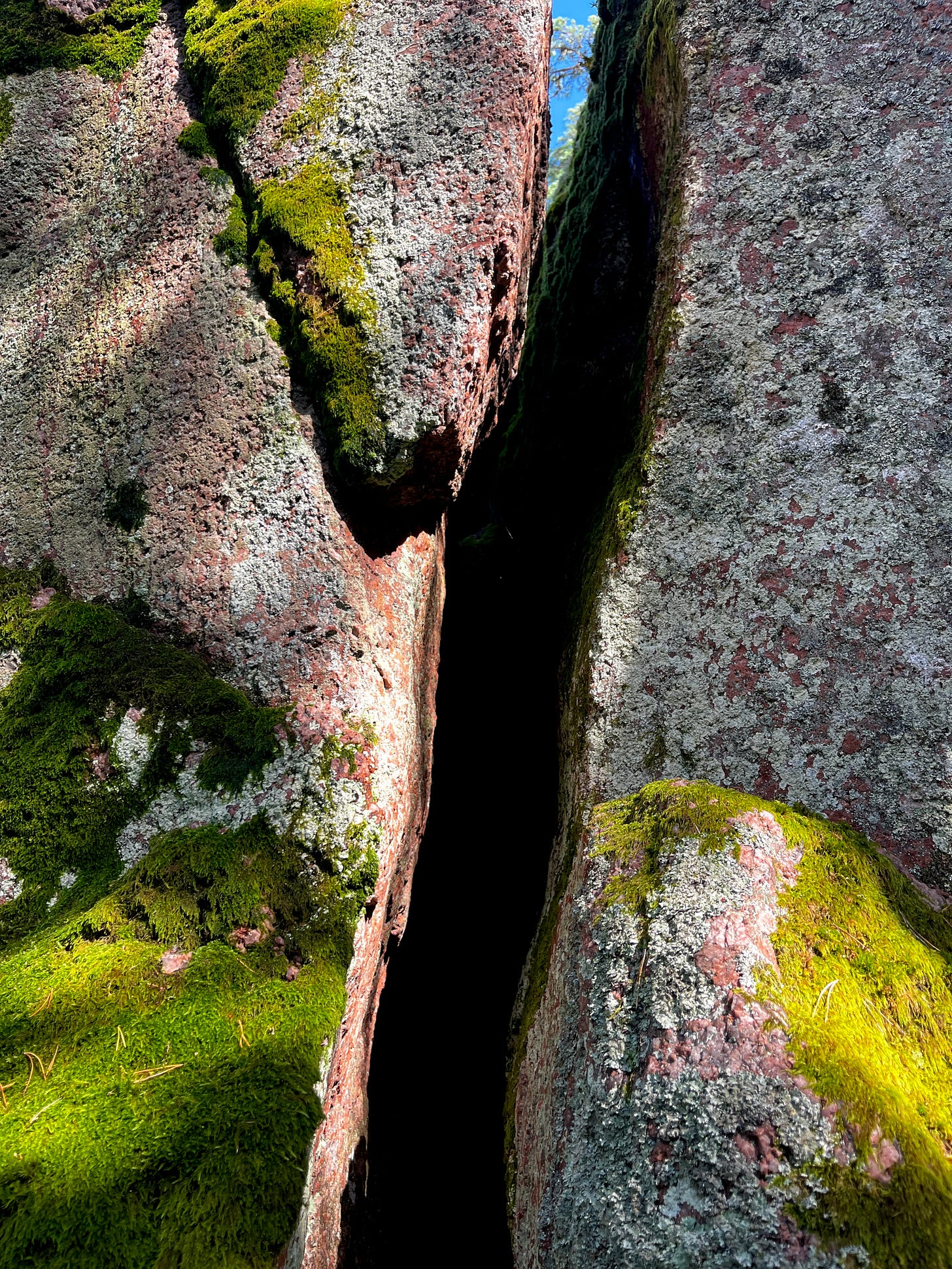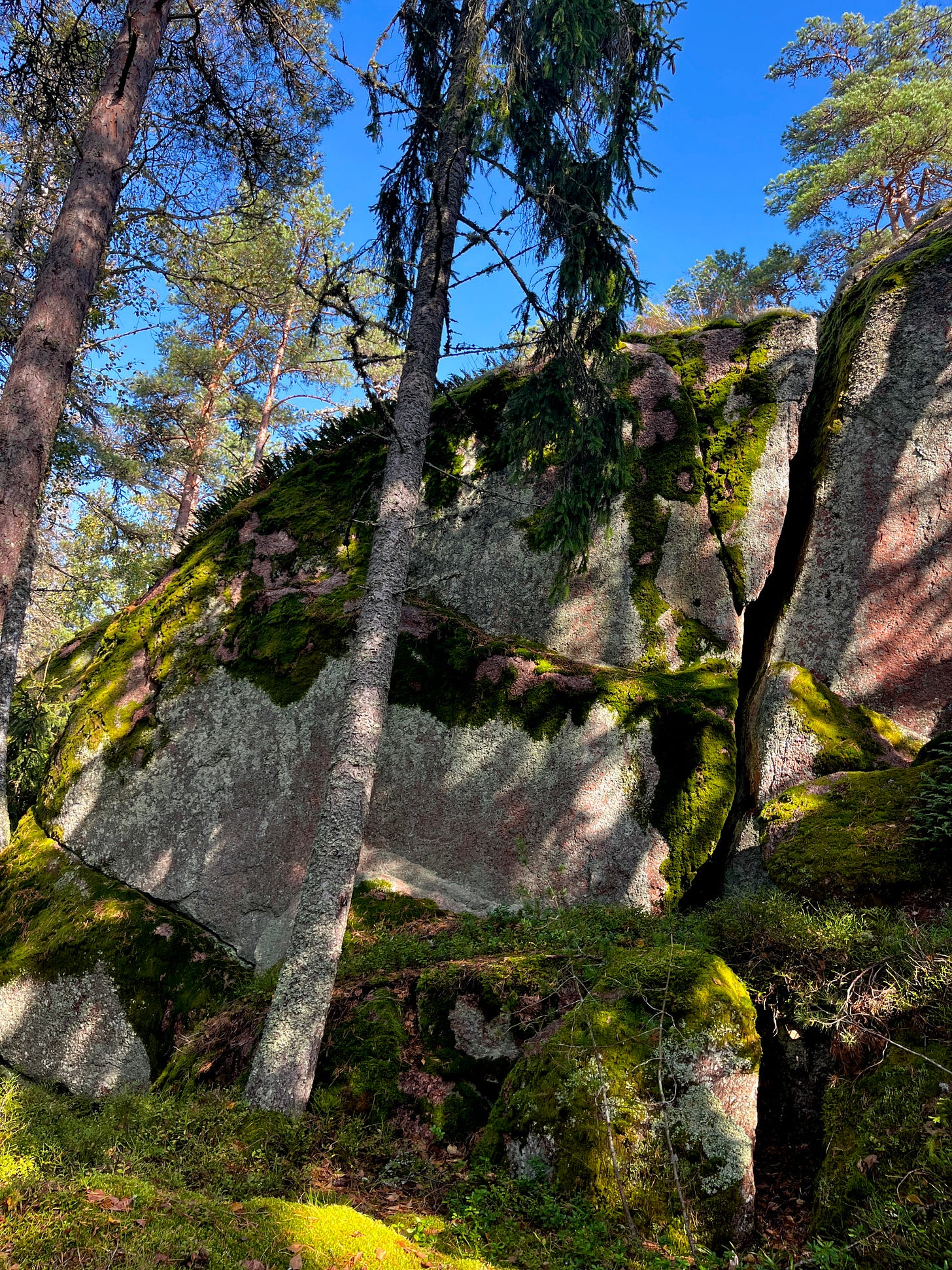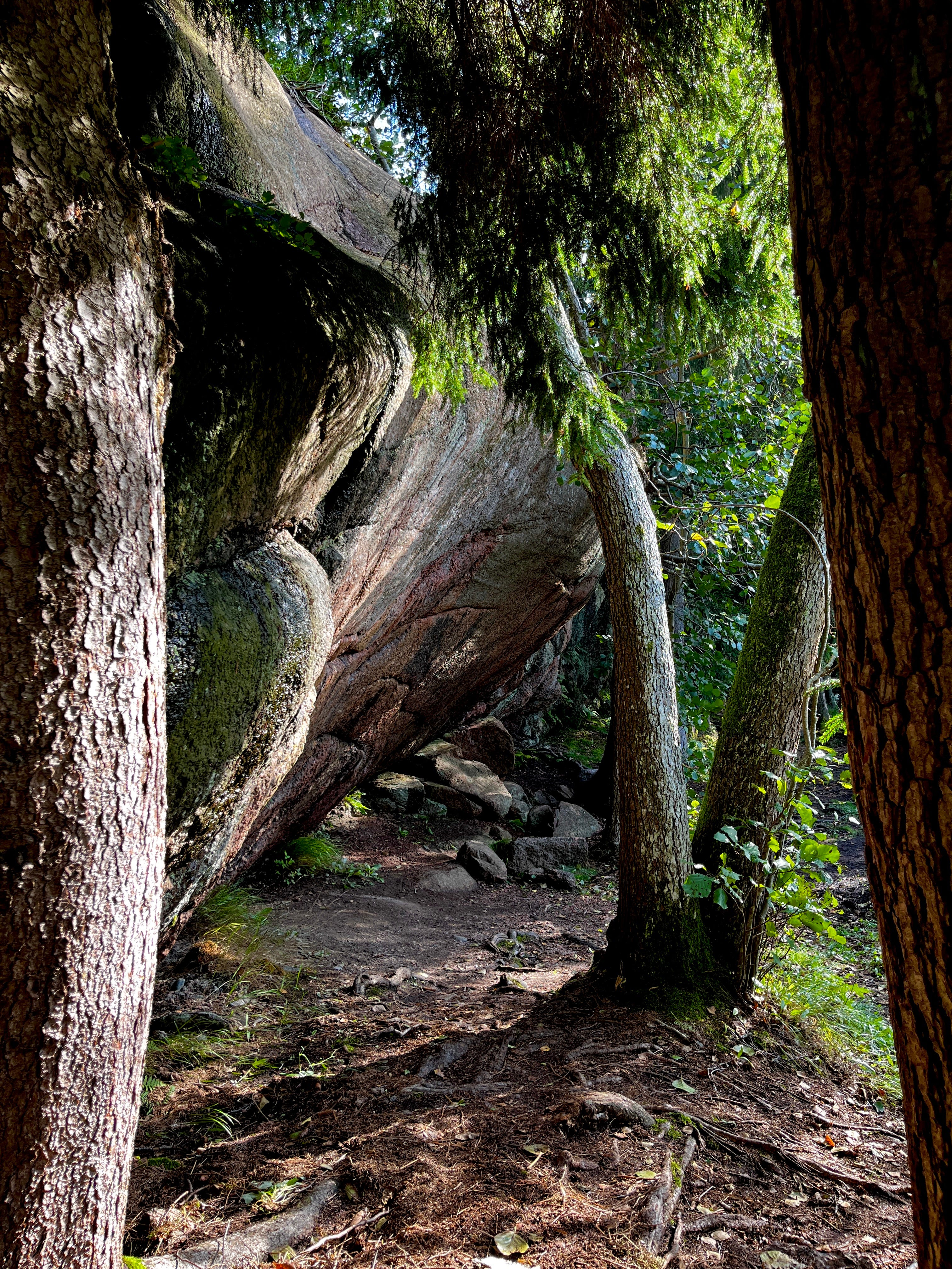 There, between two pines and under this sheltered rock, was clearly a portal — gate to a hidden mossy-wall haven. Under this granite roof, I felt so safe. If I had lived Stone Age, this would have been the perfect spot for my hut. Sleeping beside this steady rock must have been so cozy and protected.