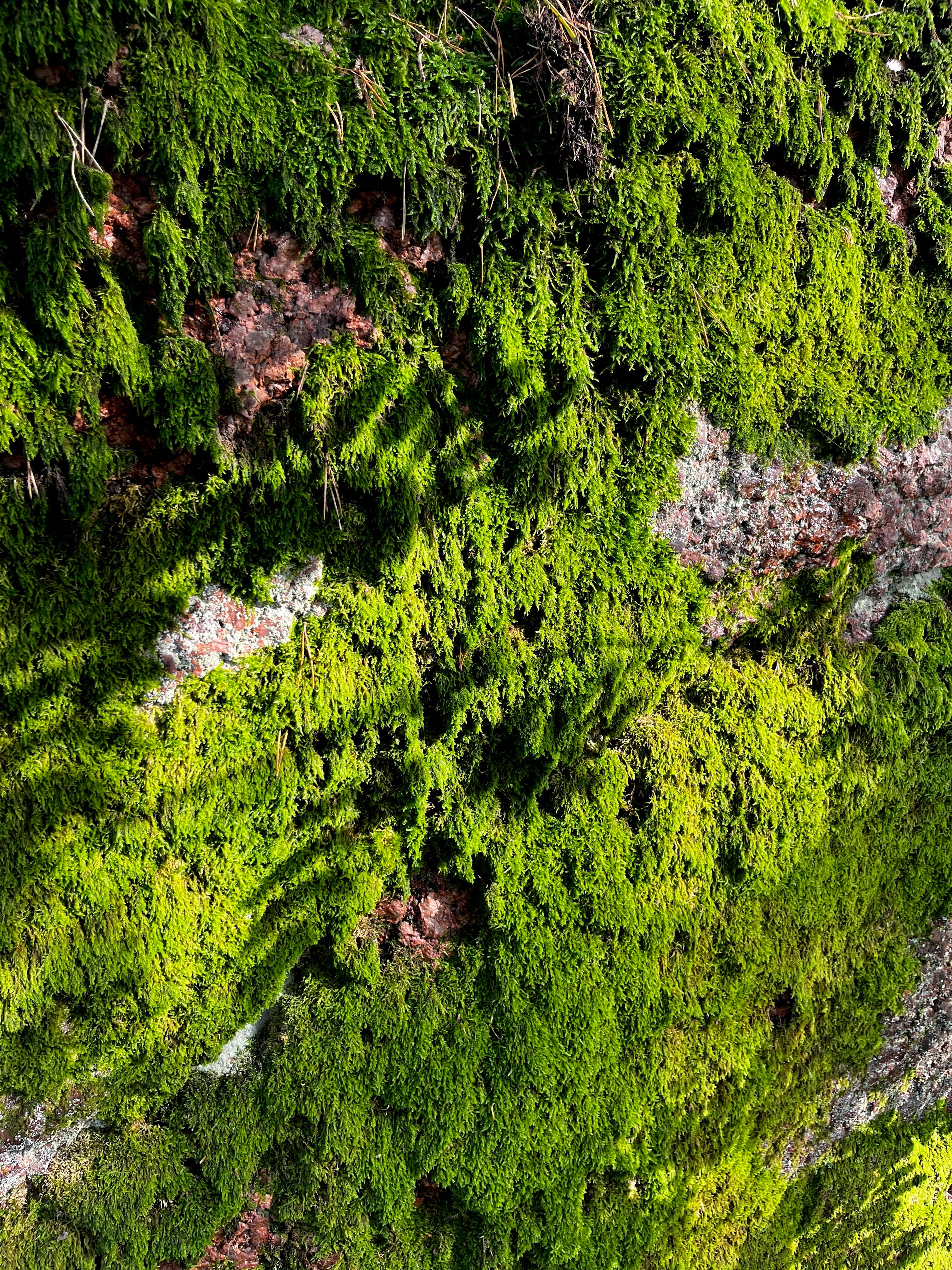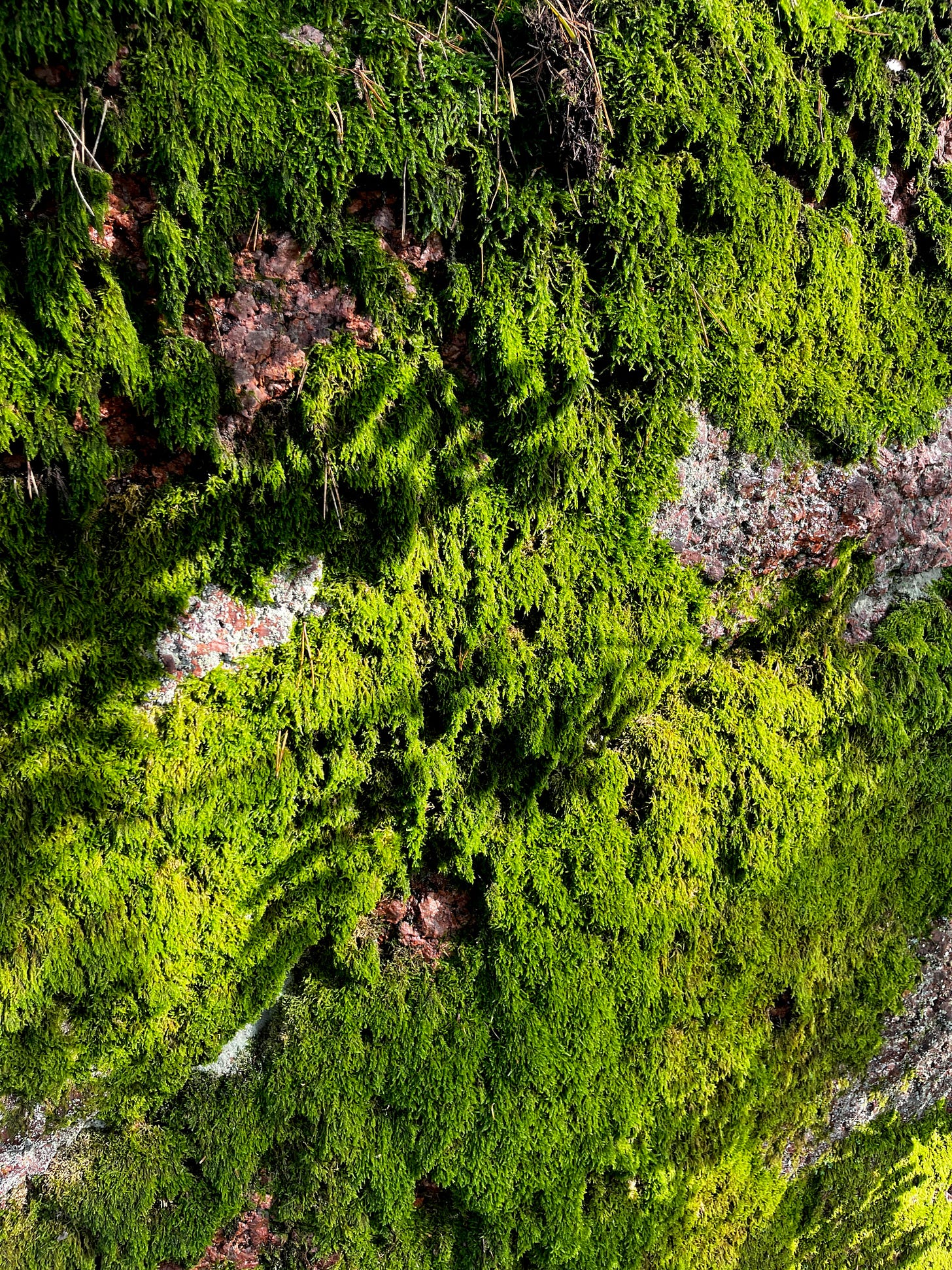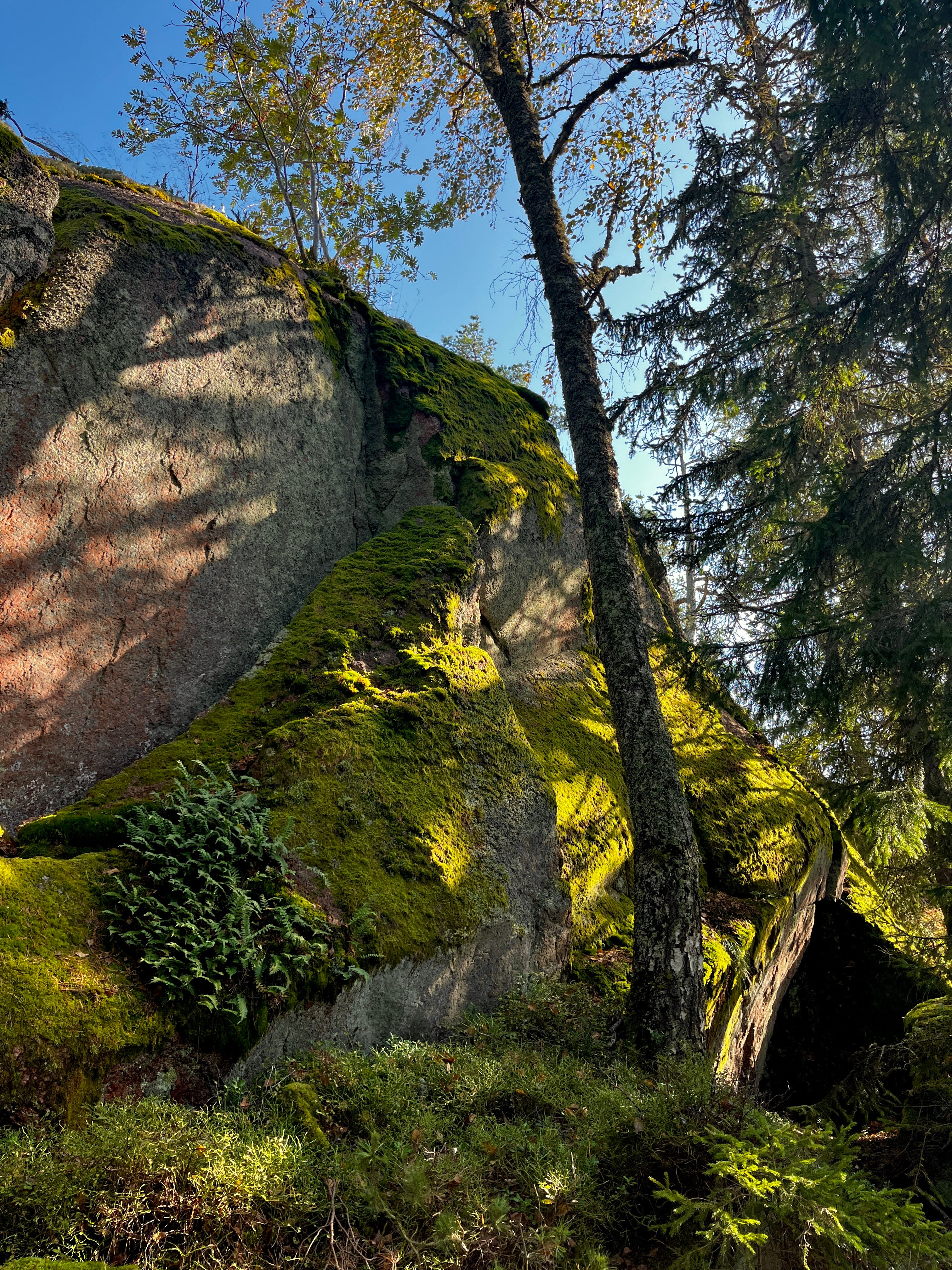 After we continued, we came to the sheer cliffs, where a green carpet covered the stone wall and the sun made it shine. Even though this was a northern coniferous forest, the moss on the cliffs looked like it belonged to a humid jungle, with delicate mats growing almost like algae. The cliff seemed to blush under the moss, as if shy and embarrassed for us to observe it so intently.