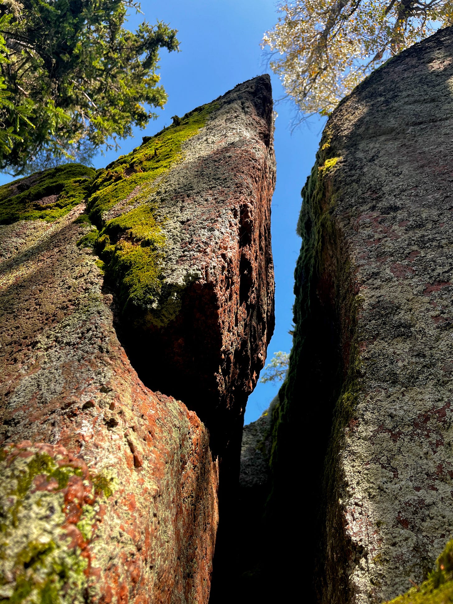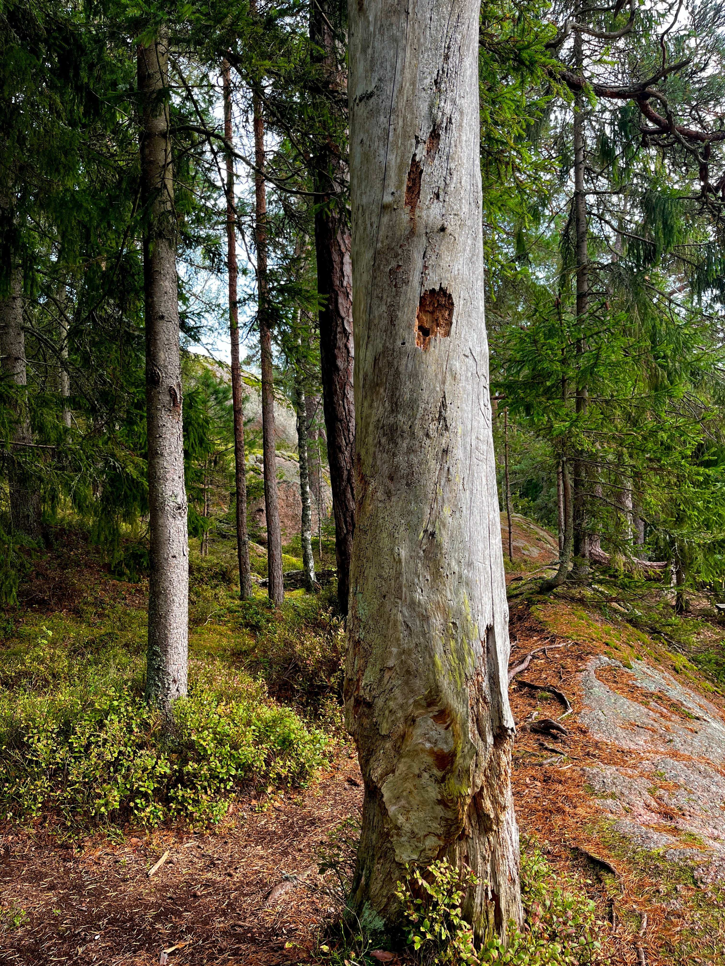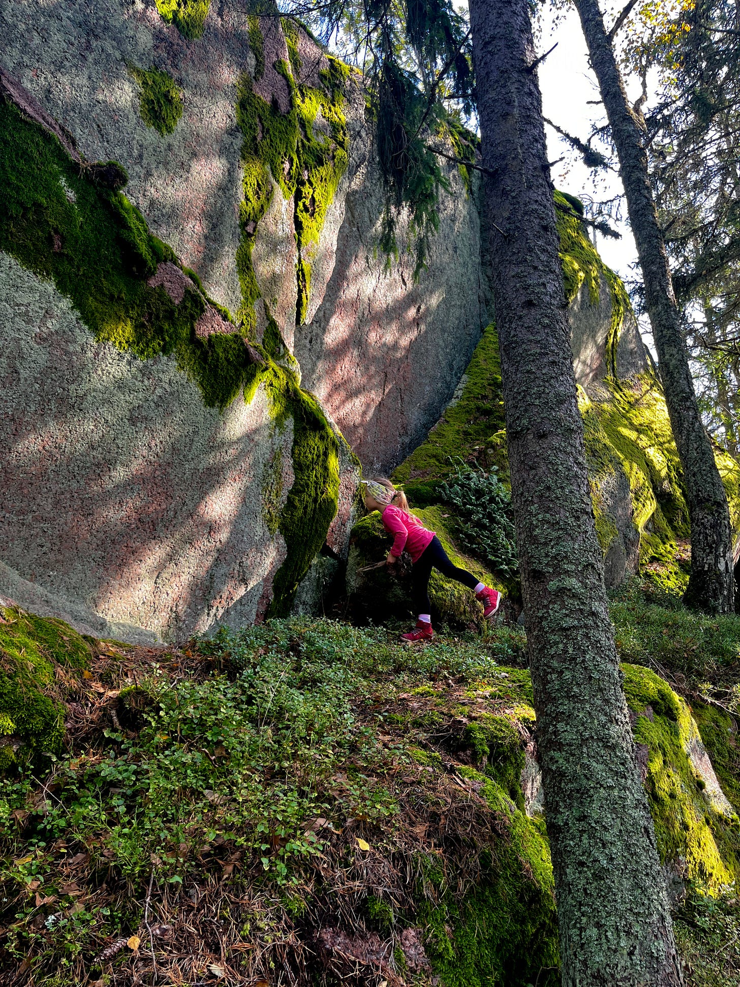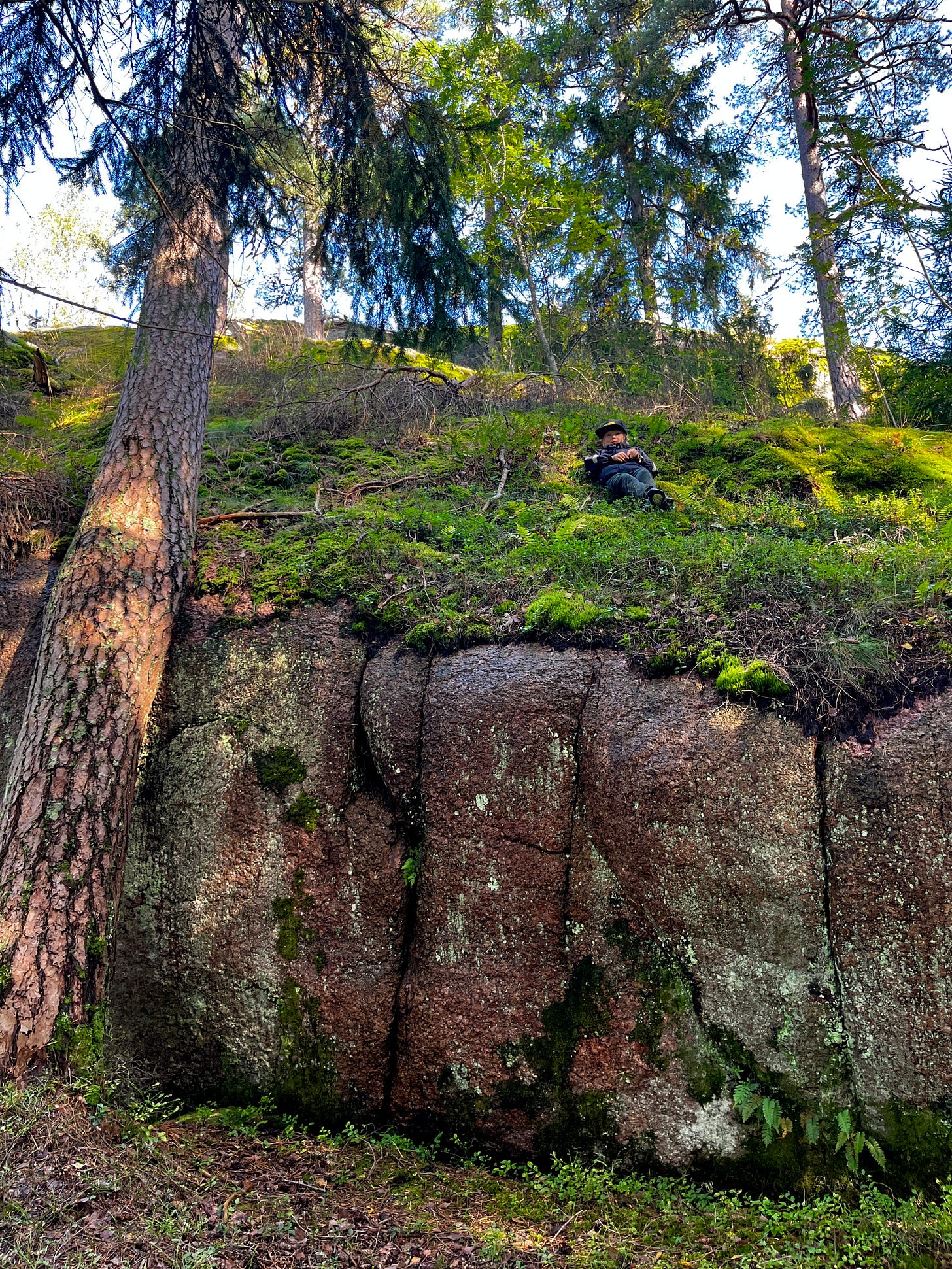 After we continued, we came to the sheer cliffs, where a green carpet covered the stone wall and the sun made it shine. Even though this was a northern coniferous forest, the moss on the cliffs looked like it belonged to a humid jungle, with delicate mats growing almost like algae. The cliff seemed to blush under the moss, as if shy and embarrassed for us to observe it so intently.