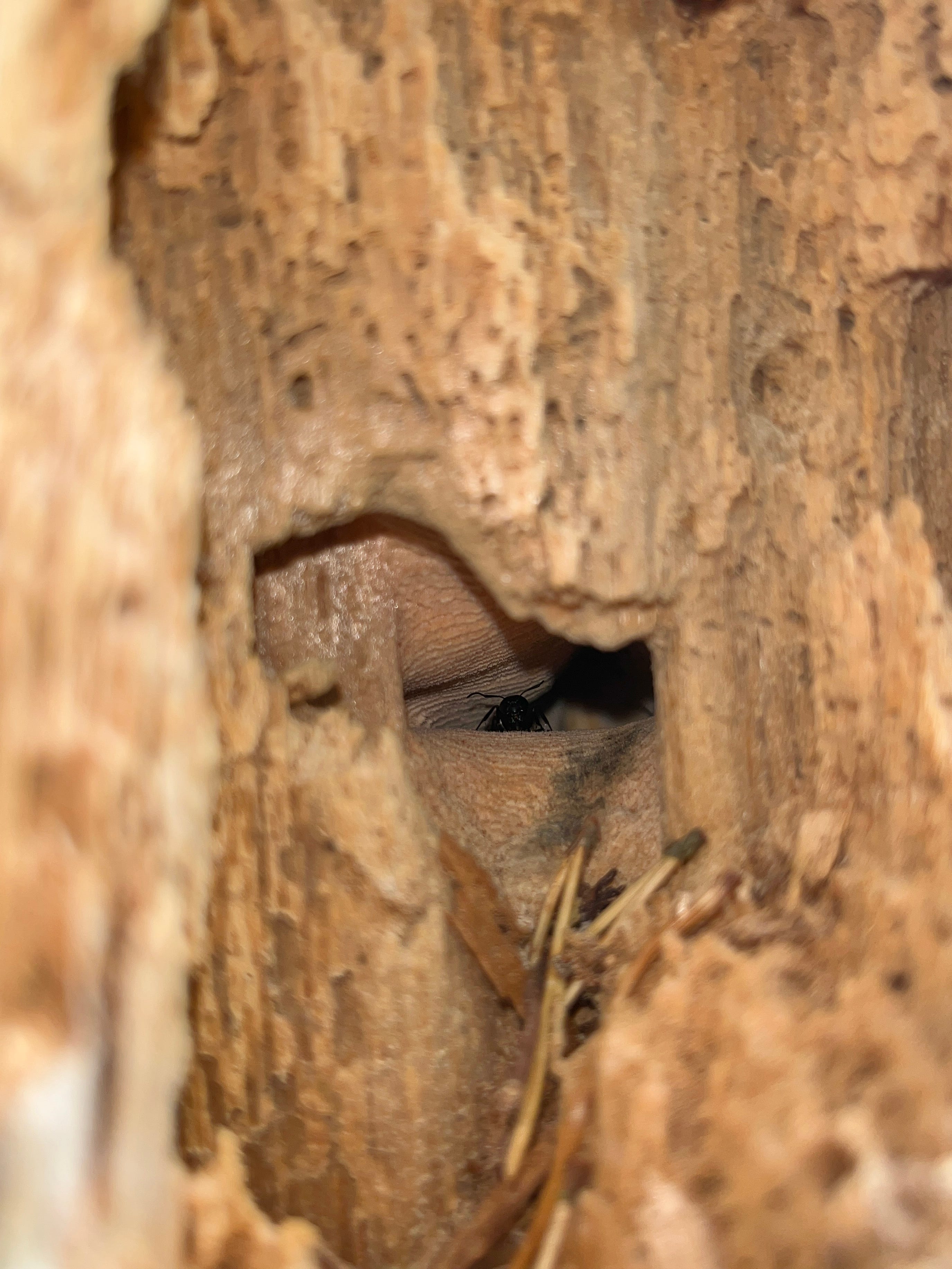 Lastly, I want to show you one more fun discovery we made. In this dead pine, we spotted a hole. I’m not sure who had the idea to peek inside, but there was something so sweet and funny. Three hercule ants (Camponotus herculeanus) were sitting in this beautifully carved round hollow, and just watching calmly outside as we peeked.