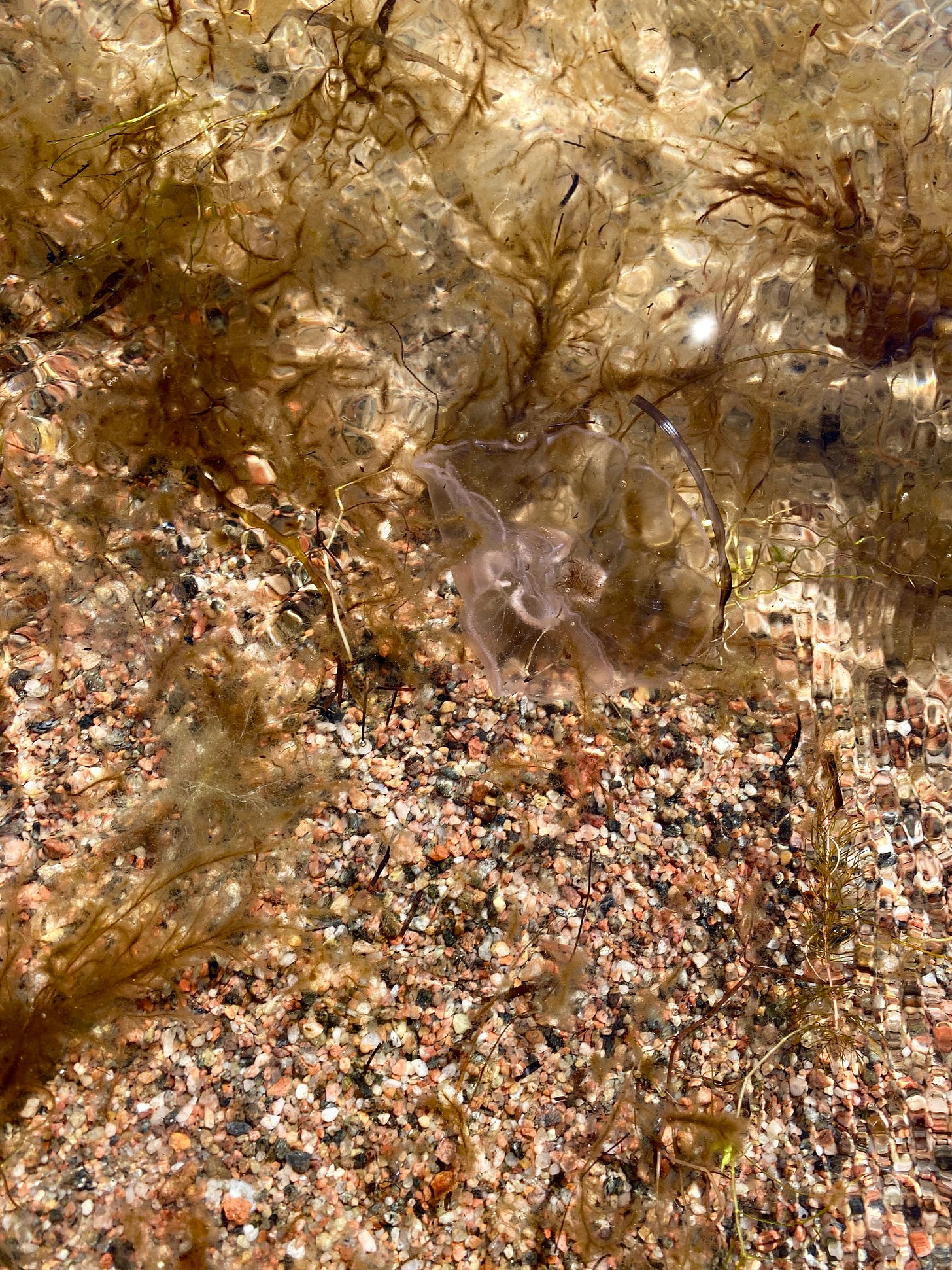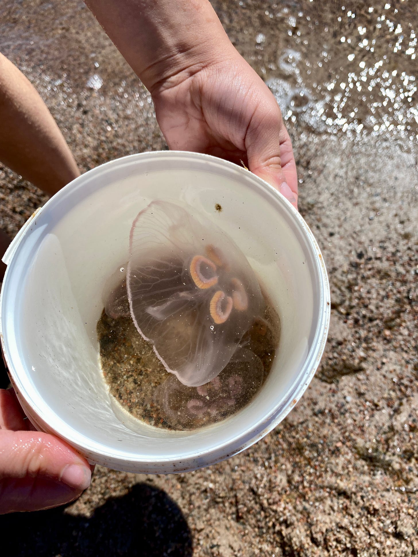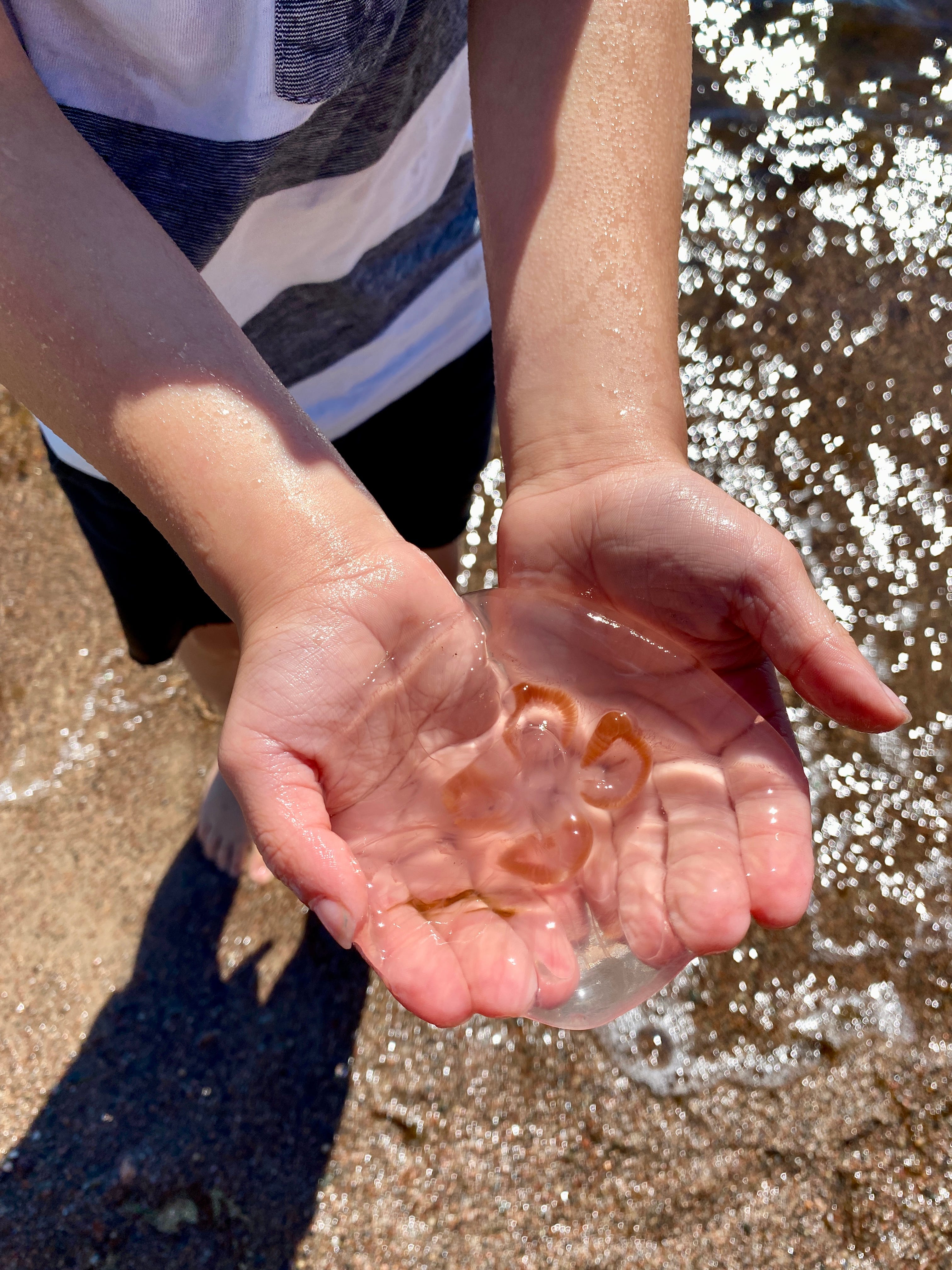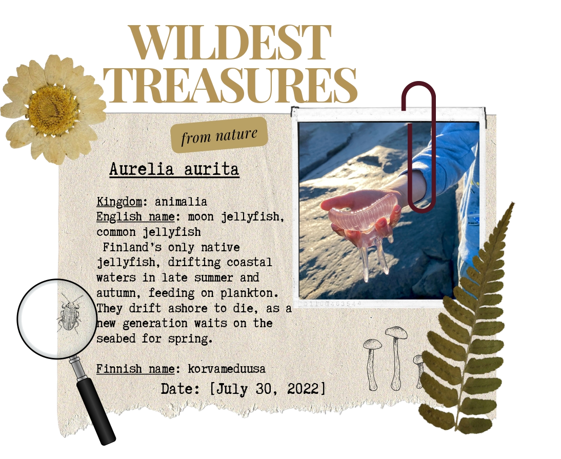 We see them regularly, but a few years ago we had an amazing encounter while vacationing in Hanko, the southernmost town in Finland. There were so many moon jellyfish. My son was thrilled — he lifted them into his hand. I let him catch one in a jar to take a closer look.