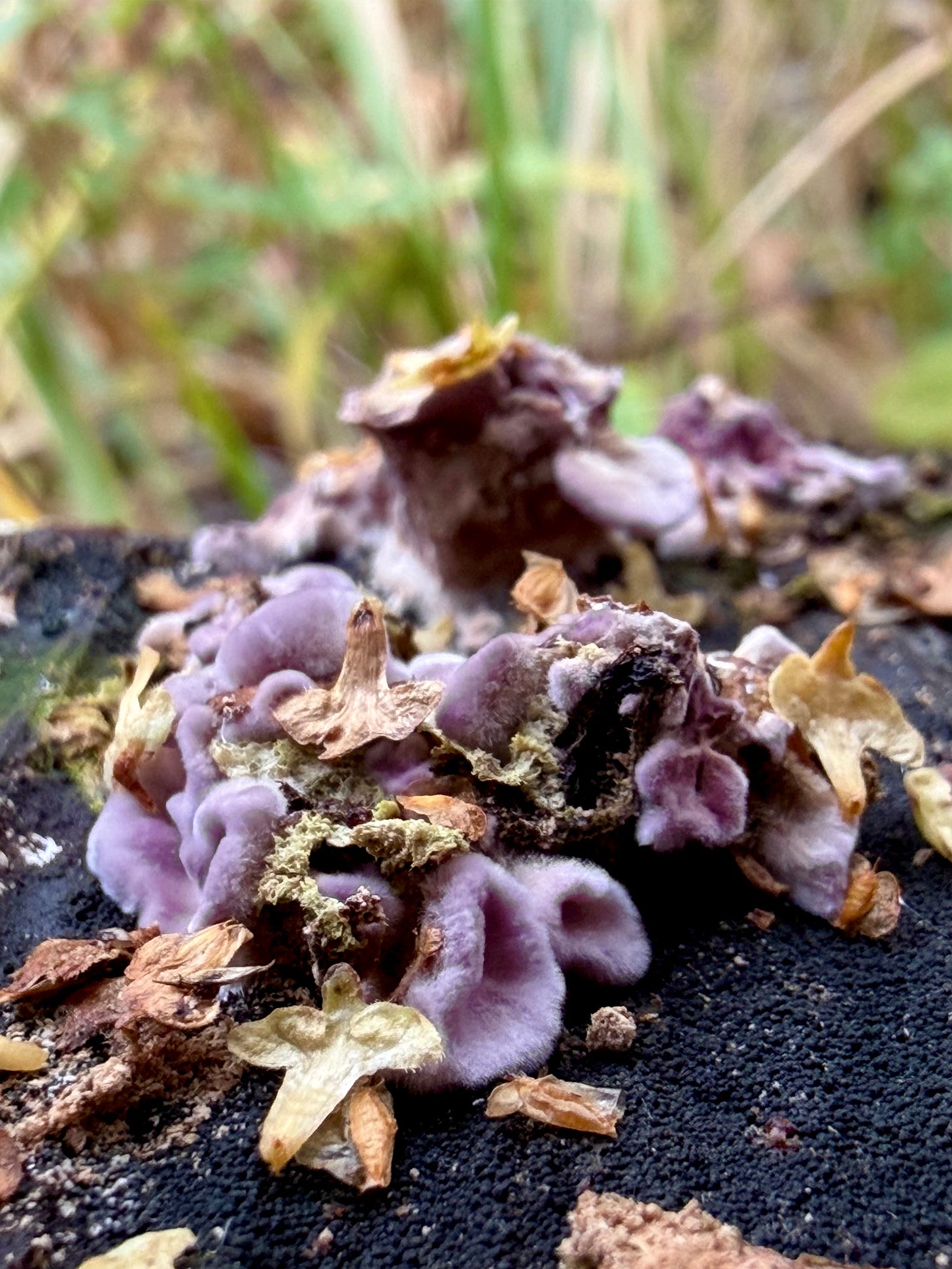 This mushroom woke me with its bright purple color when I was wading through the undergrowth. It was growing on a tree stump, and its surface looked slightly fuzzy, almost like it was covered with a delicate layer of soft hair.