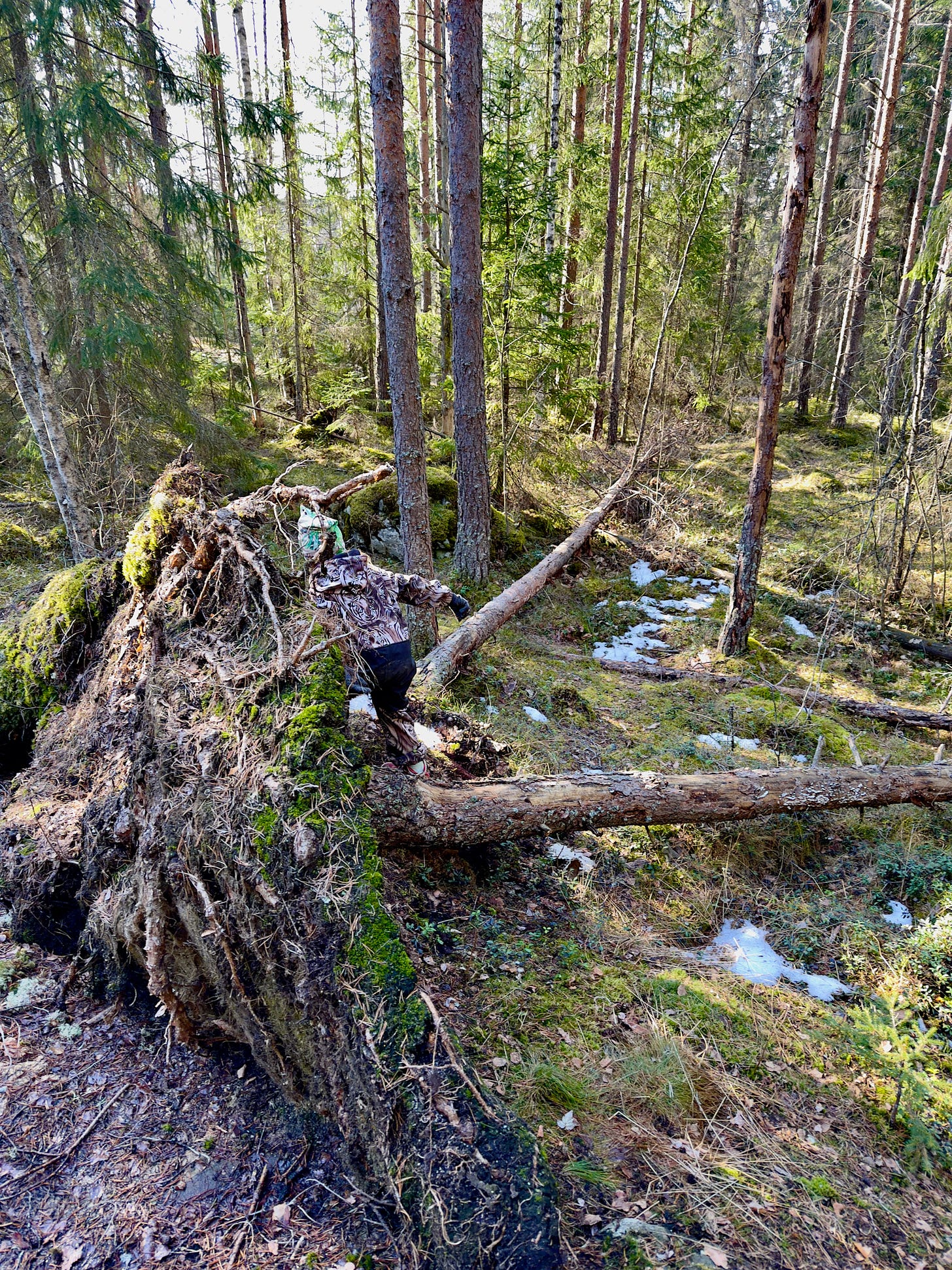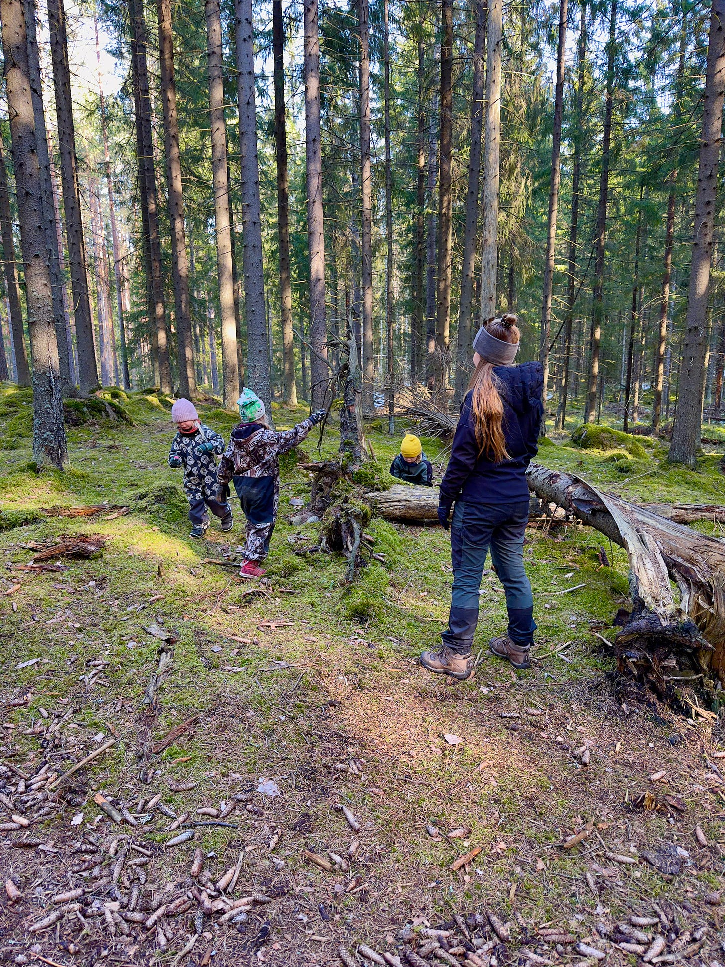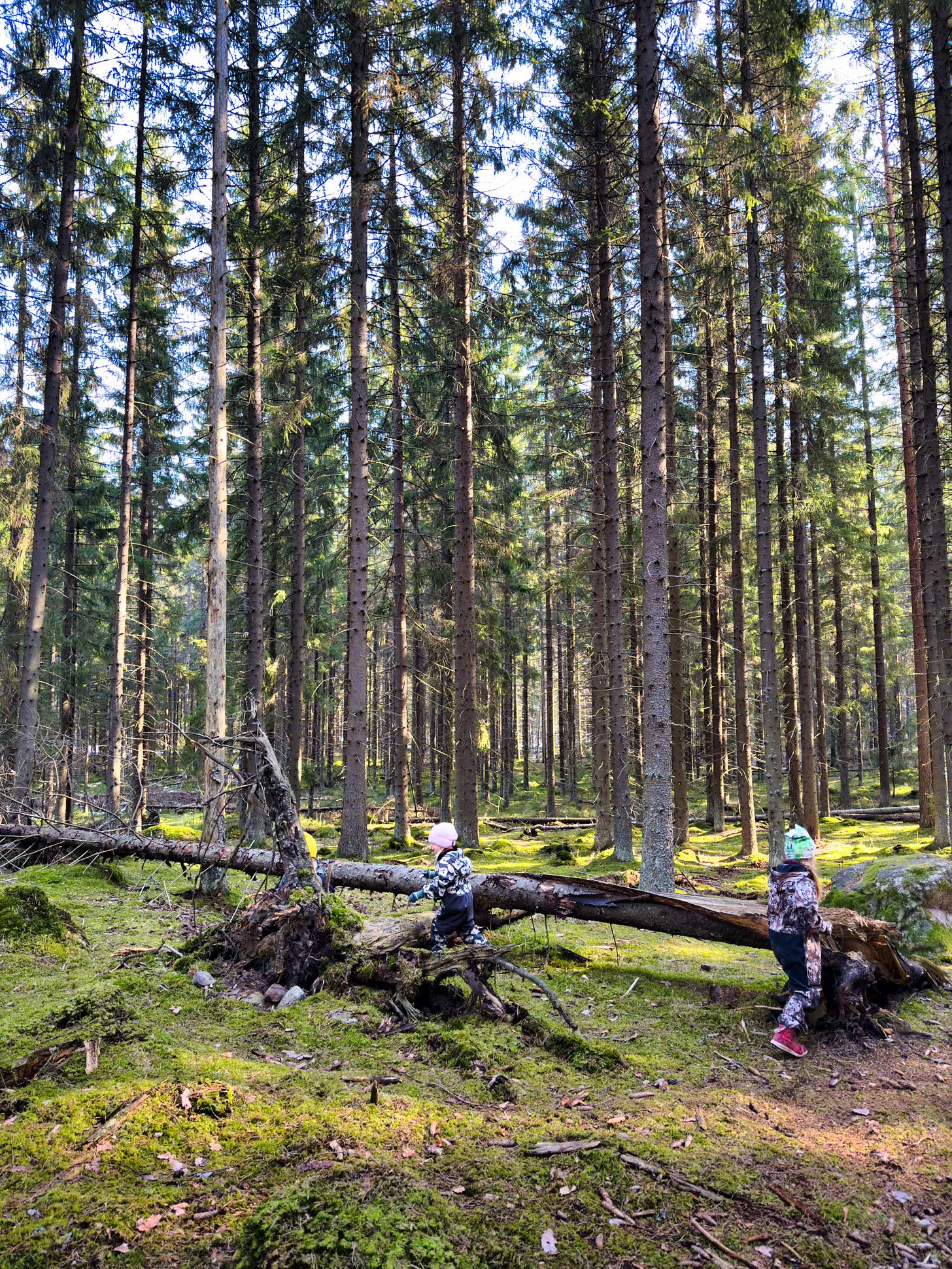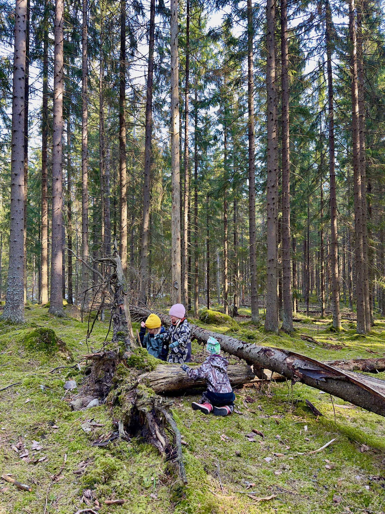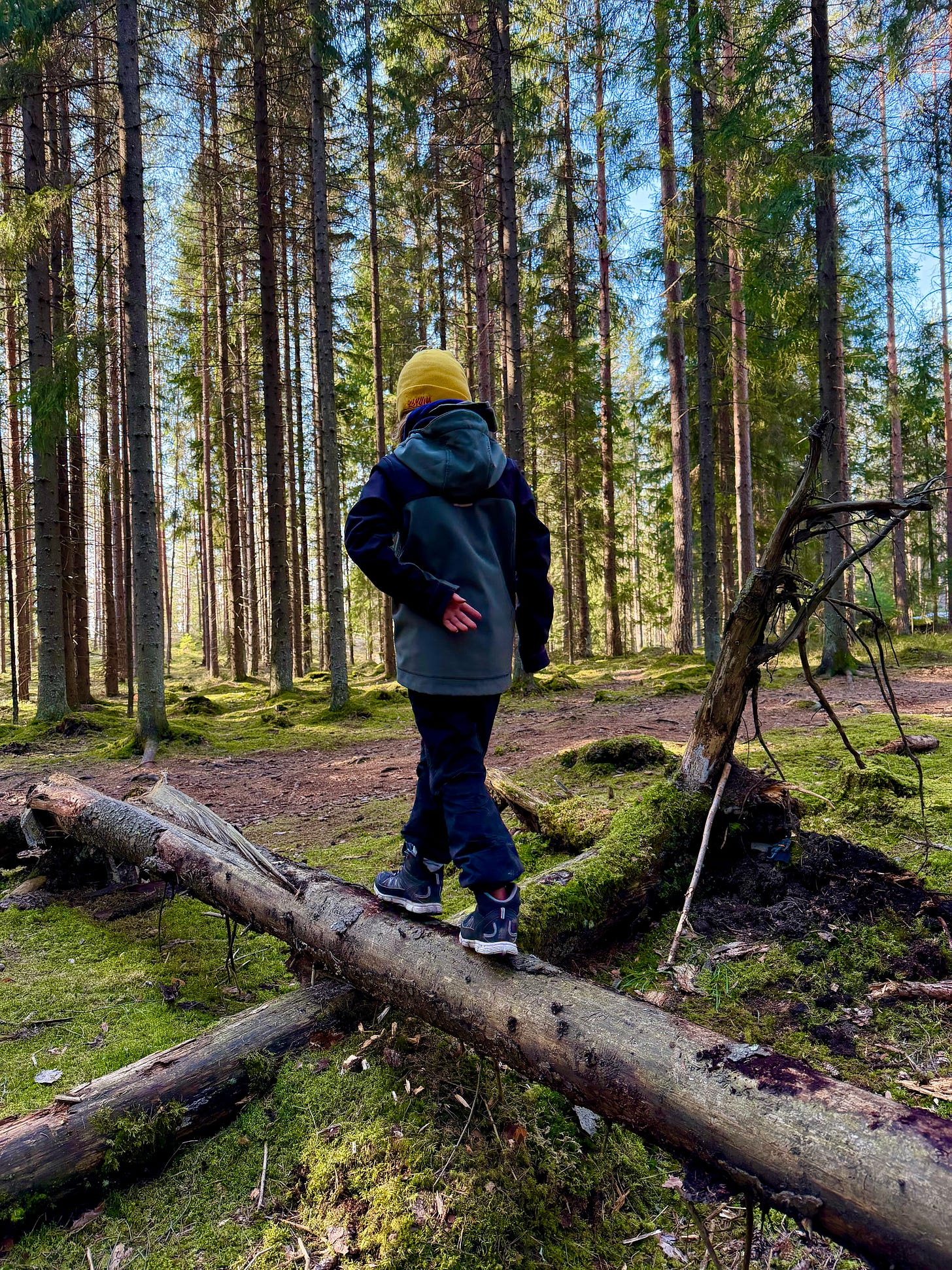 We also played battle beam game (Finnish: pukkitaistelu) on the fallen tree trunk, trying to knock each other off. It helps develop balance and is a lot of fun.
