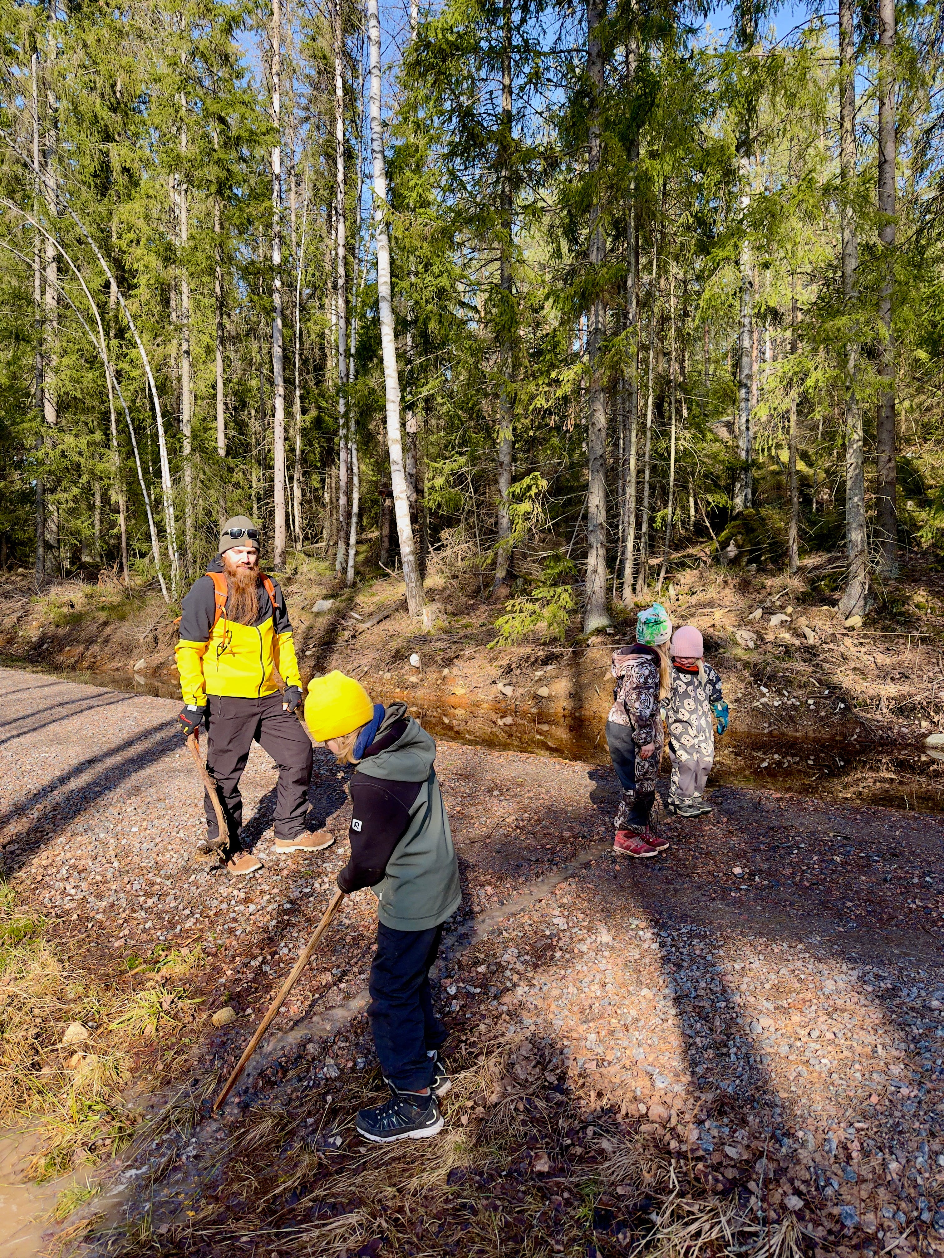 Then we reached a gravel road, and my partner and the children made a stream from a big puddle toward the ditch. The water flowed across the road into the ditch, and it was fun to place all kinds of natural materials into the flowing water and watch them float. They could have continued this play for who knows how long.