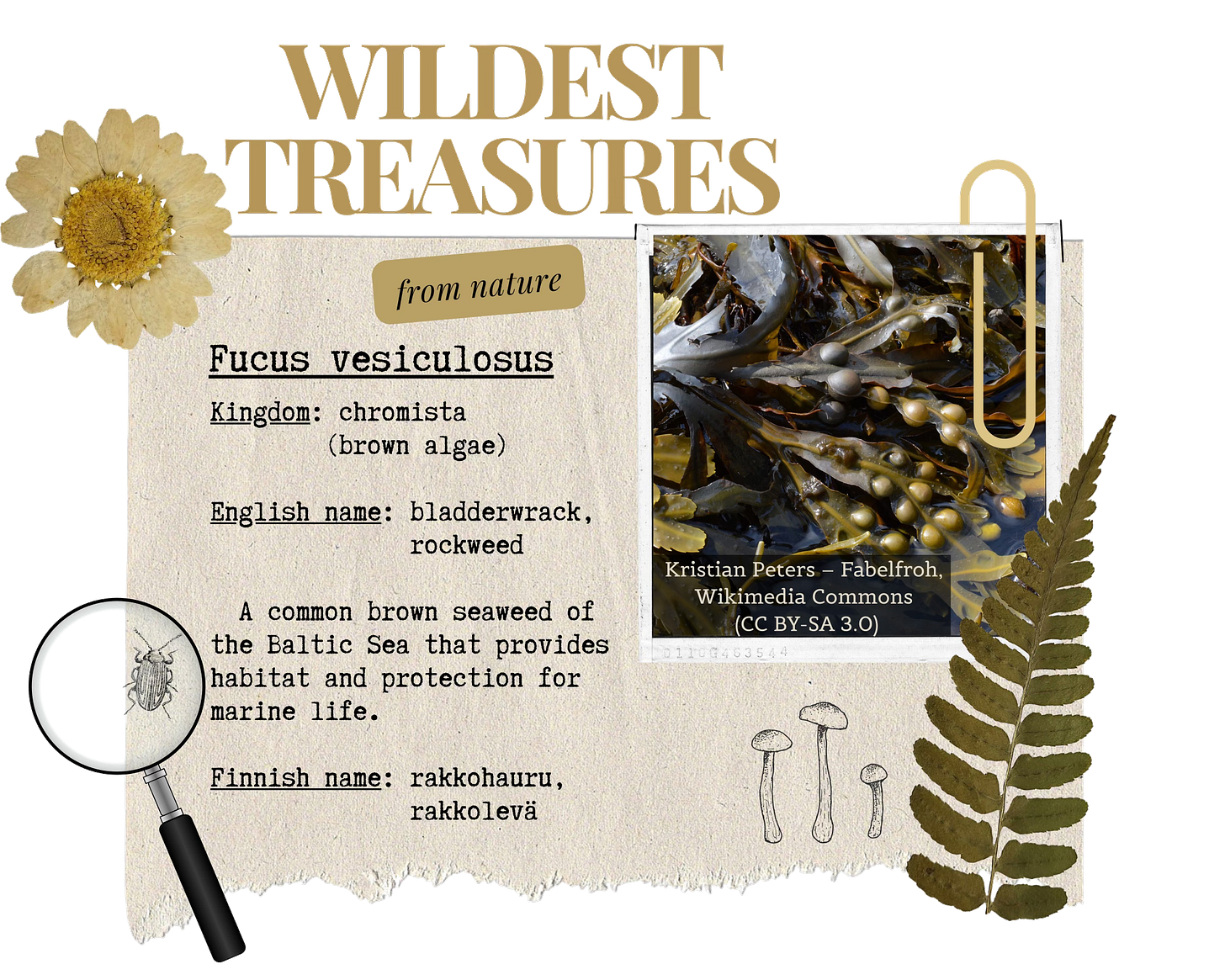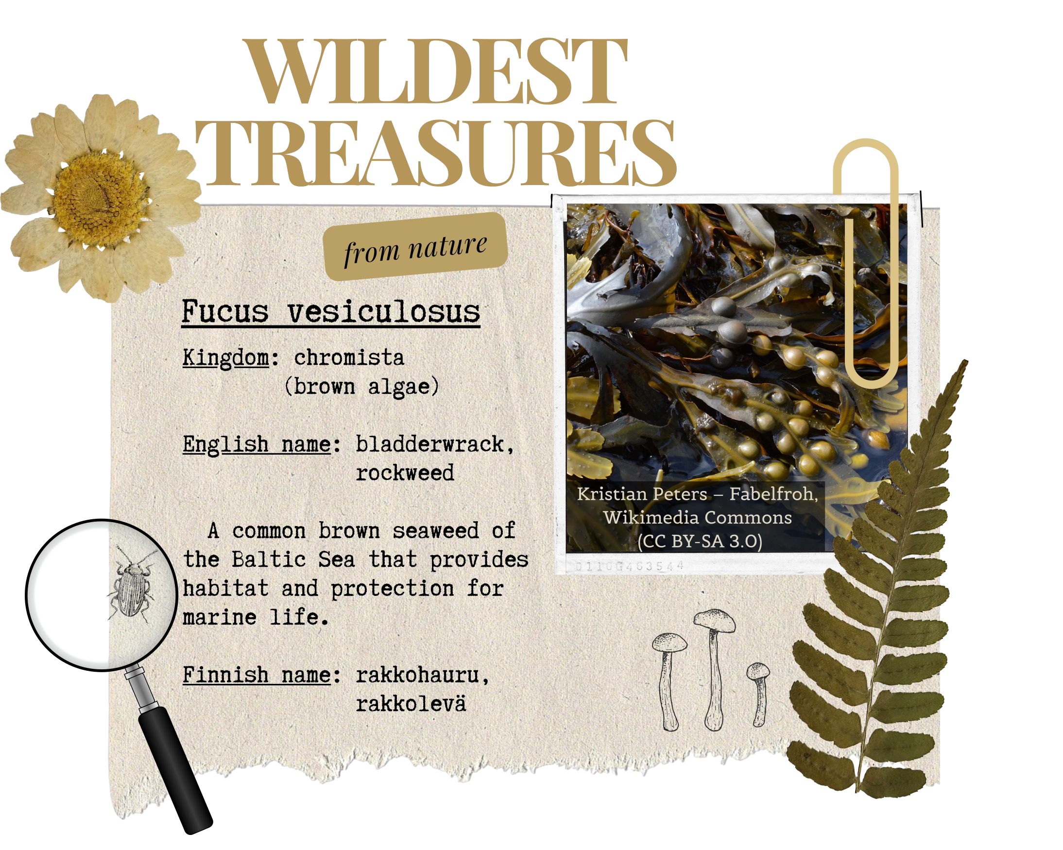 Bladderwrack once nearly disappeared from the Finnish coast, but its population has since recovered. It shelters young fish and countless small organisms — shrimp, amphipods, isopods, mussels, and sea snails. These, in turn, feed many fish species and coastal birds. Large amounts of bladderwrack washed ashore also play an important role as egg-laying sites for grass snakes.