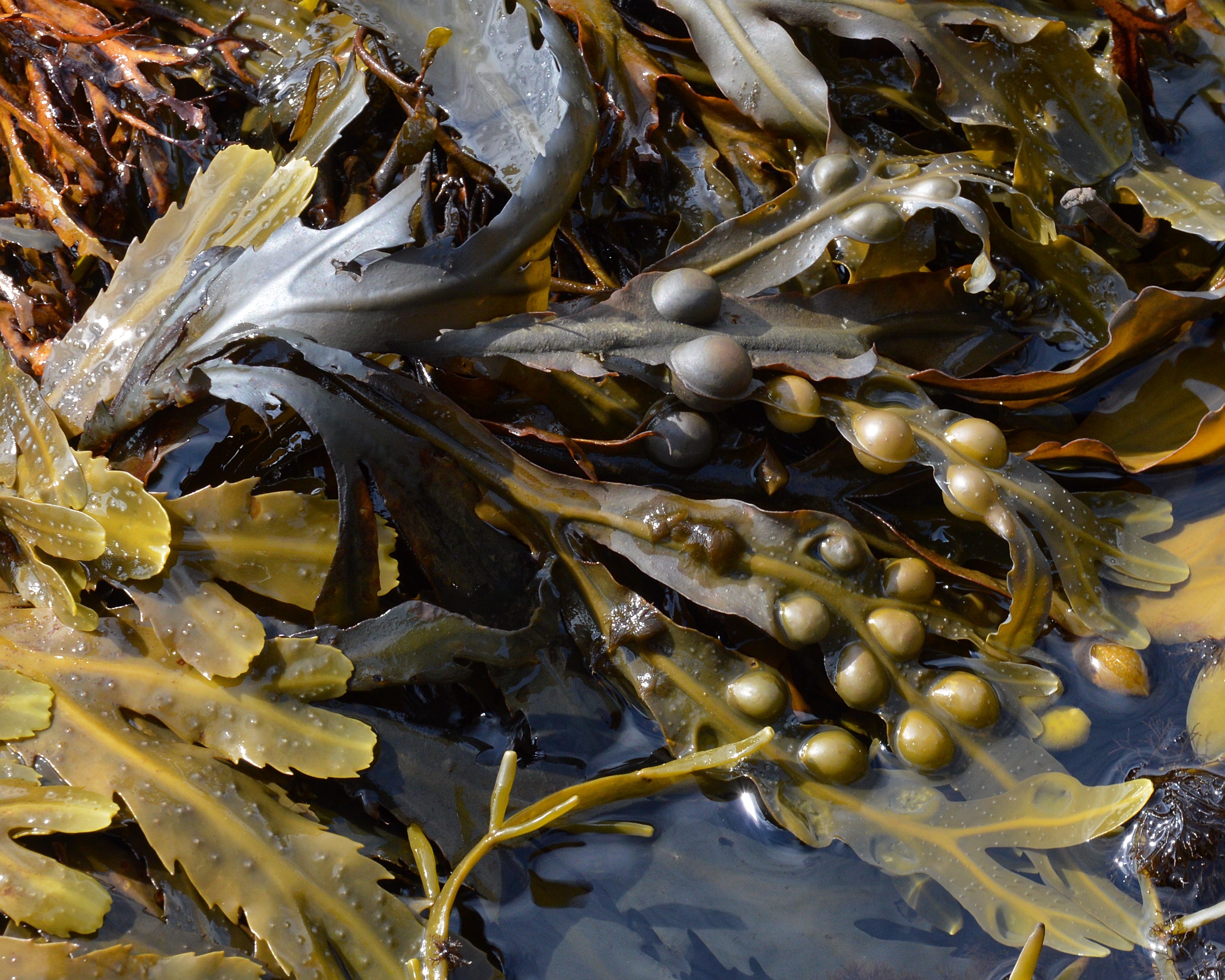 Bladderwrack is a species of brown algae with tough, olive‑green fronds. It has a leathery texture and contains air-filled bladders that keep it floating toward the surface. It can live at depths of up to 10 meters, although it is most commonly found at around 2.5 meters.