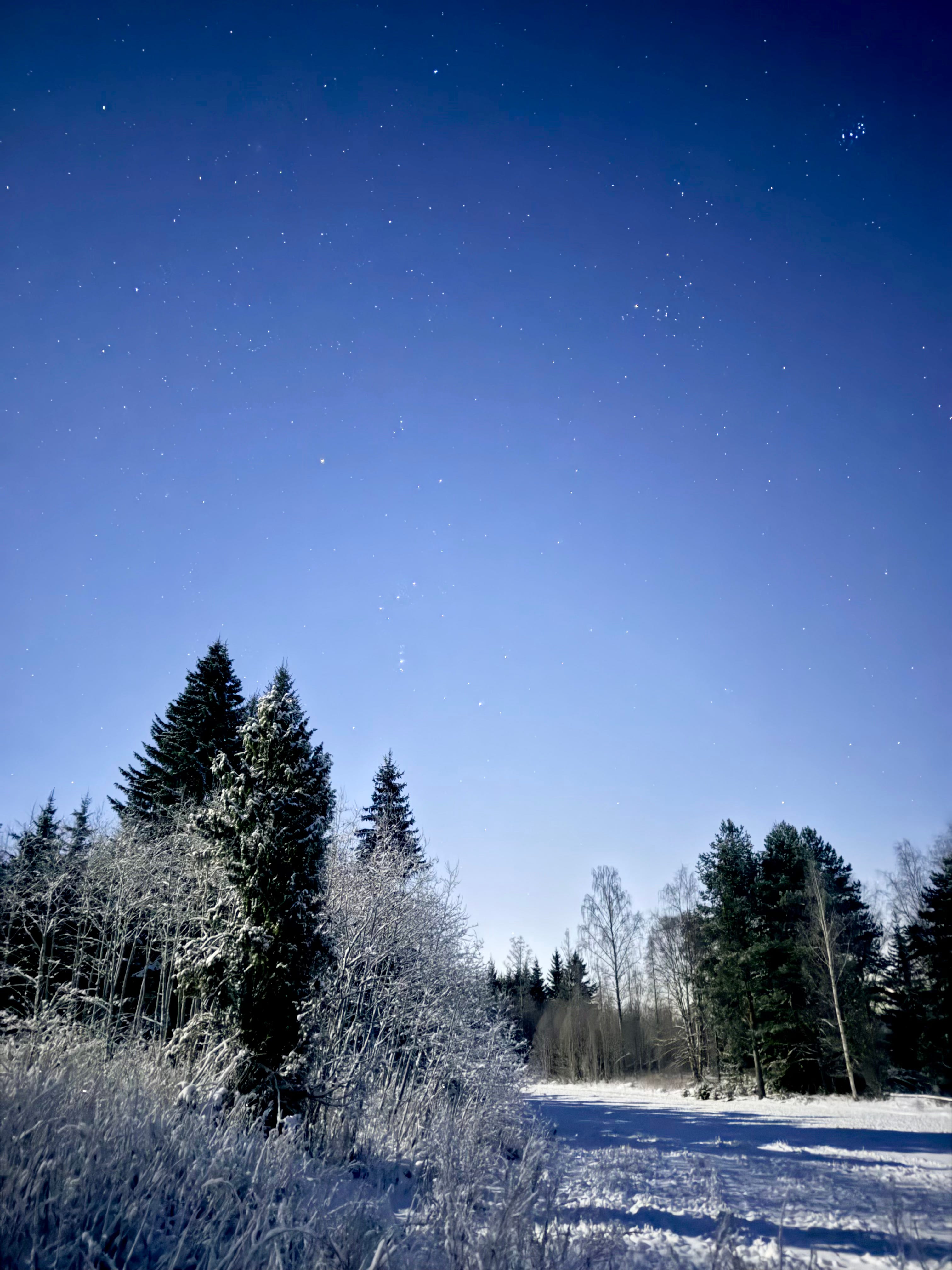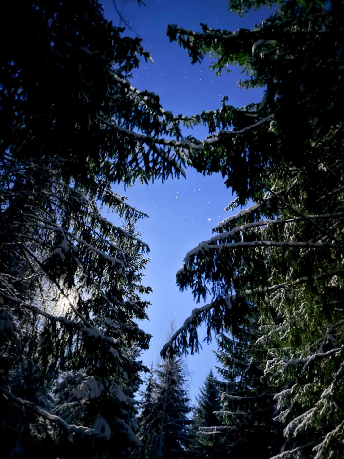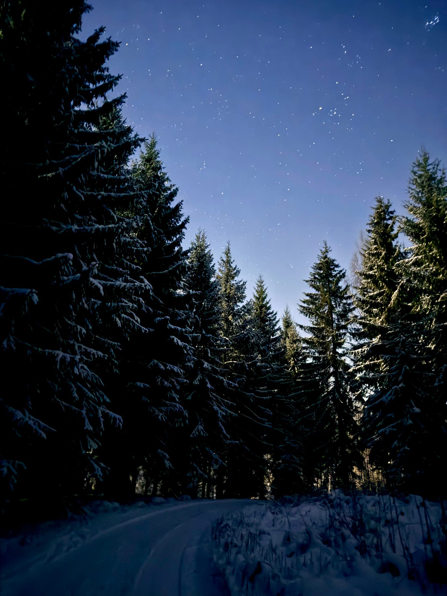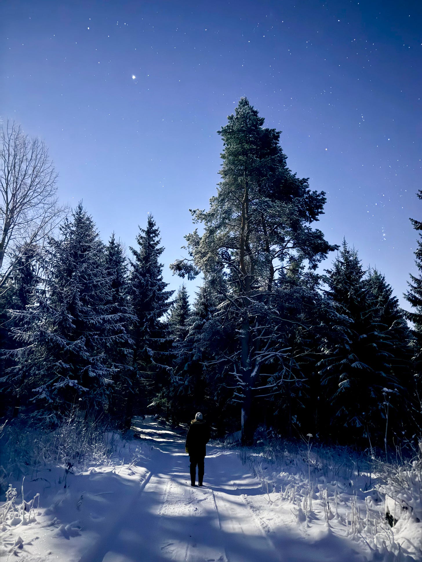 The snow crunched beneath our feet as we set off walking along the forest path. The moon hung high in the sky, illuminating the sparkling snow with its bright glow.