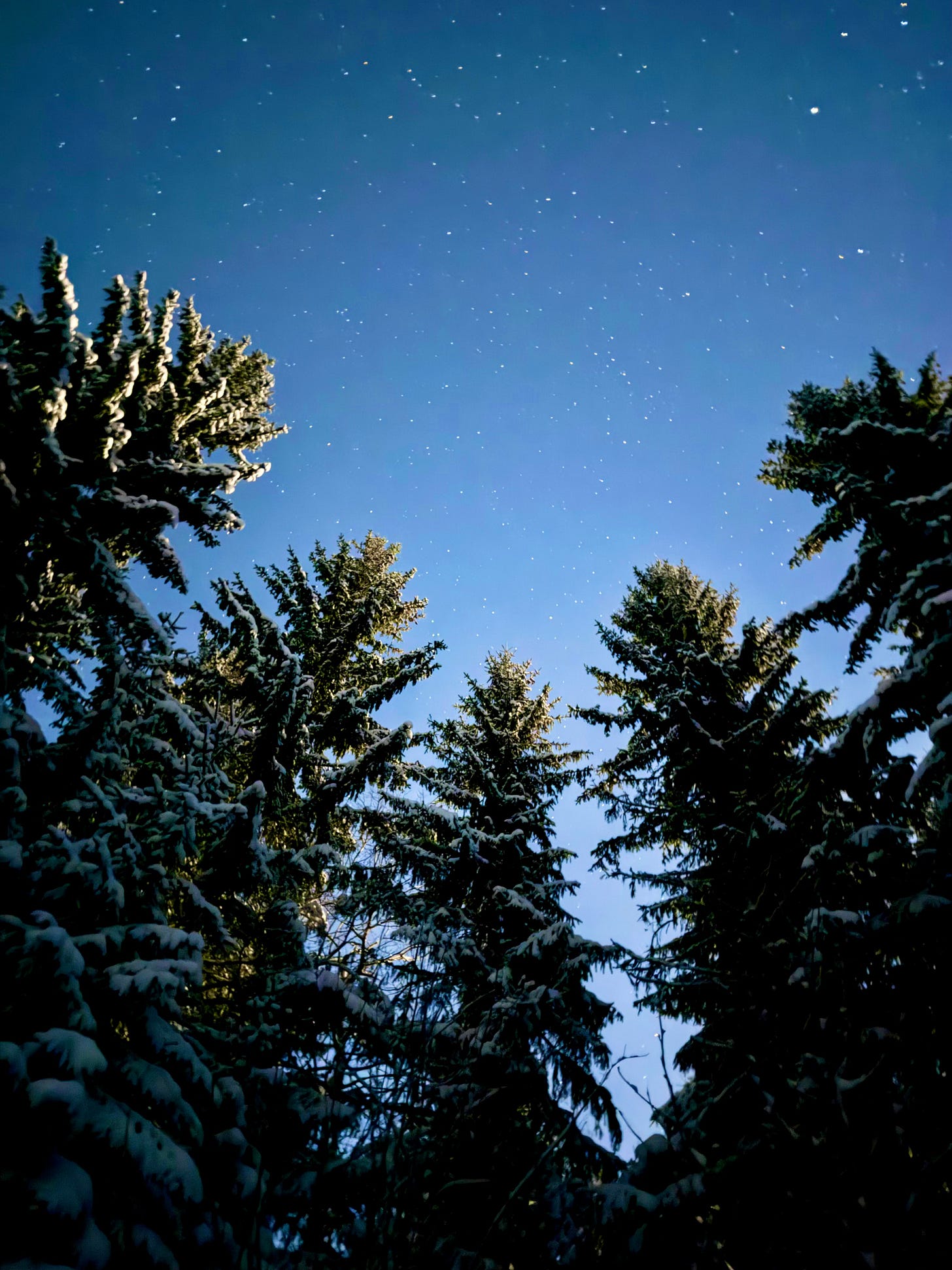 We saw many constellations on our night walk. In the photo above, Orion is visible in the center, just above the top of the spruce. Orion’s Belt consists of the three stars in a straight line, and the row of stars below them forms Orion’s Sword. In the upper right corner of the image, the star cluster is the Pleiades, also known as the Seven Sisters — in Japan called Subaru, which is where the car brand gets its name and logo.