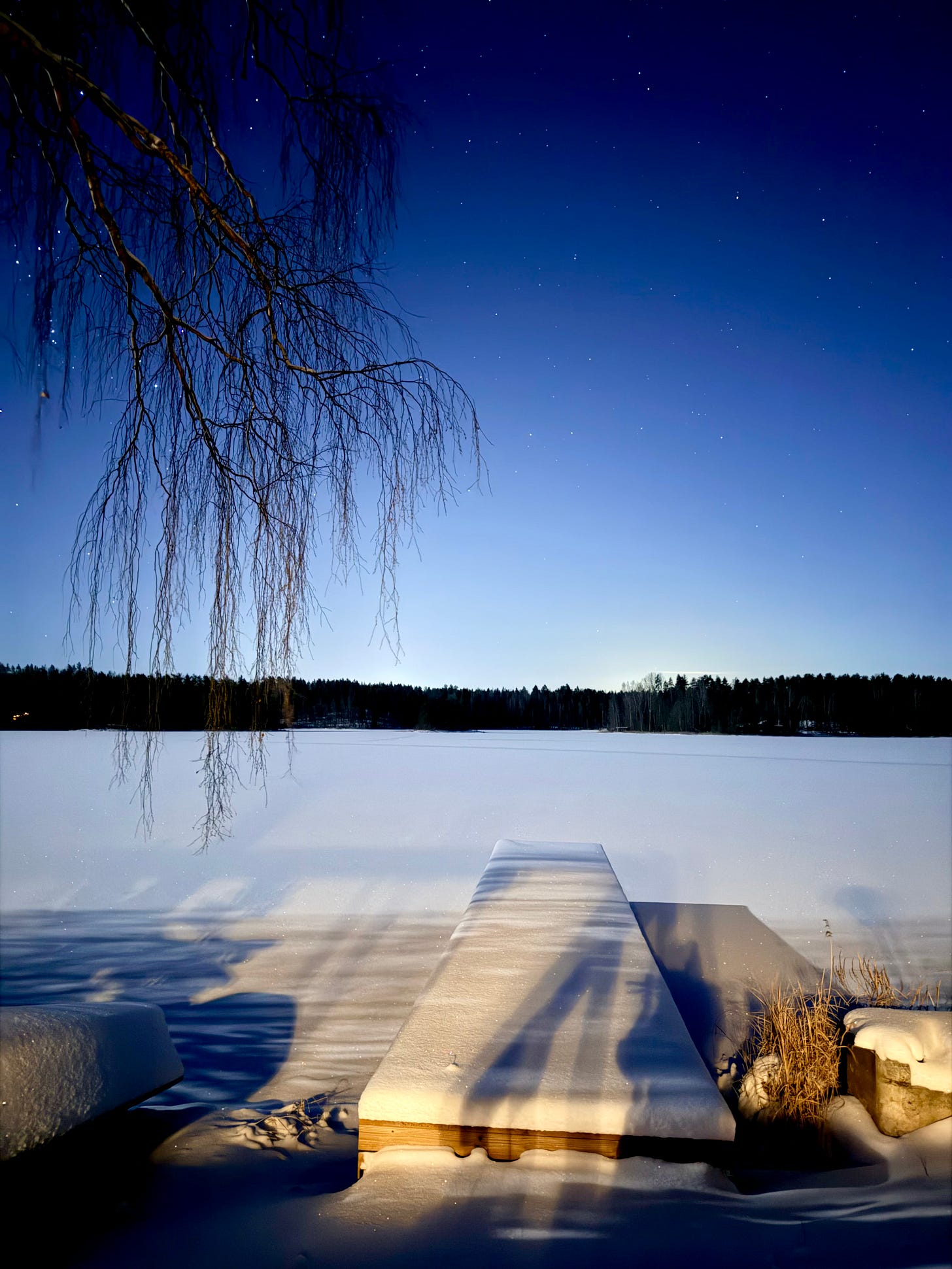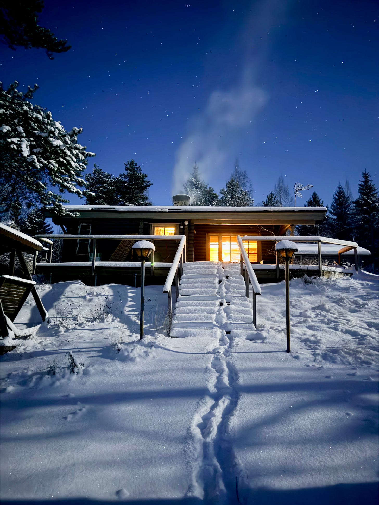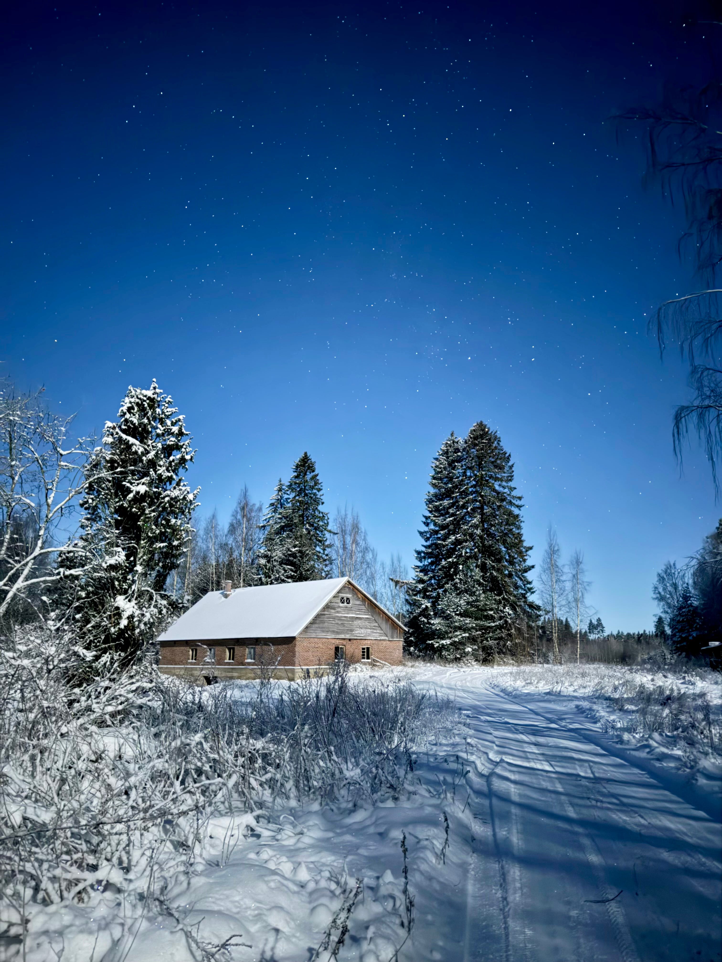 Some time ago, my partner and I went to the cabin just the two of us. We arrived late in the evening, lit a fire in the fireplace, and went for a walk in the clear, freezing night.