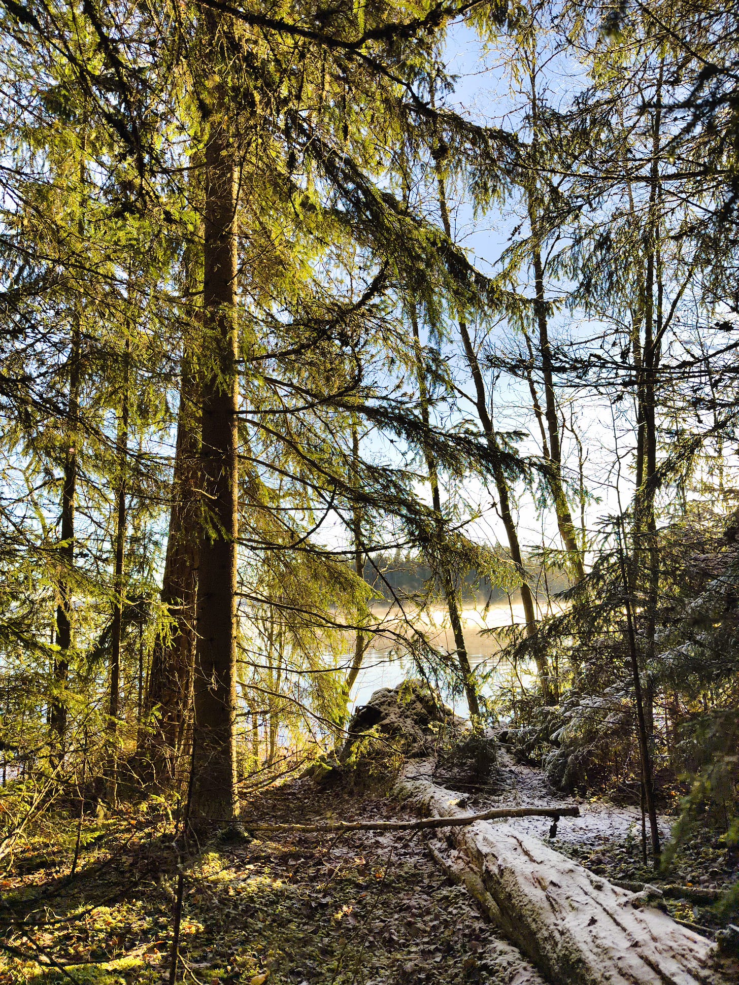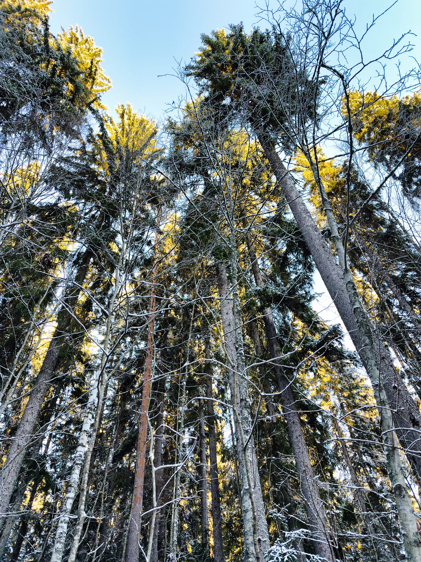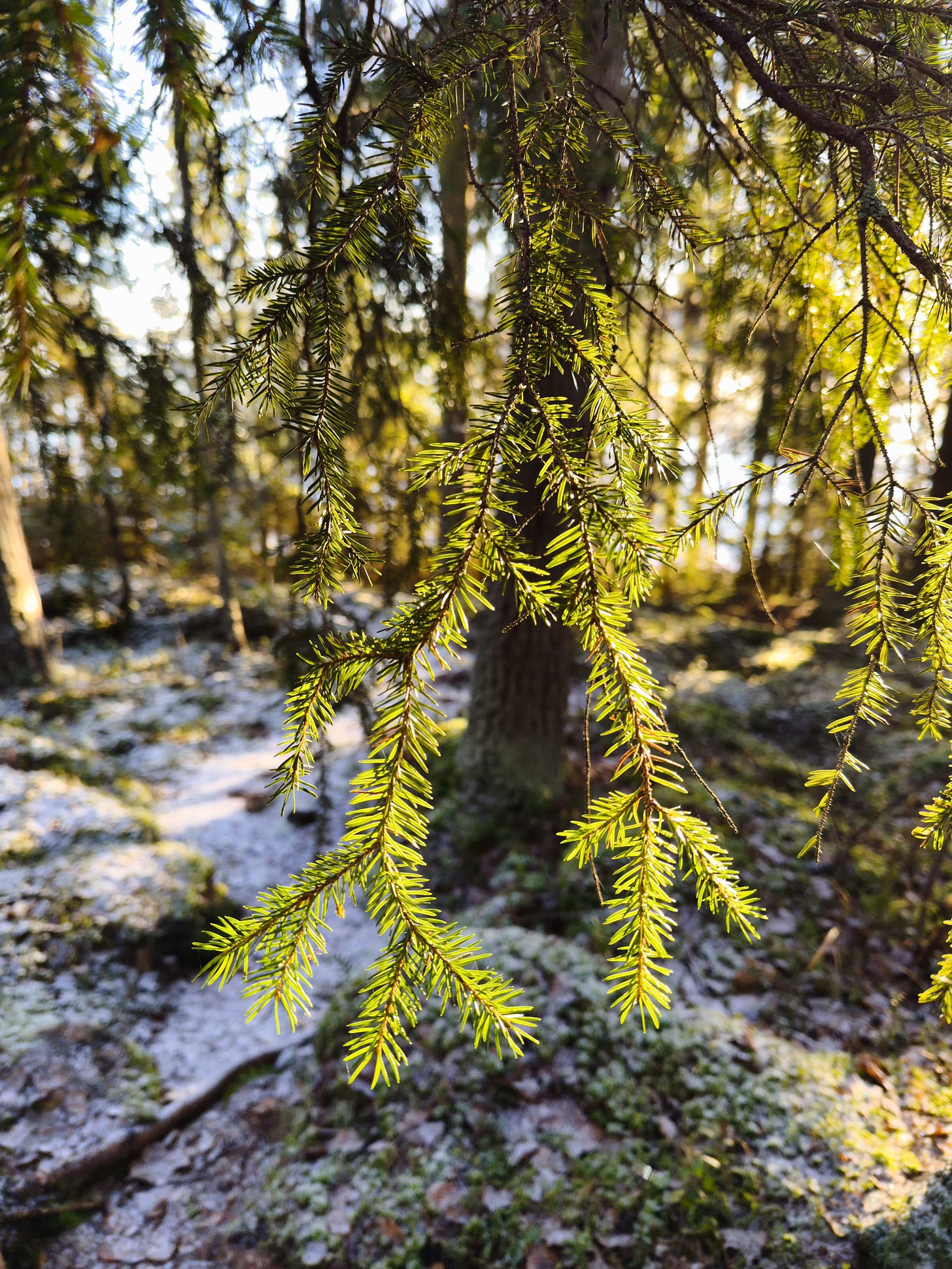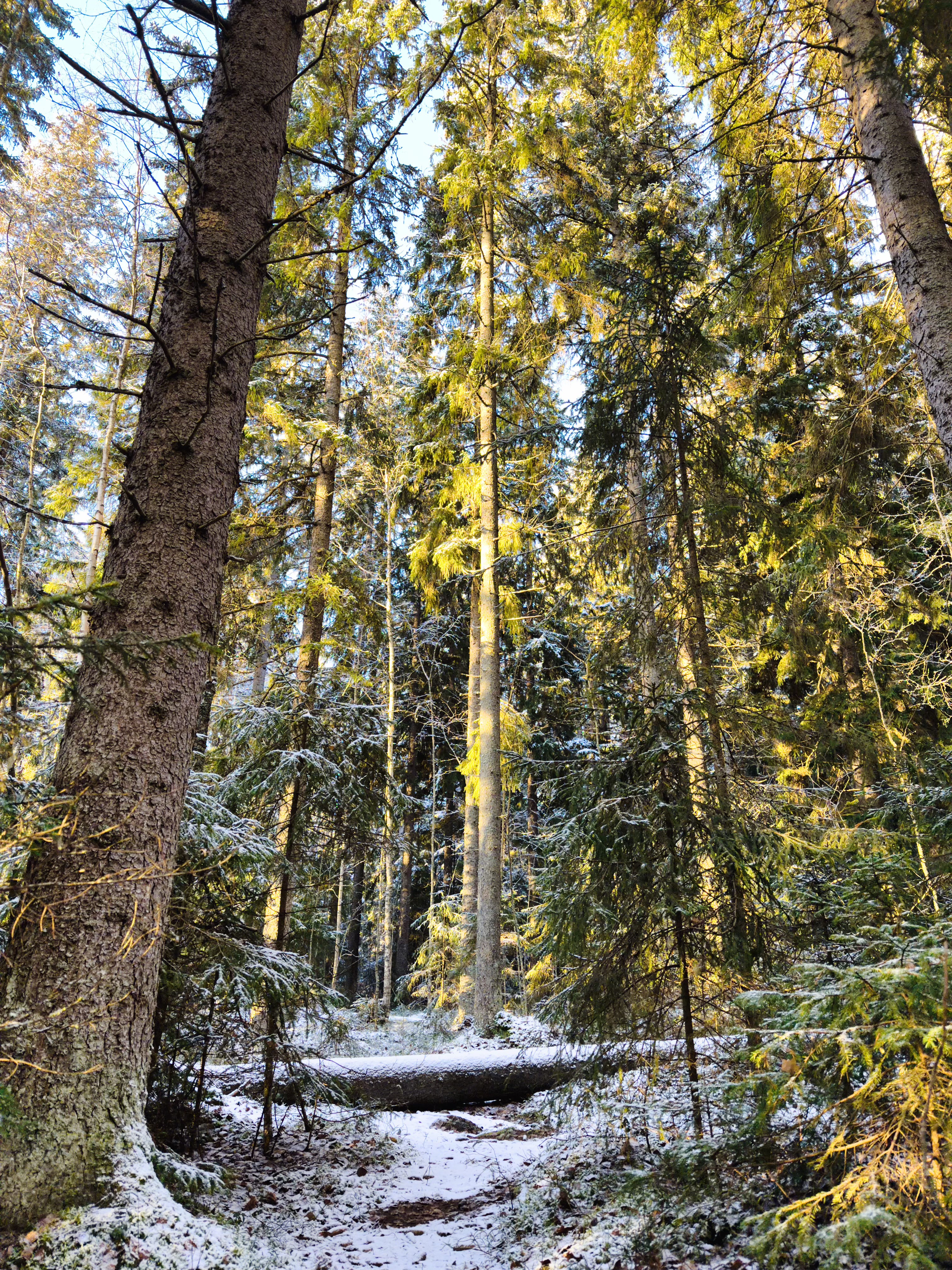 The sun illuminated the treetops, turning them a bright, deep green. A dusting of powdery snow adorned the spruce branches. Everything was silent, as if the world had stopped when the snow arrived—like someone had pressed pause on everything.
