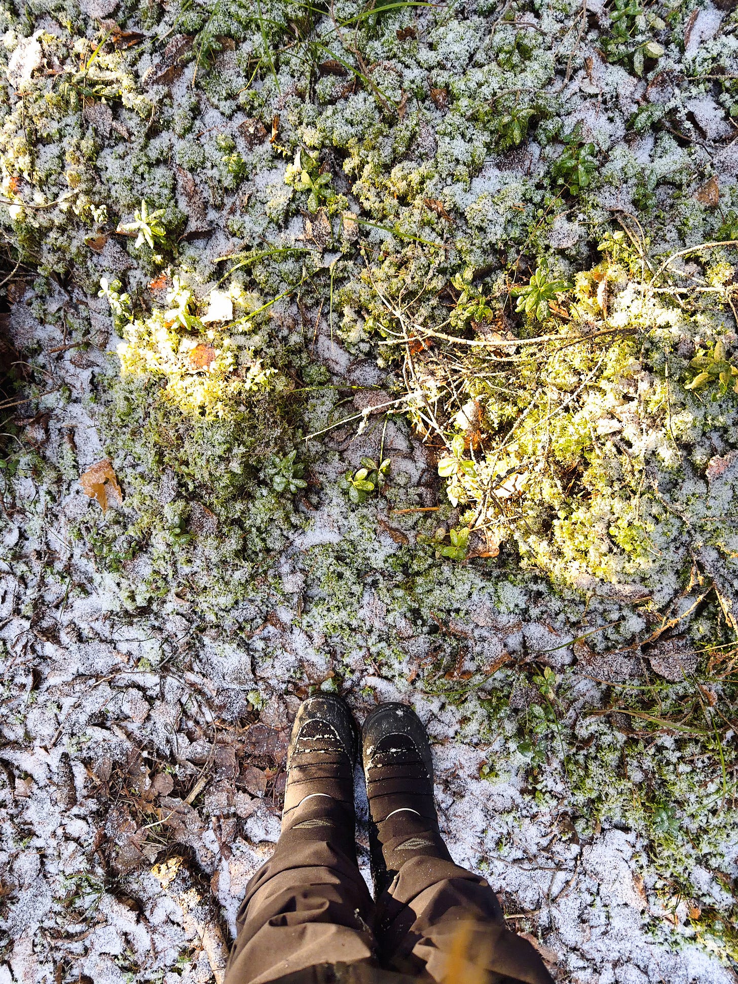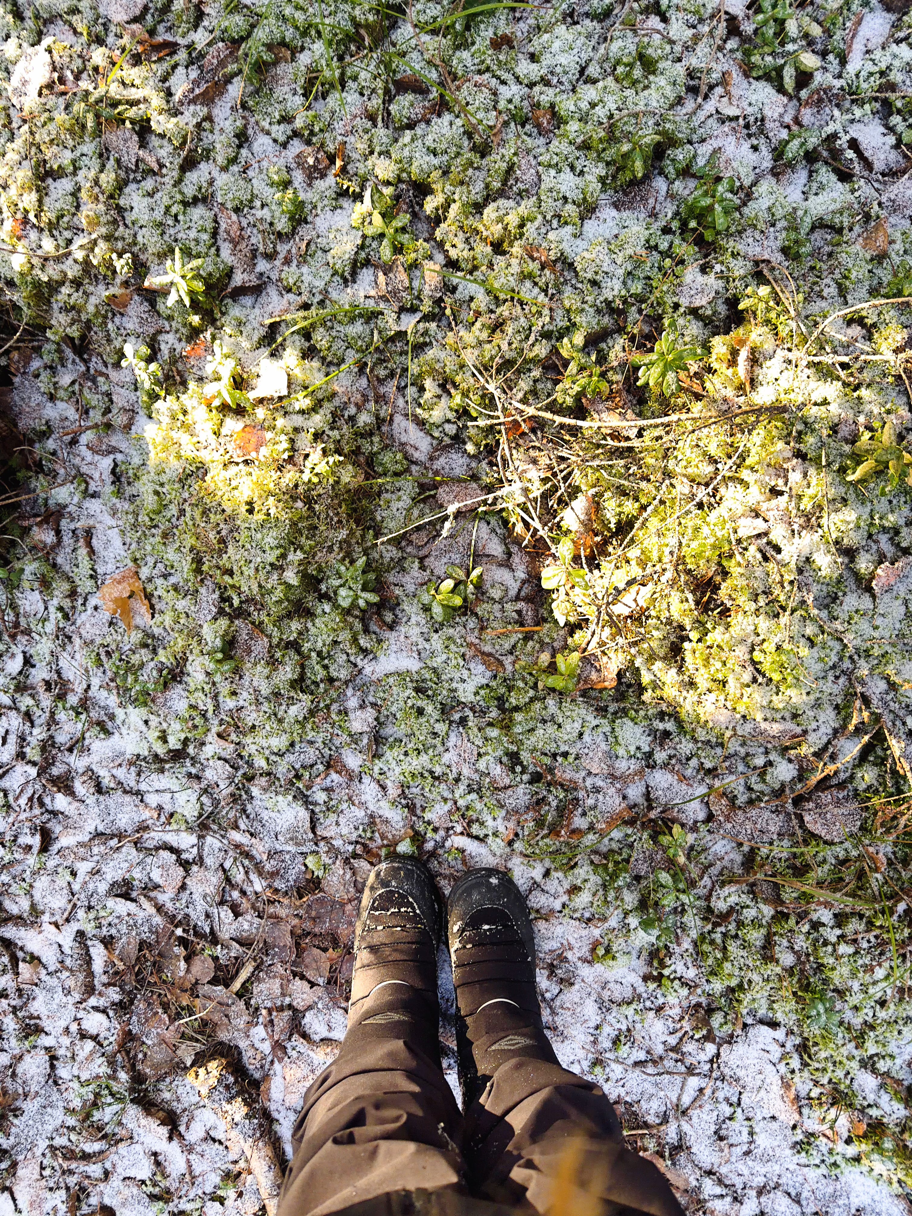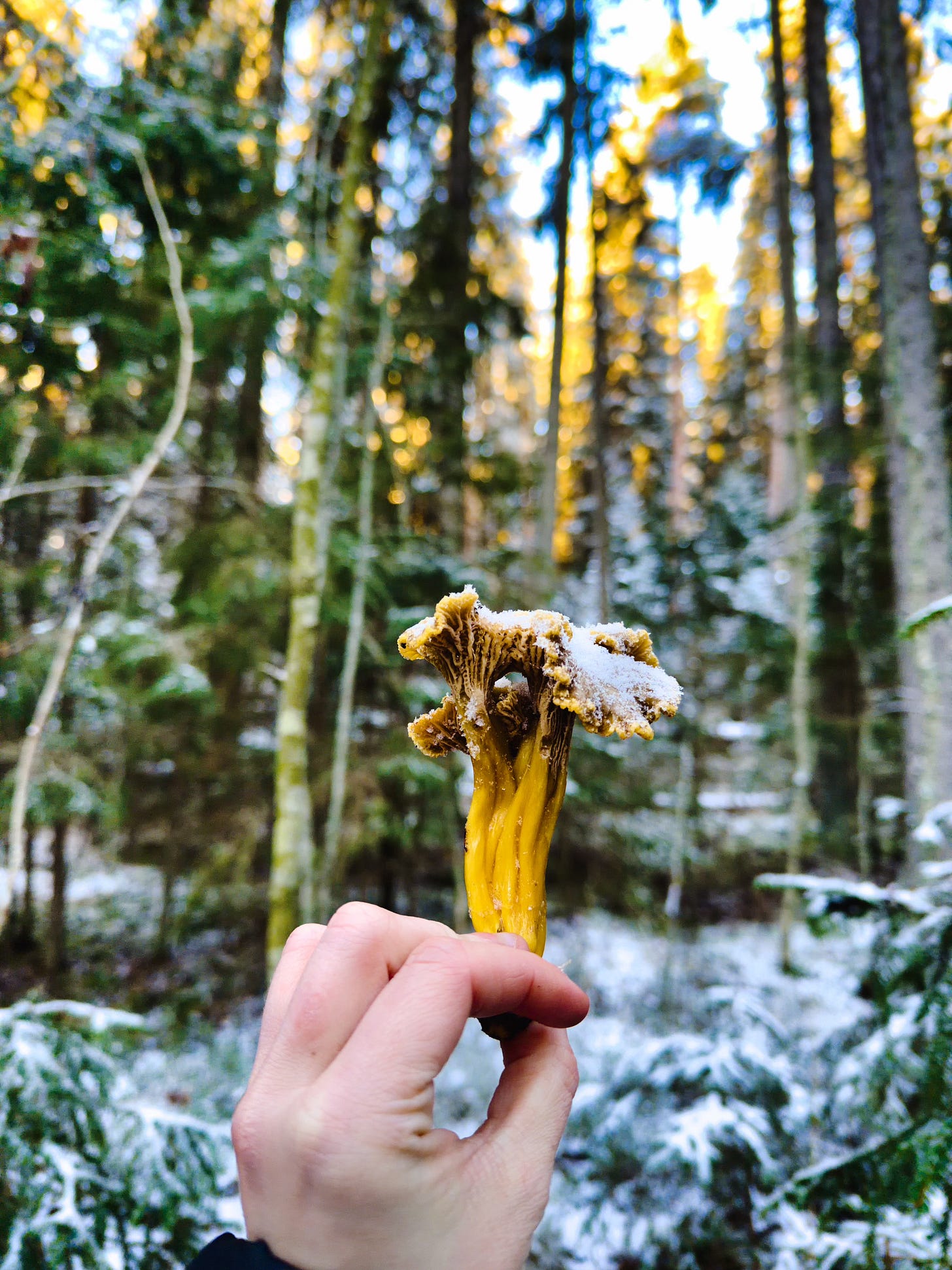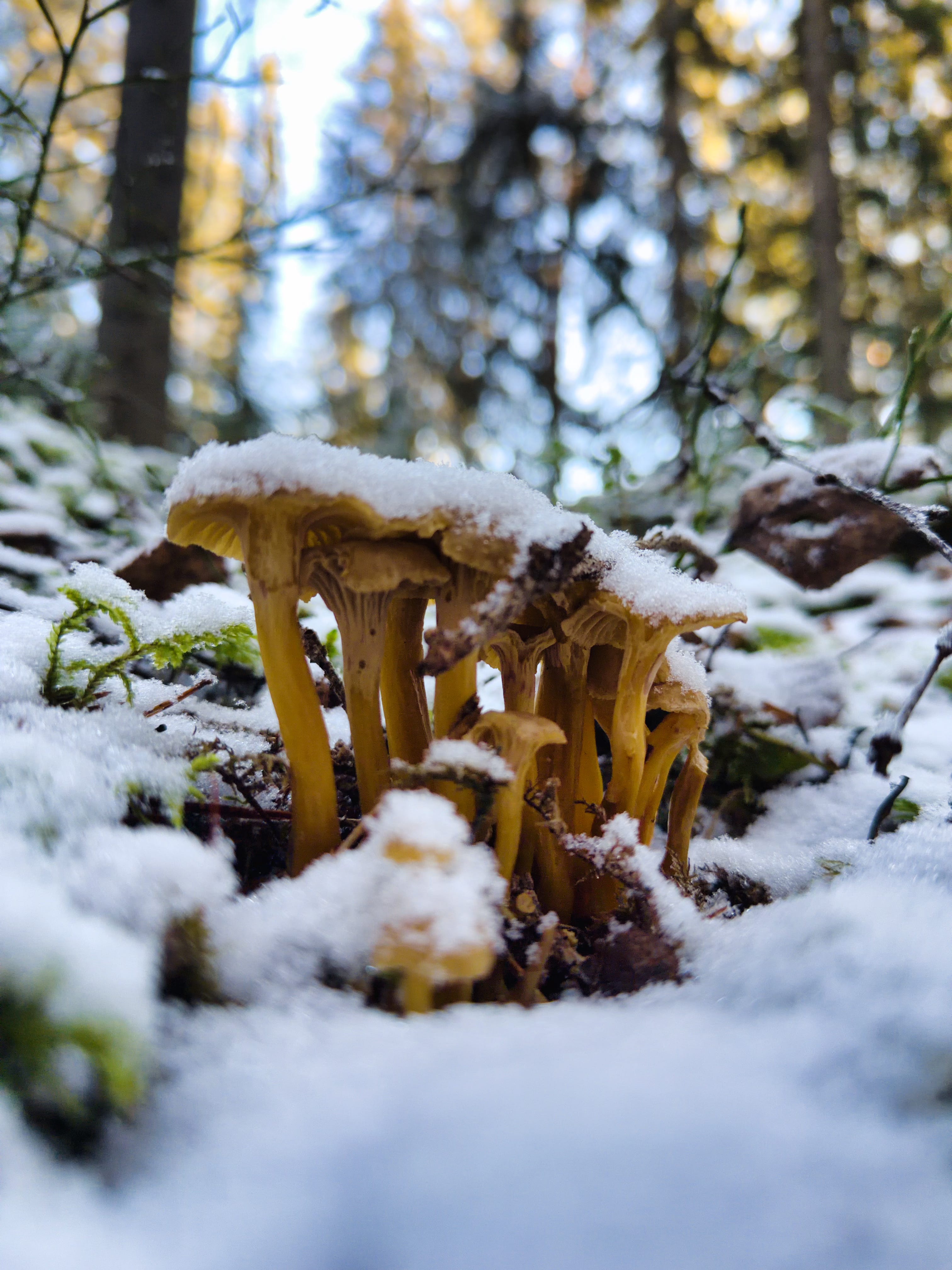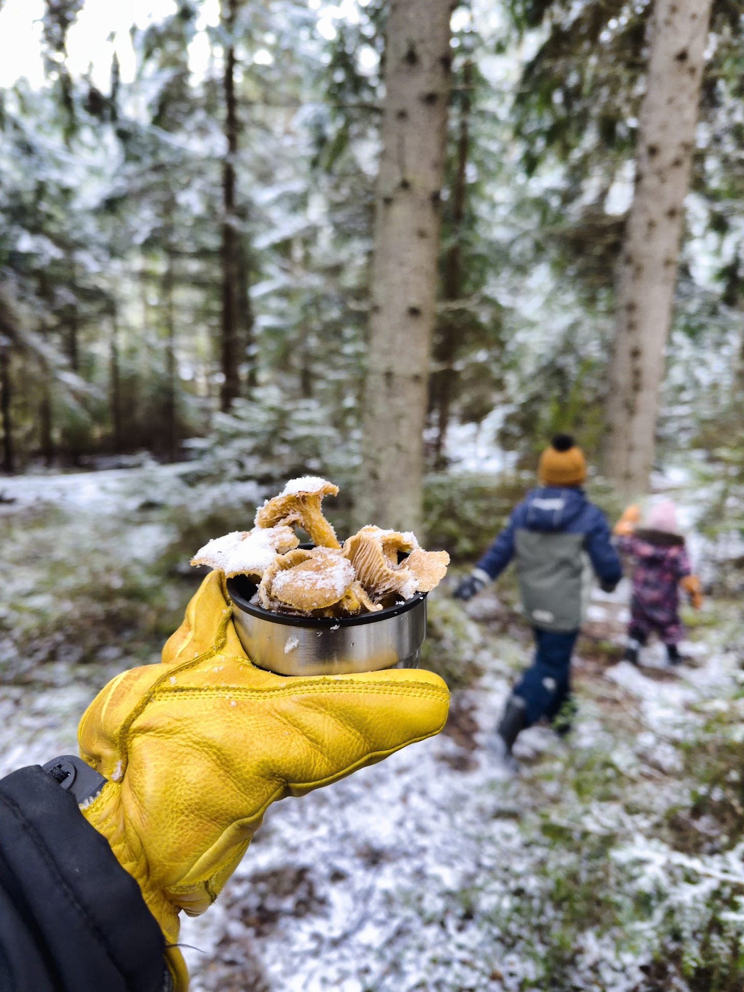 Then it was time to head back to the cottage. While we returned through the cold and frosty forest, 5yo found winter chanterelles. They were entirely icy. Excitedly, she collected them all into two thermos cups.