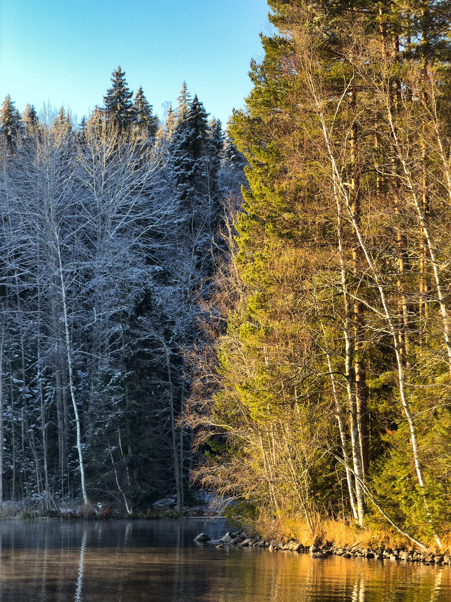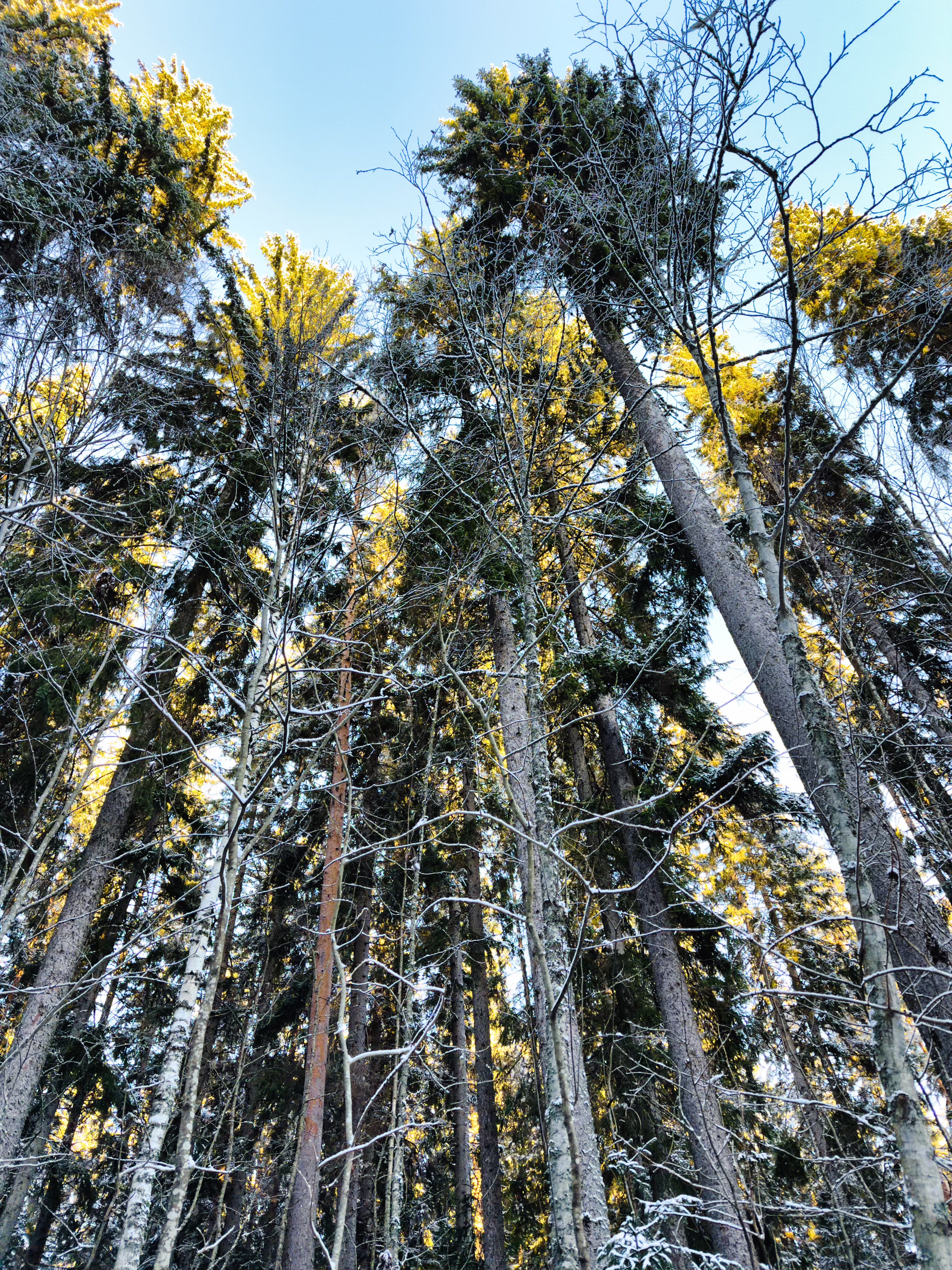 The contrast between the sunny tip and the dark, frosty forest was huge. The sun had melted the ground and the trees where its rays reached, but the areas untouched by sunlight remained completely frosty. Walking through that cold forest to reach the sunny point created a unique, almost magical atmosphere.