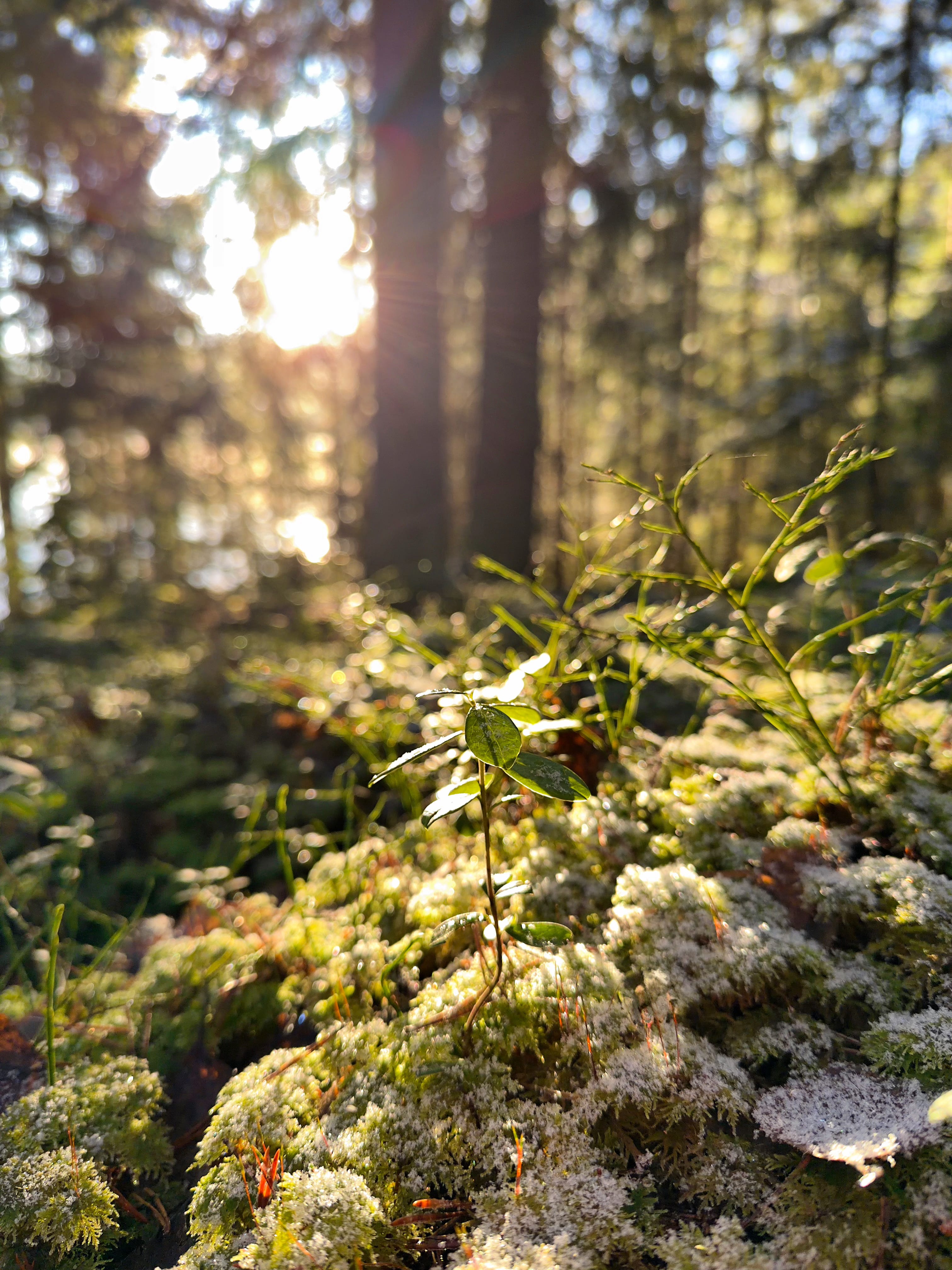 Old massive trees were standing majestic. Some trees had fallen in the storm and their roots were torn from forest soil. Forest floor was partly covered with dusty snow. The leaves of the blueberry plants have already fallen, but lingonberry keeps them over the winter. This lingonberry was standing on the top of this mossy hummock, and sun touched it so beautifully that it looked like the queen of this forest.