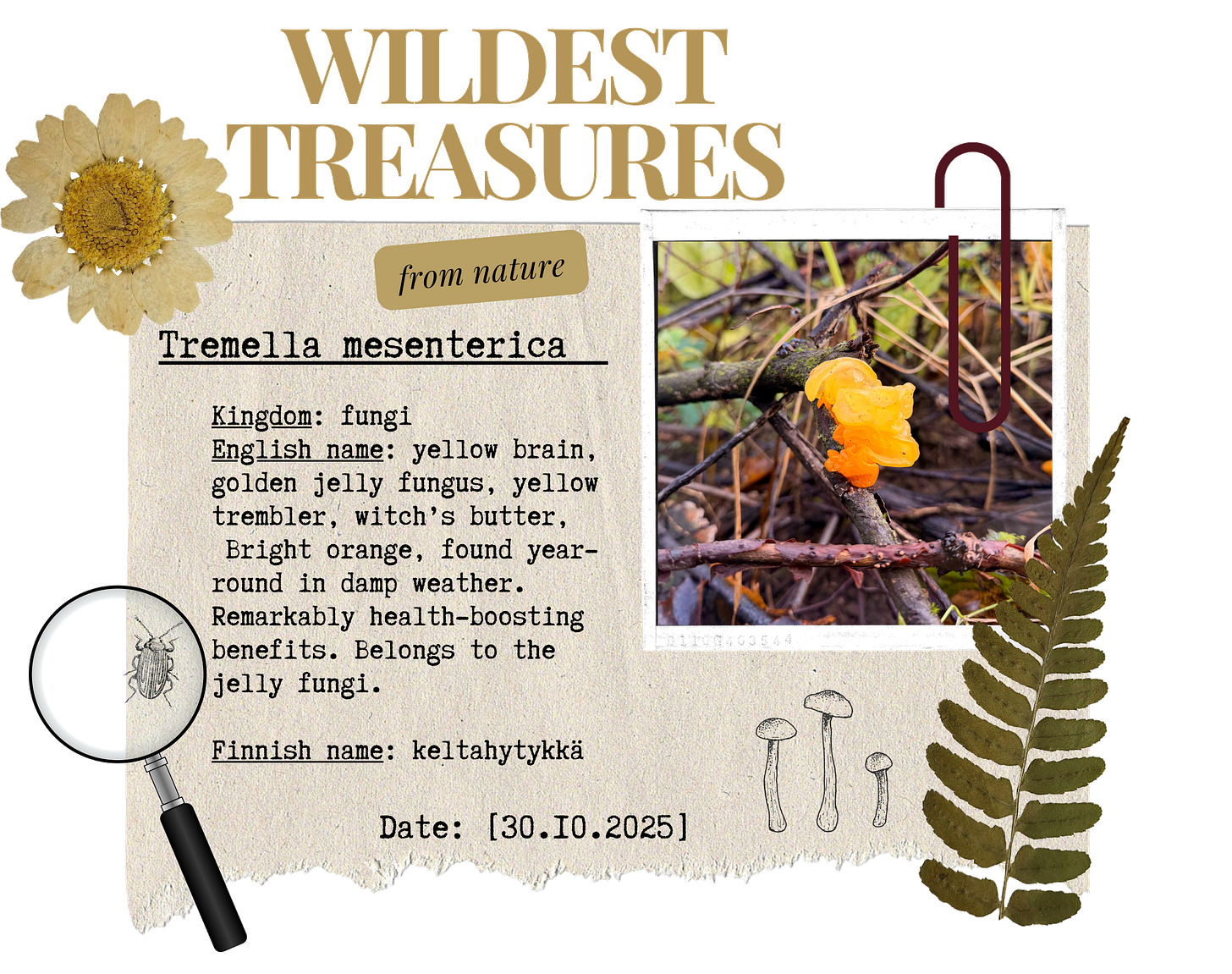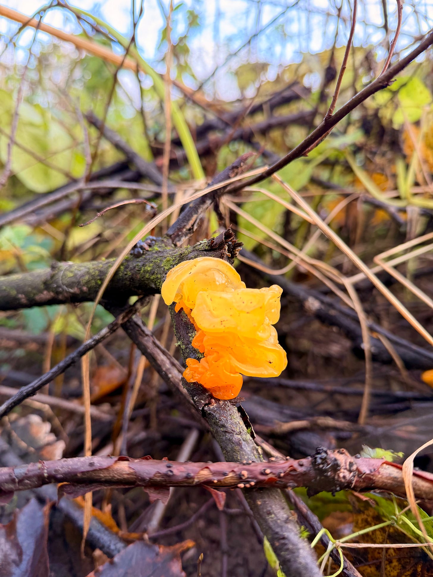 This fungus belongs to the jelly fungi group and grows on tree trunks, decaying the wood. It has a strikingly bright orange color and comes to life with the rain, drying and disappearing again when the weather turns dry. It can be found throughout the year, and you can often spot them shivering on branches even from beneath the snow.